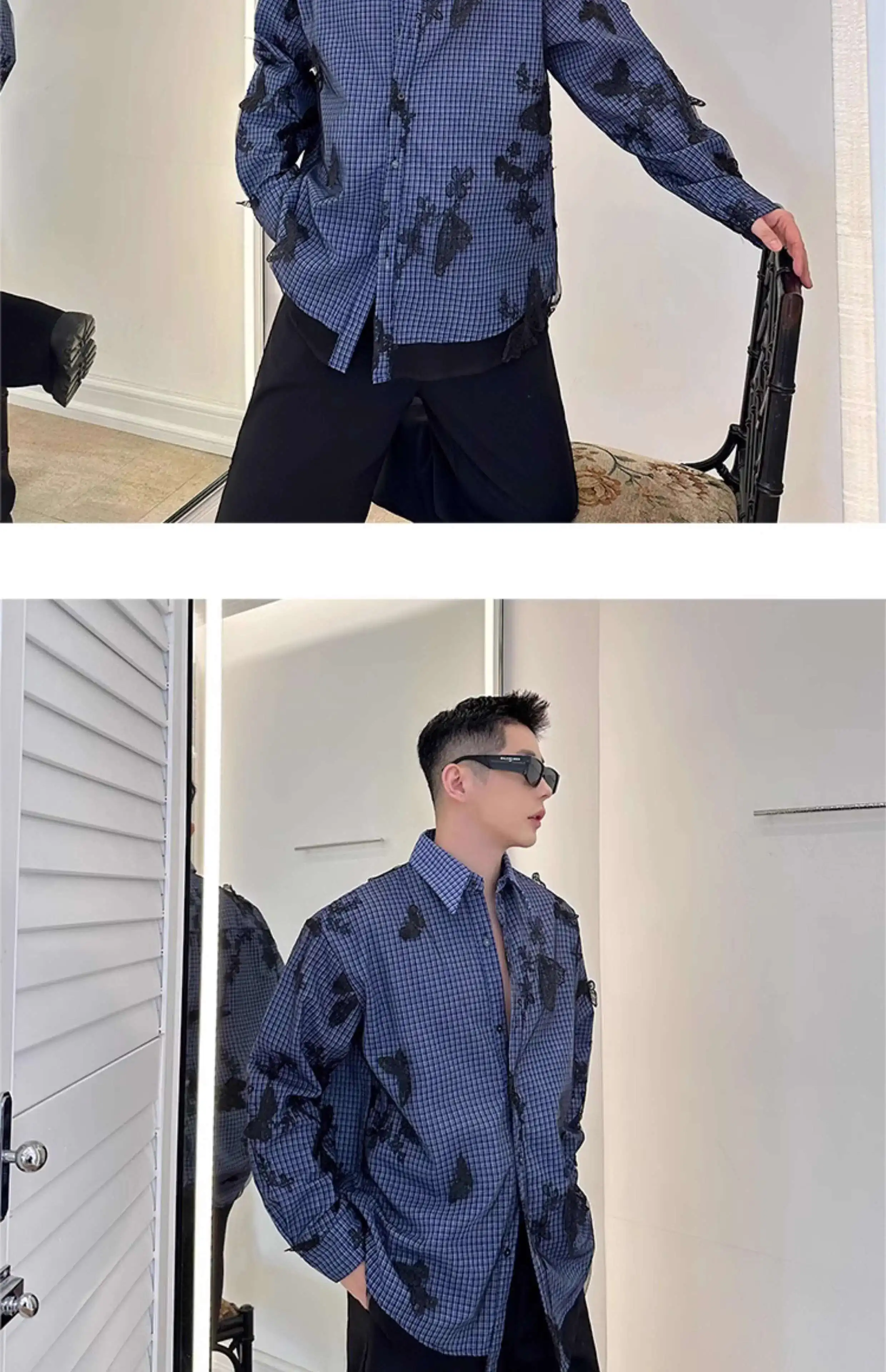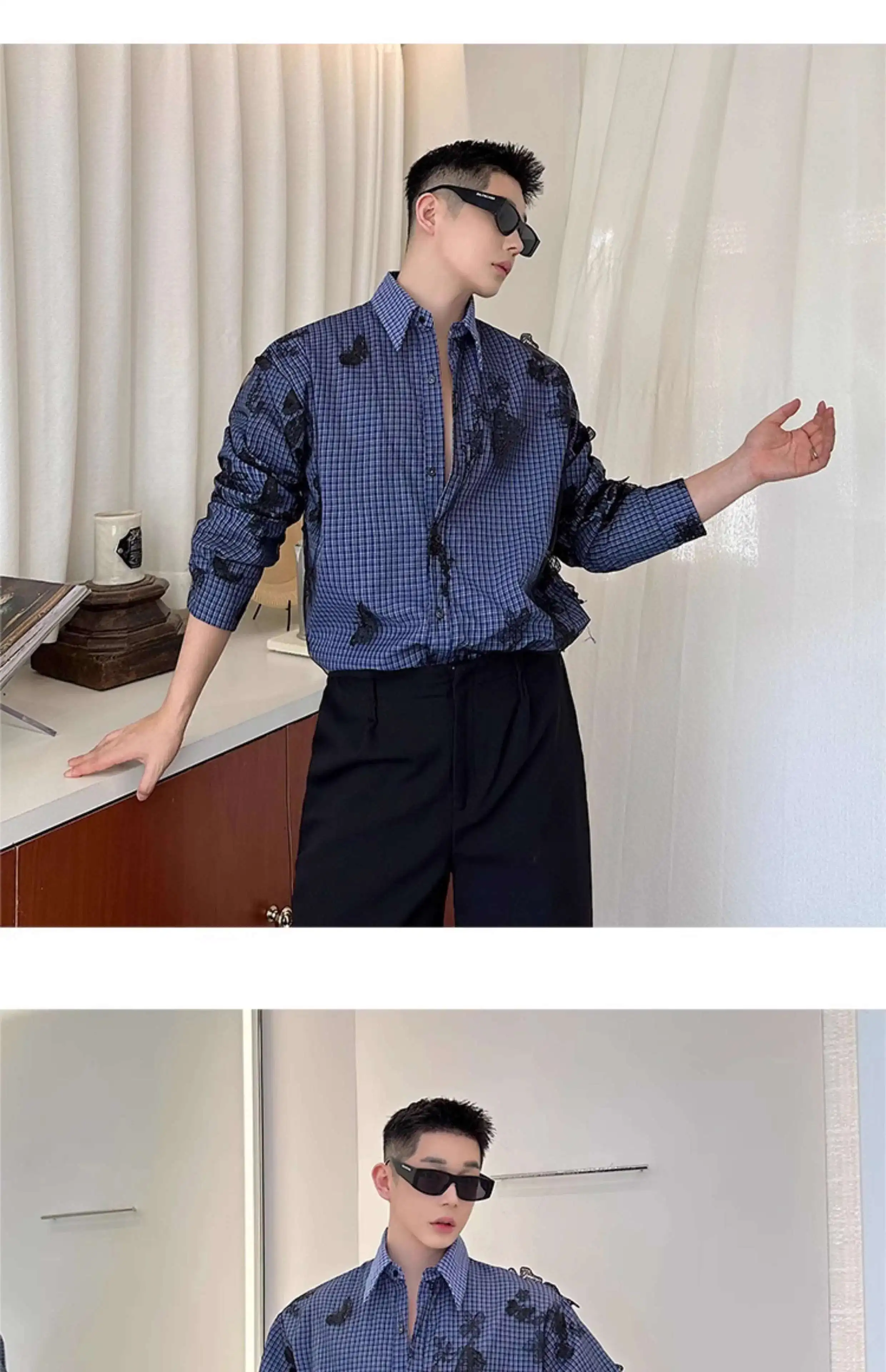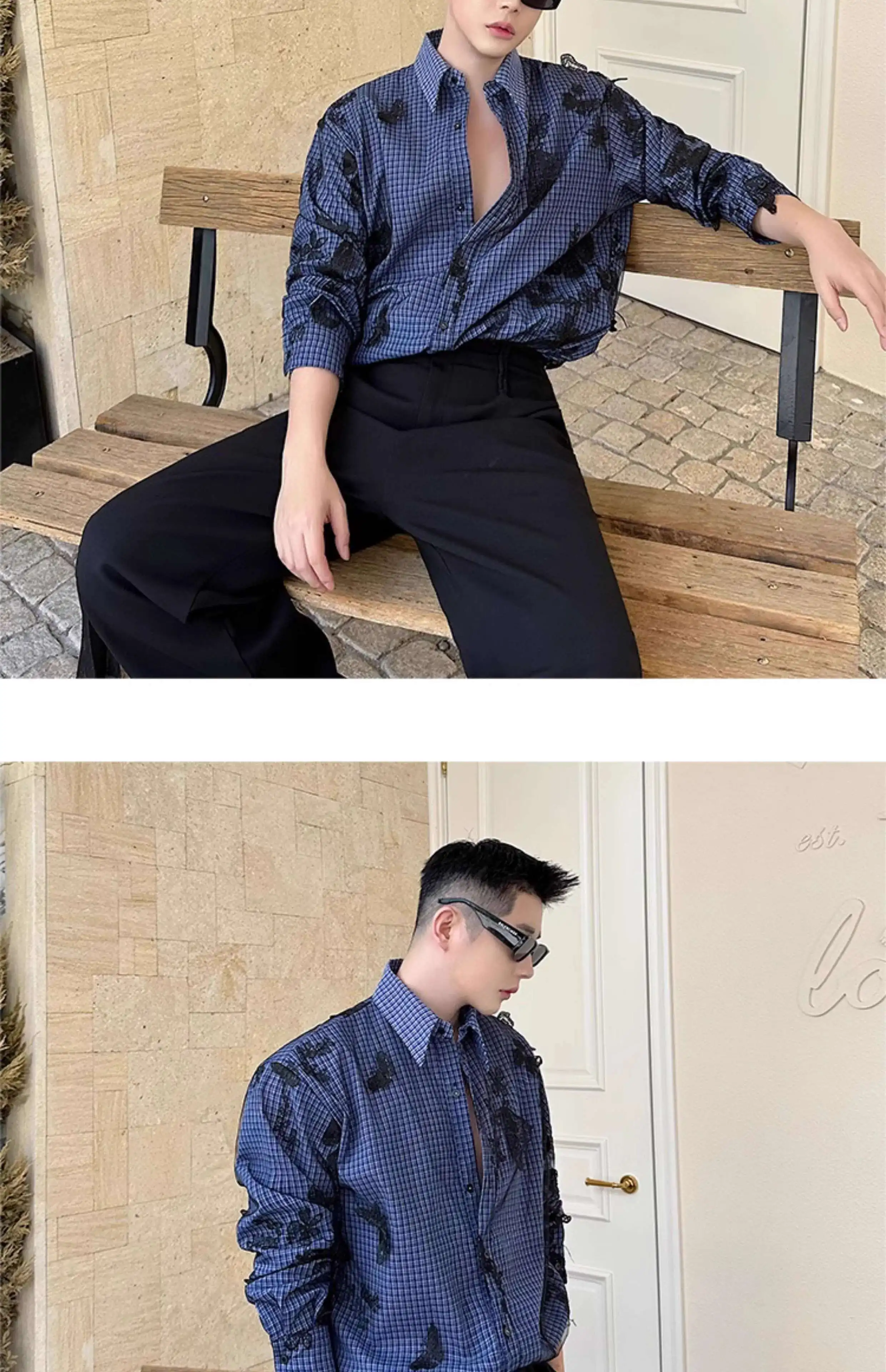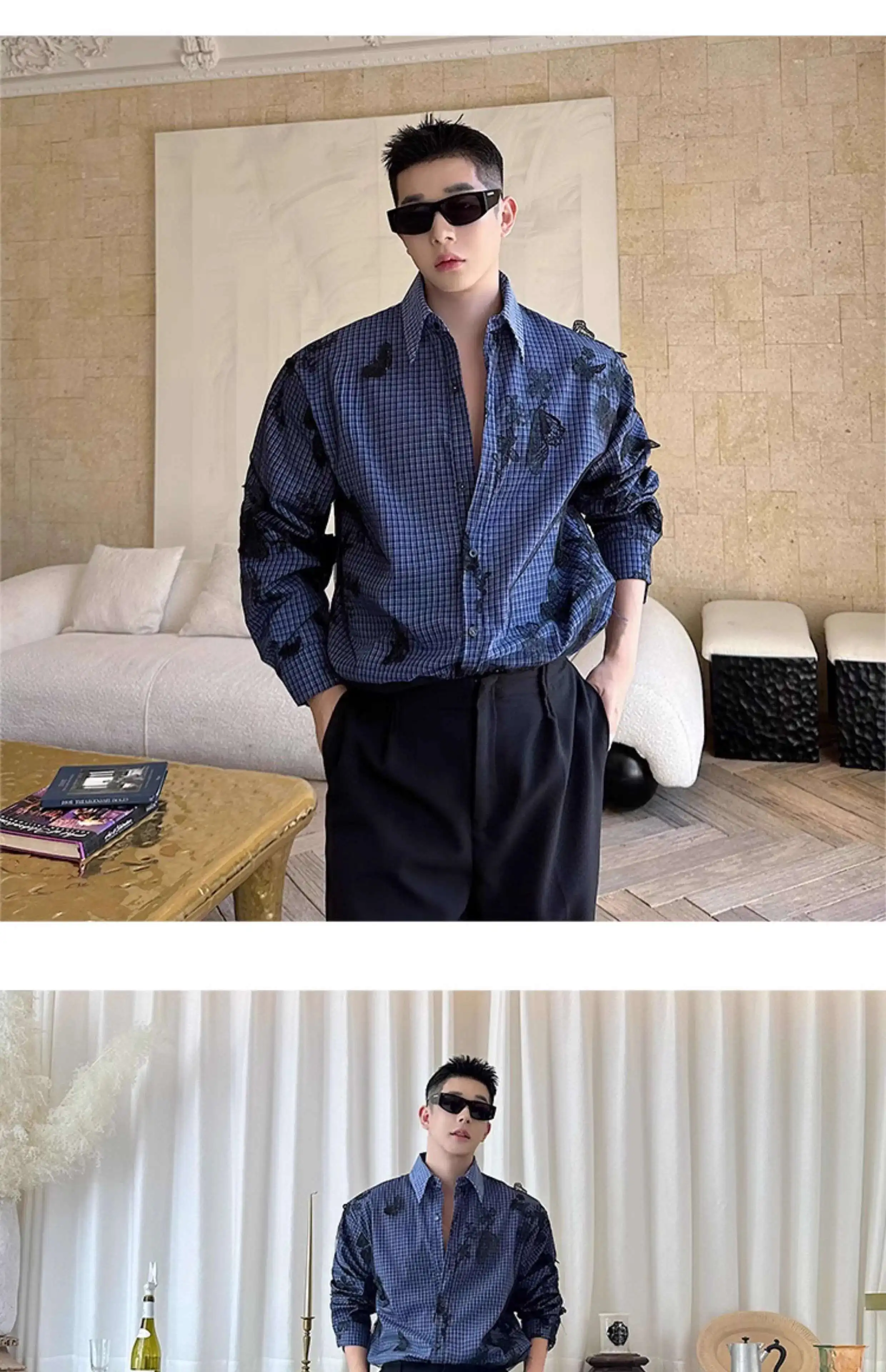 Men's Shirts Long Sleeve Two-piece Butterfly Mesh Design Threedimensional Butterfly Decoration Male Top Summer 9W1877