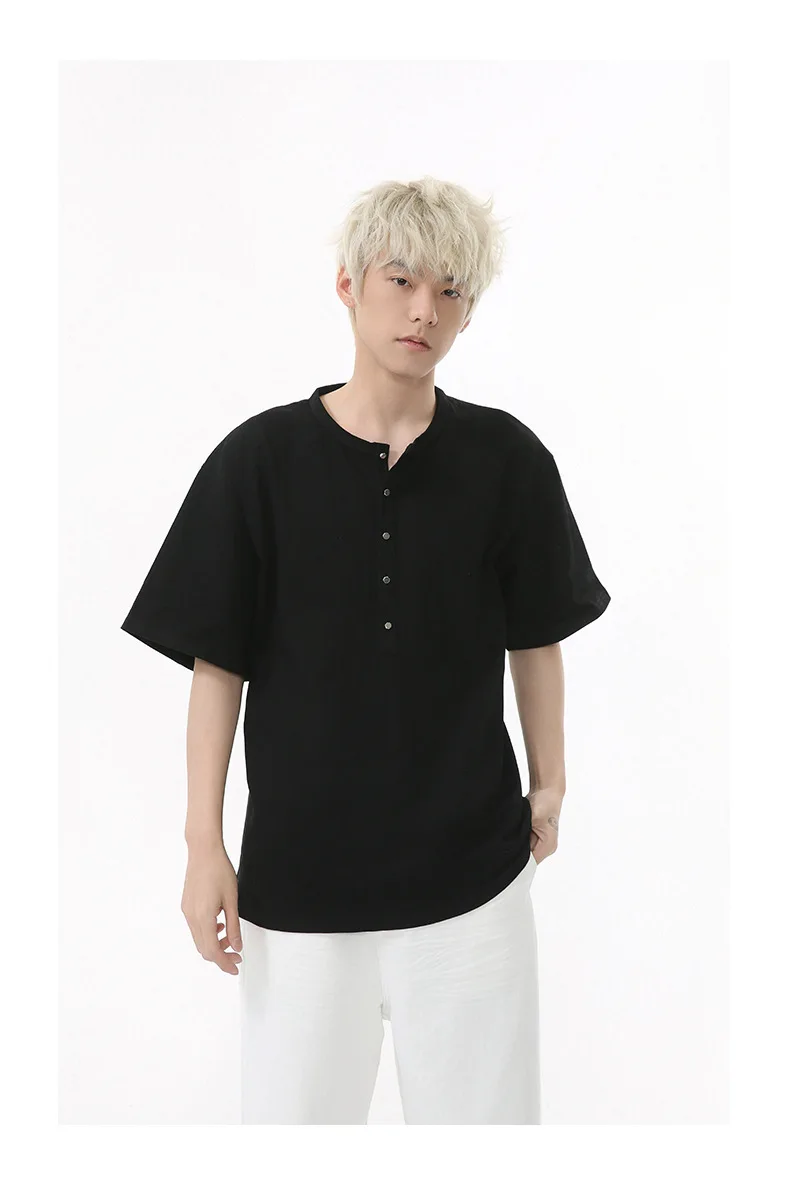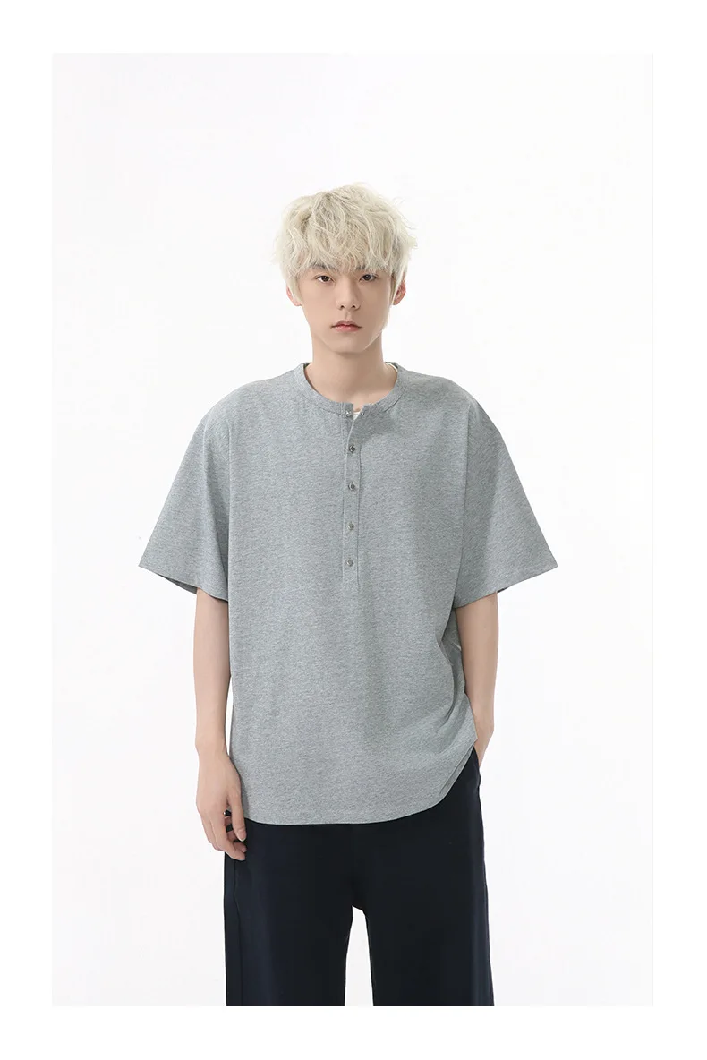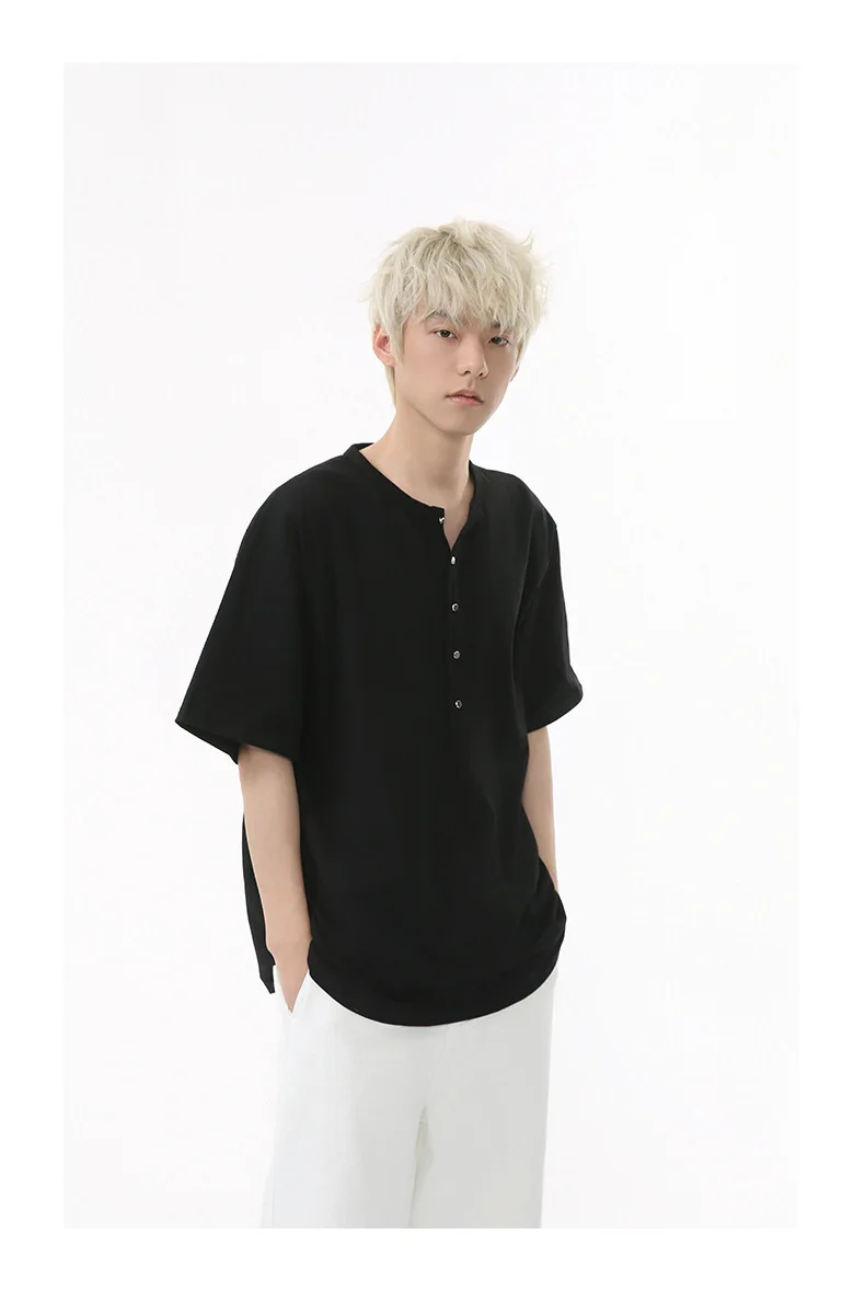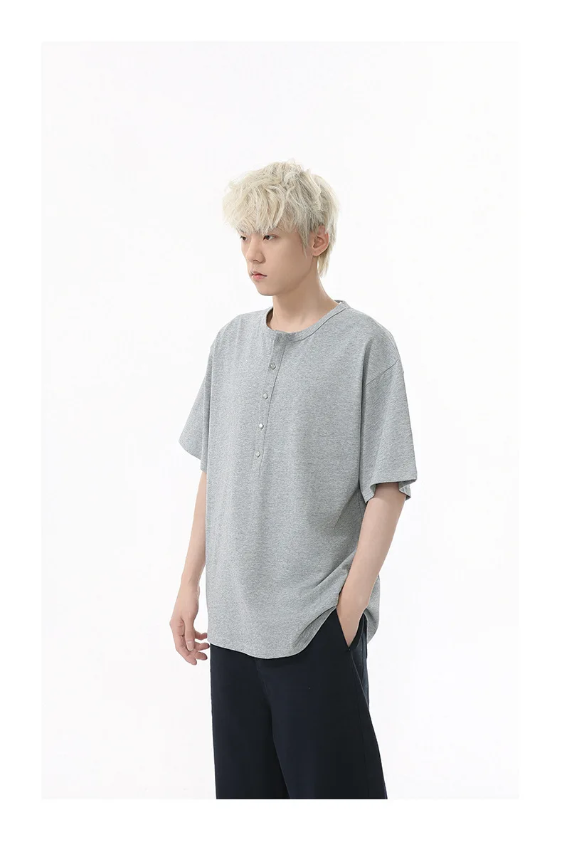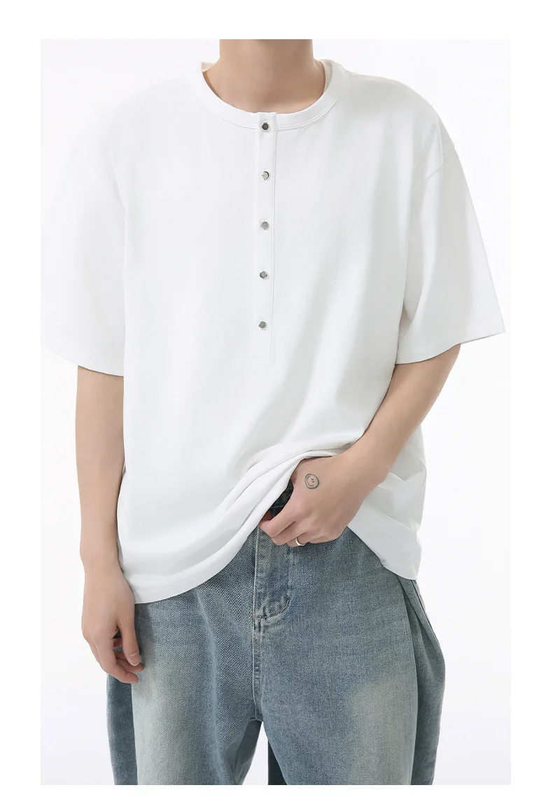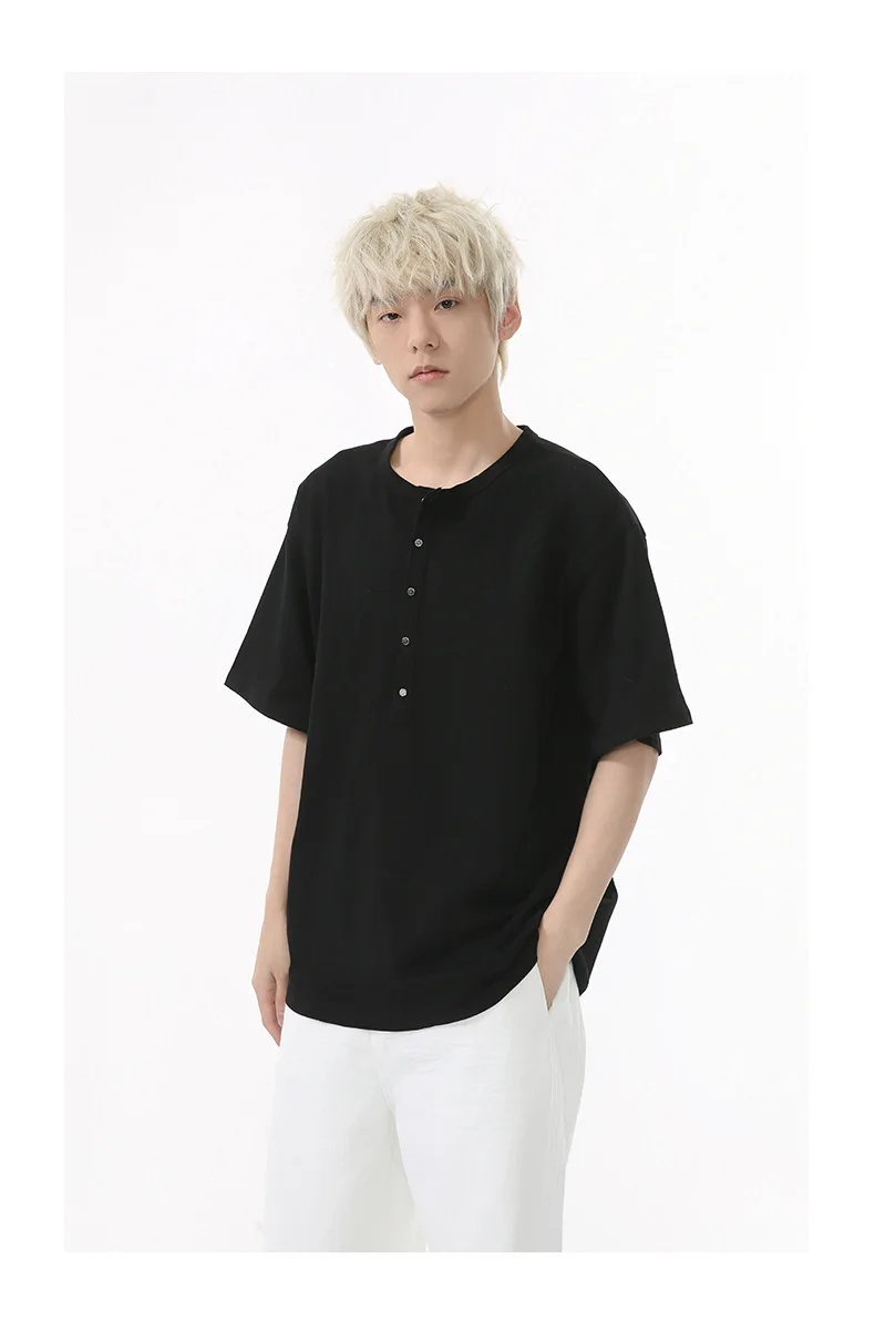 Men's Short Sleeve T-shirts New Summer Solid Color Casual Style Button Half Open Design Round Collar Loose Male Top 9W1600