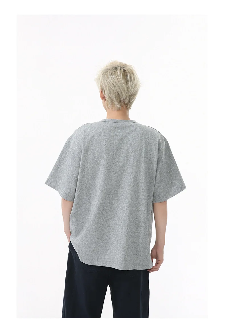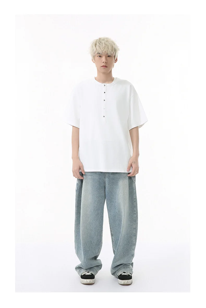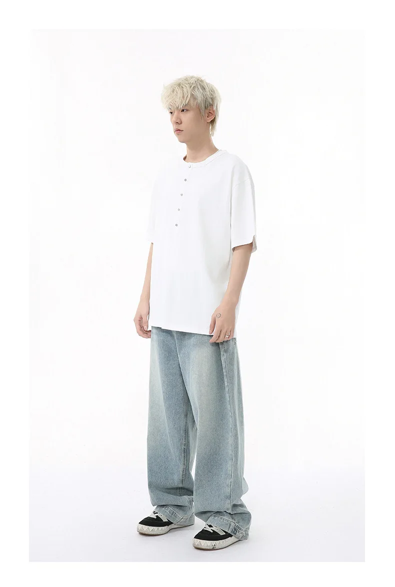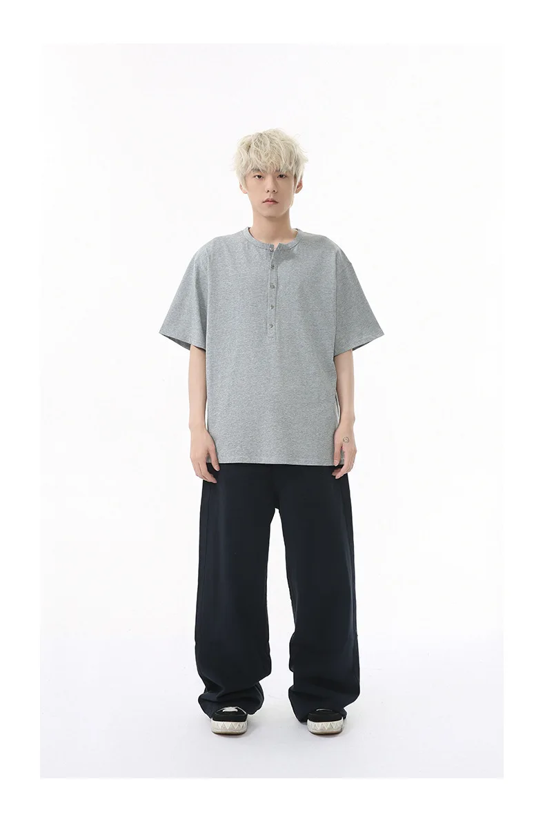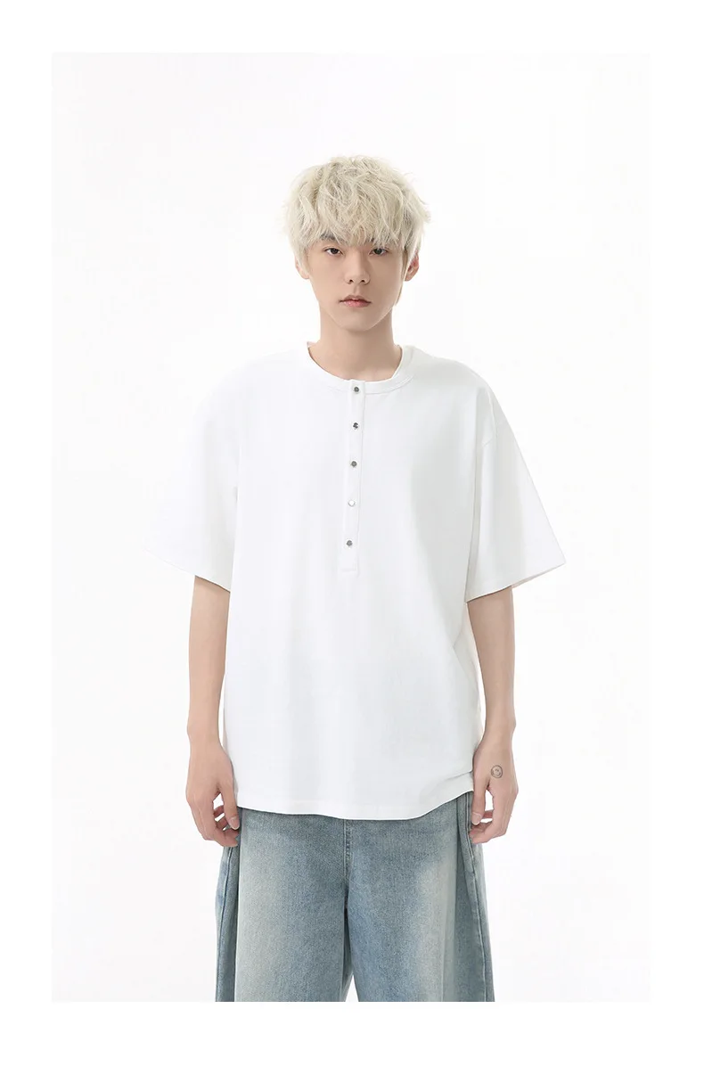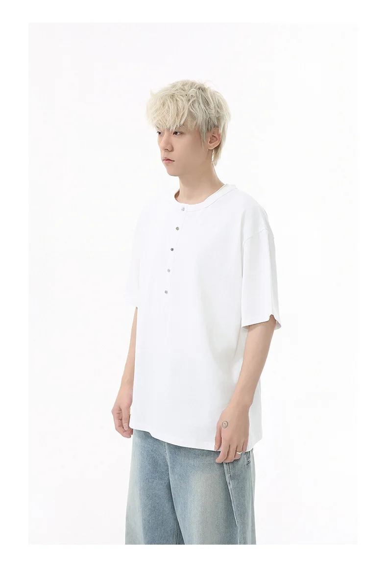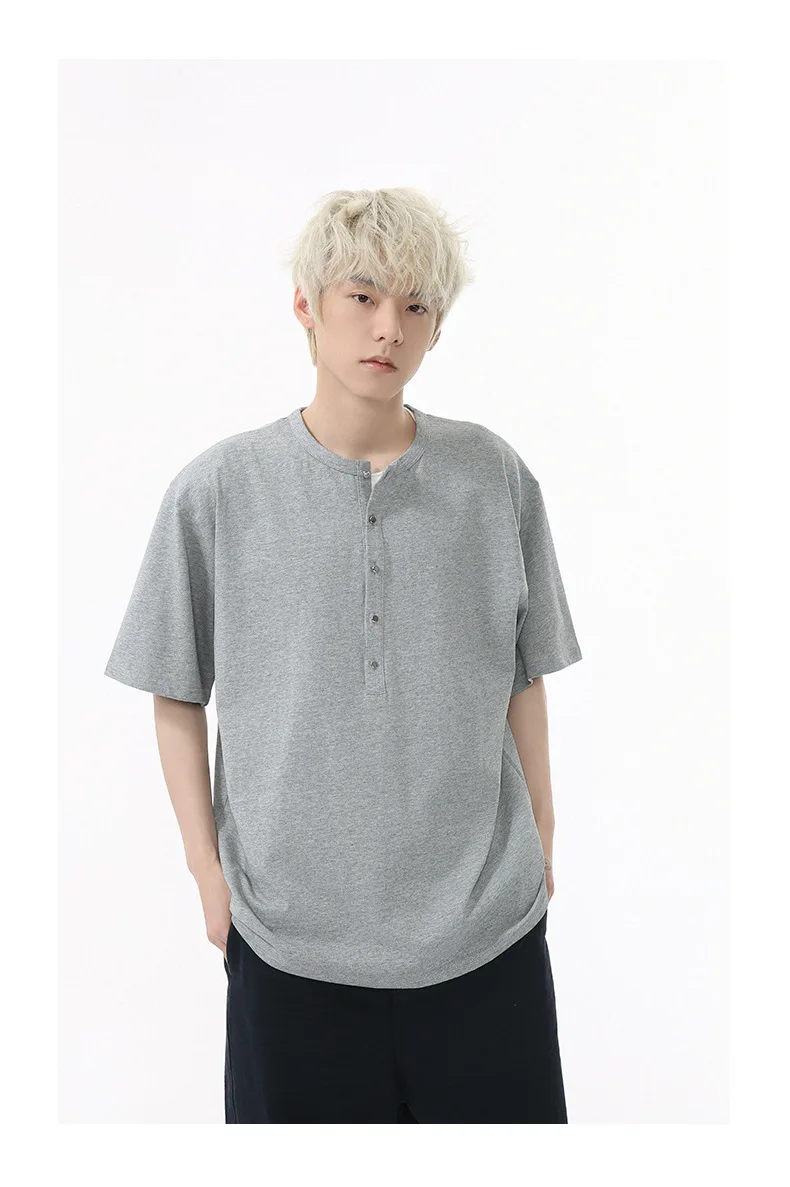 Men's Short Sleeve T-shirts New Summer Solid Color Casual Style Button Half Open Design Round Collar Loose Male Top 9W1600