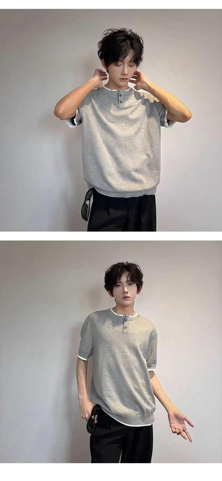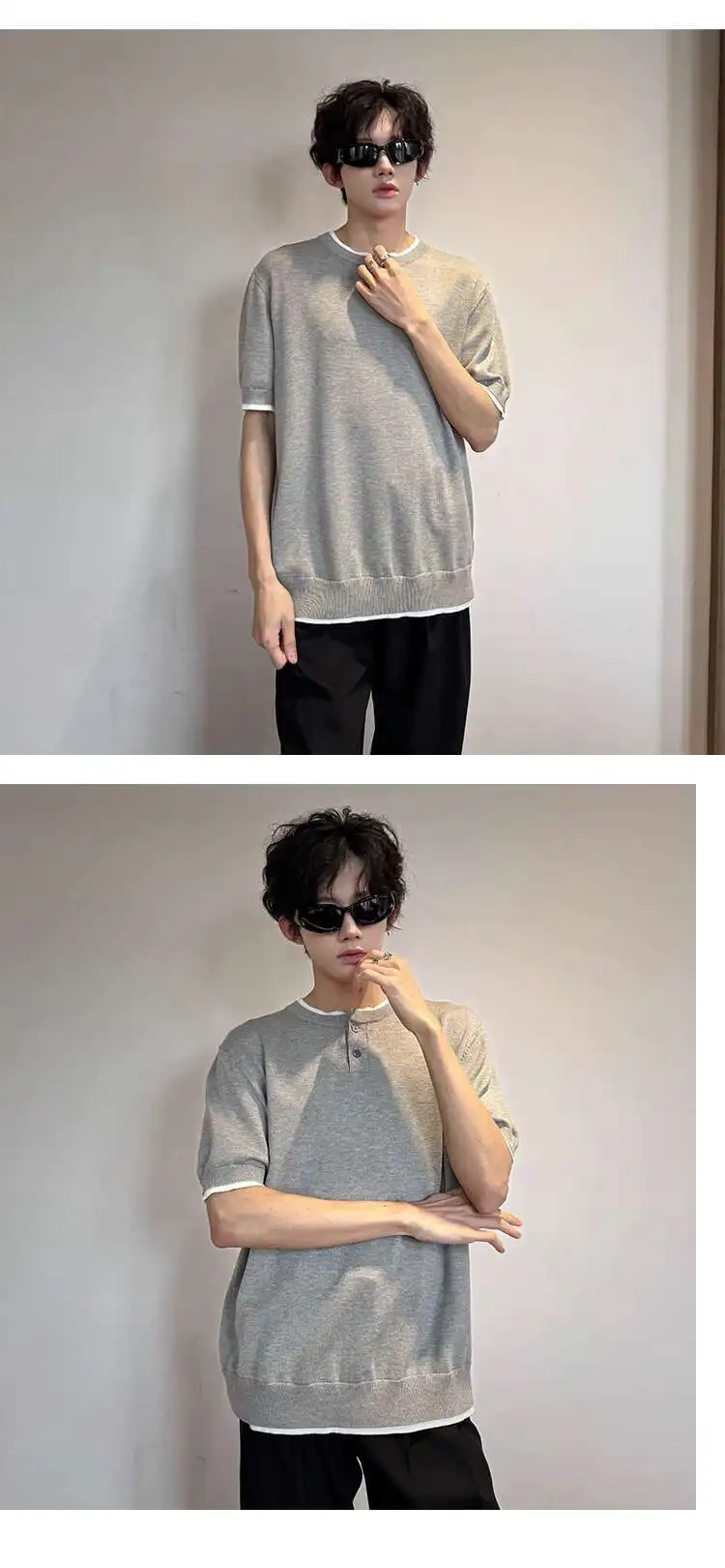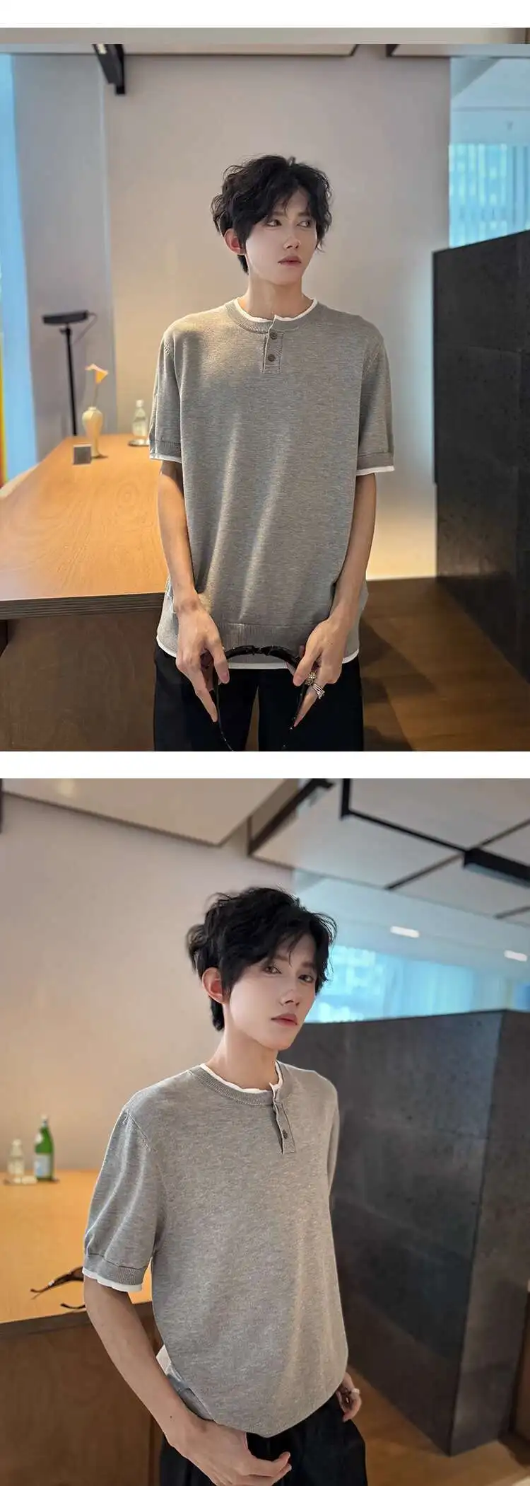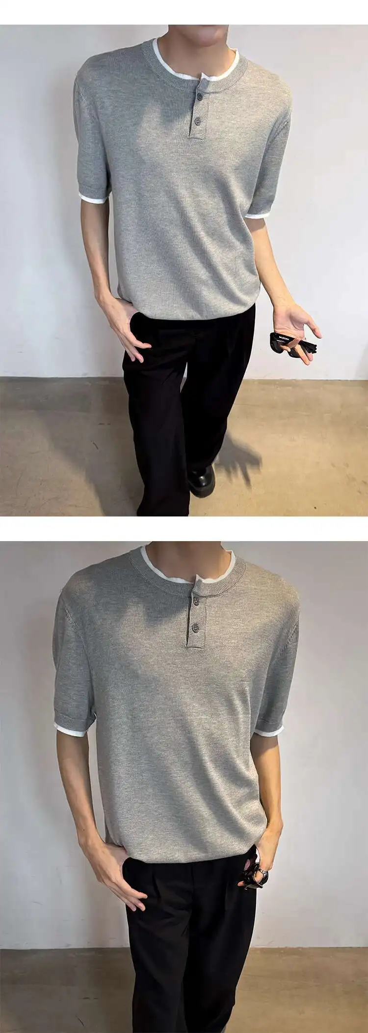 Men's T-shirts Short Sleeve Round Collar Fake Two-piece Spliced Button Knit Design Ice Male Pullover Clothing 9W1749