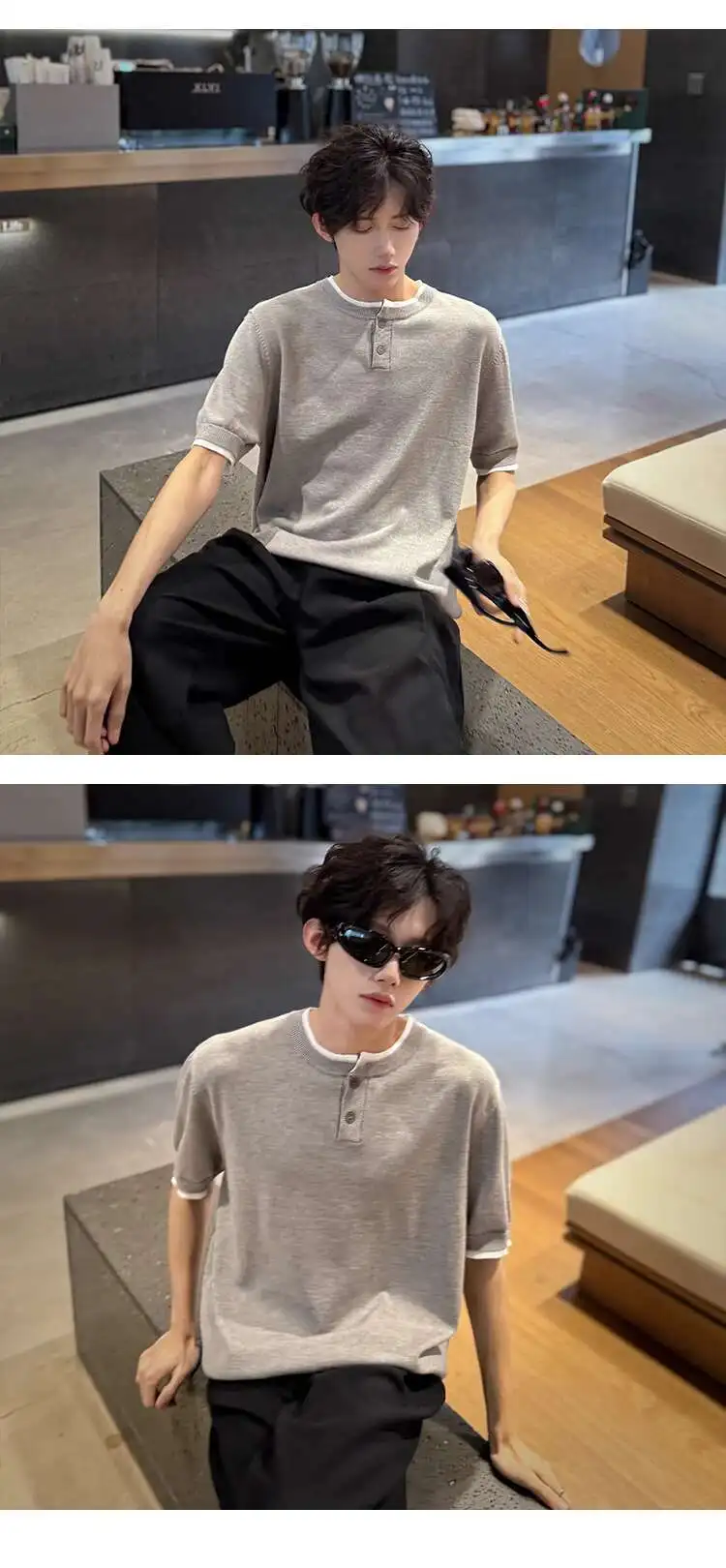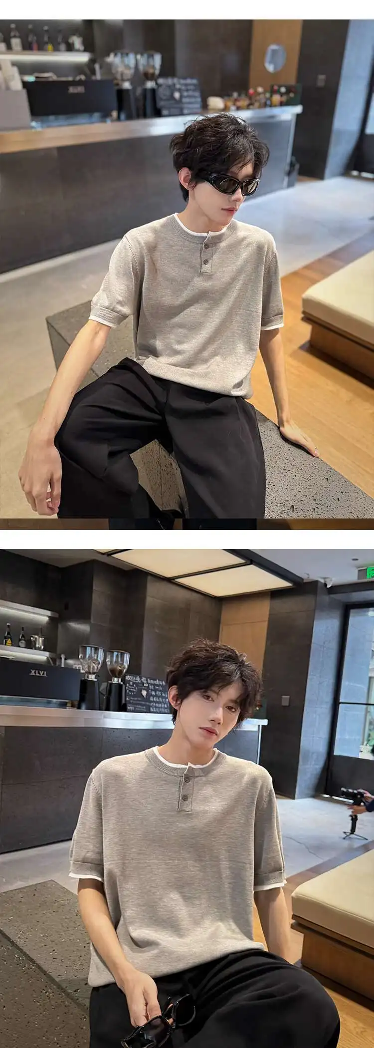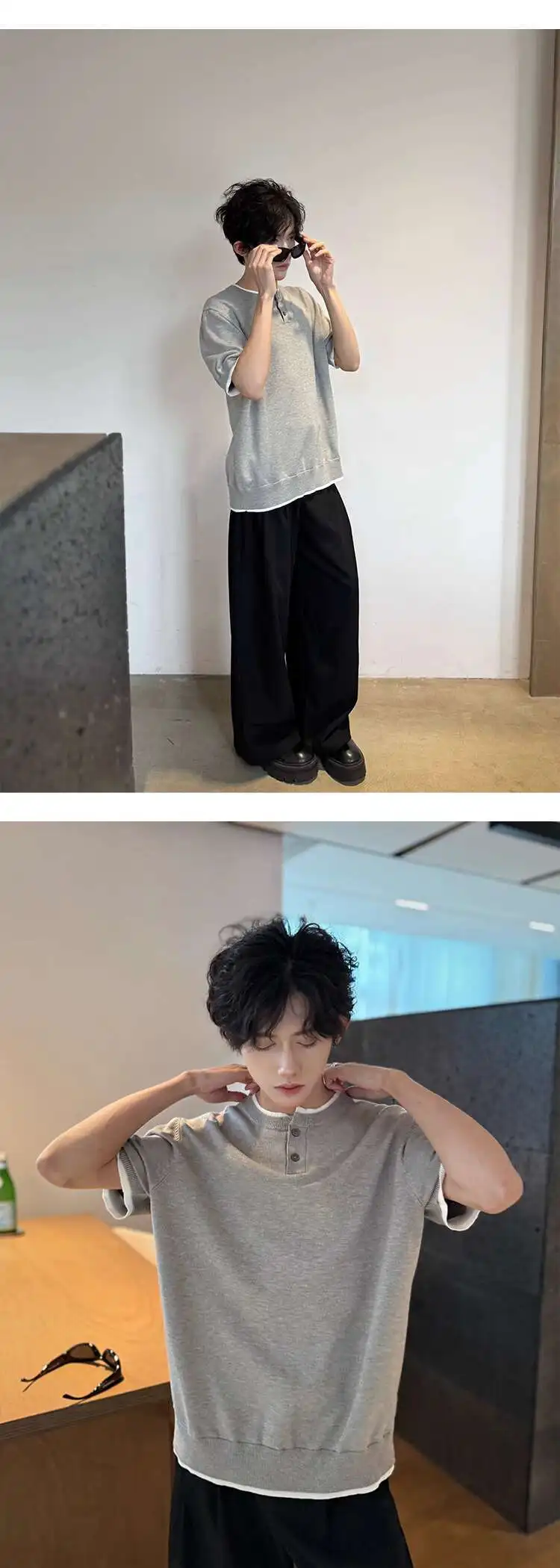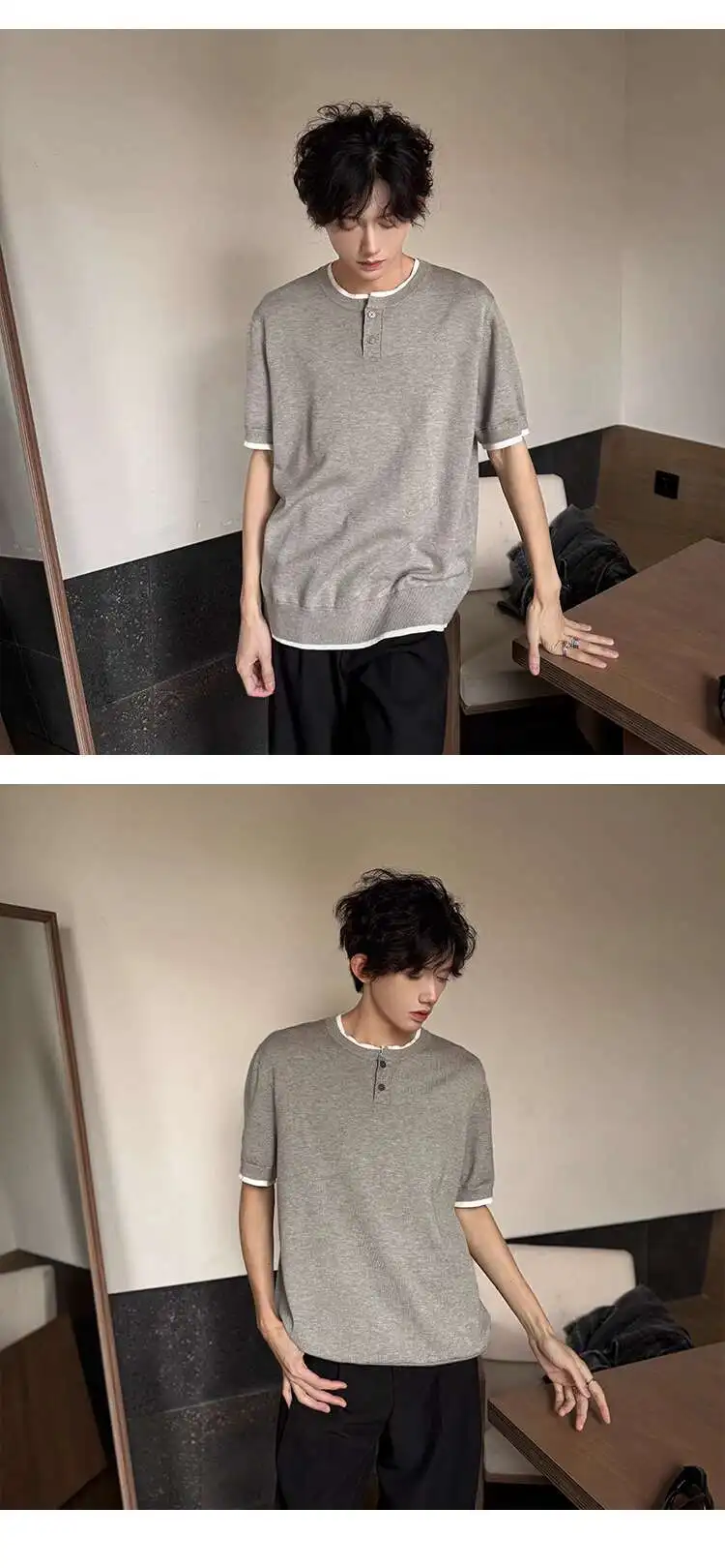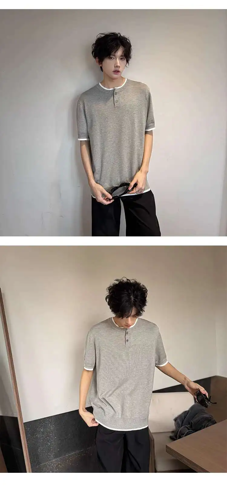 Men's T-shirts Short Sleeve Round Collar Fake Two-piece Spliced Button Knit Design Ice Male Pullover Clothing 9W1749
