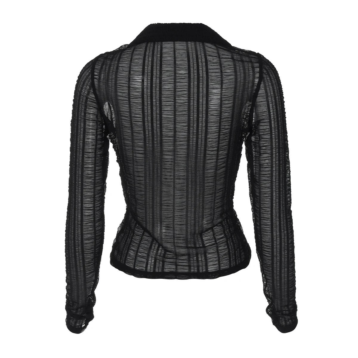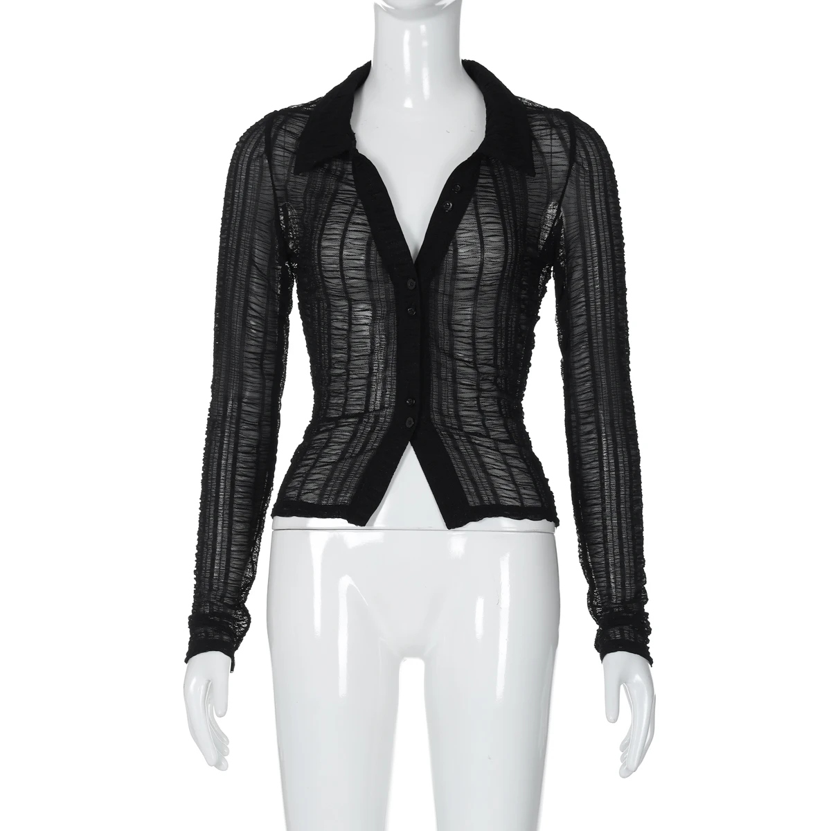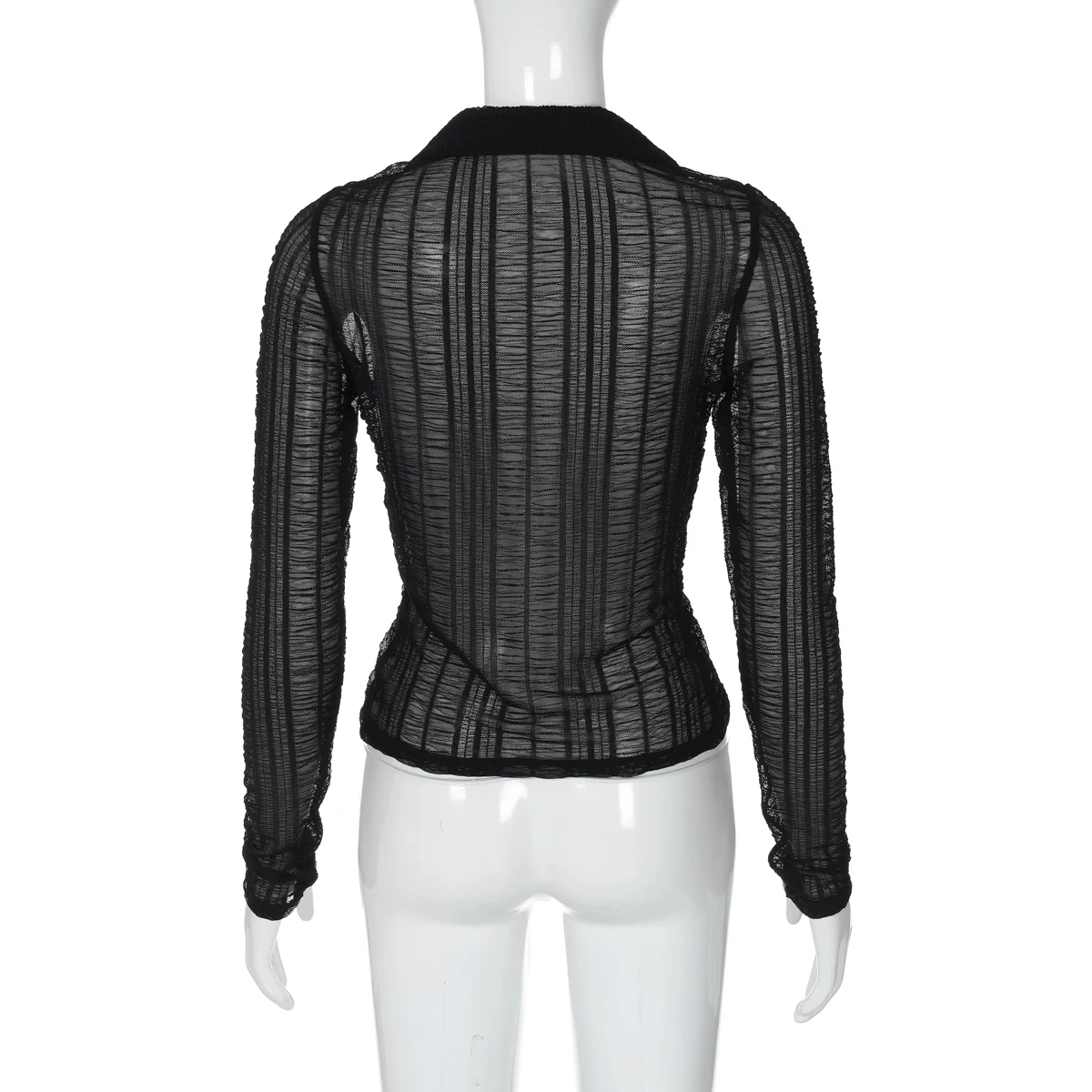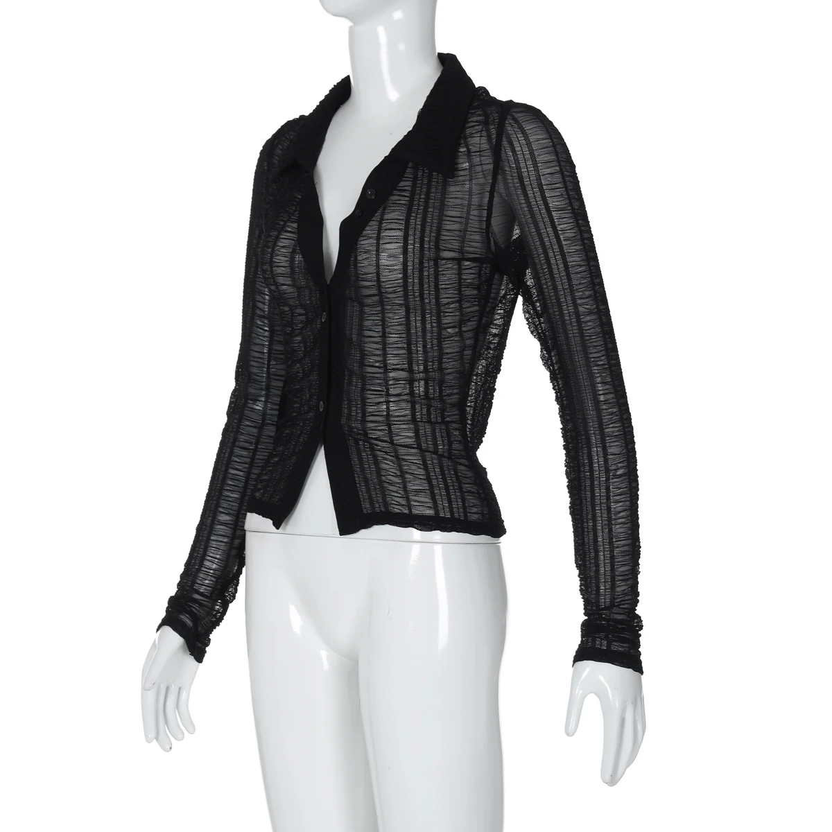 Mesh Black Turndown Collar Long Sleeve Buttons Sexy See Through Crop T-Shirt Top Fall Women Outfits Festival Nightclub