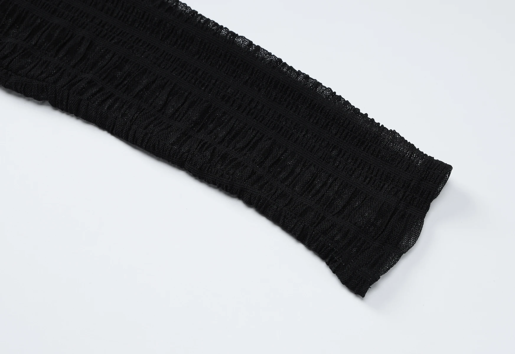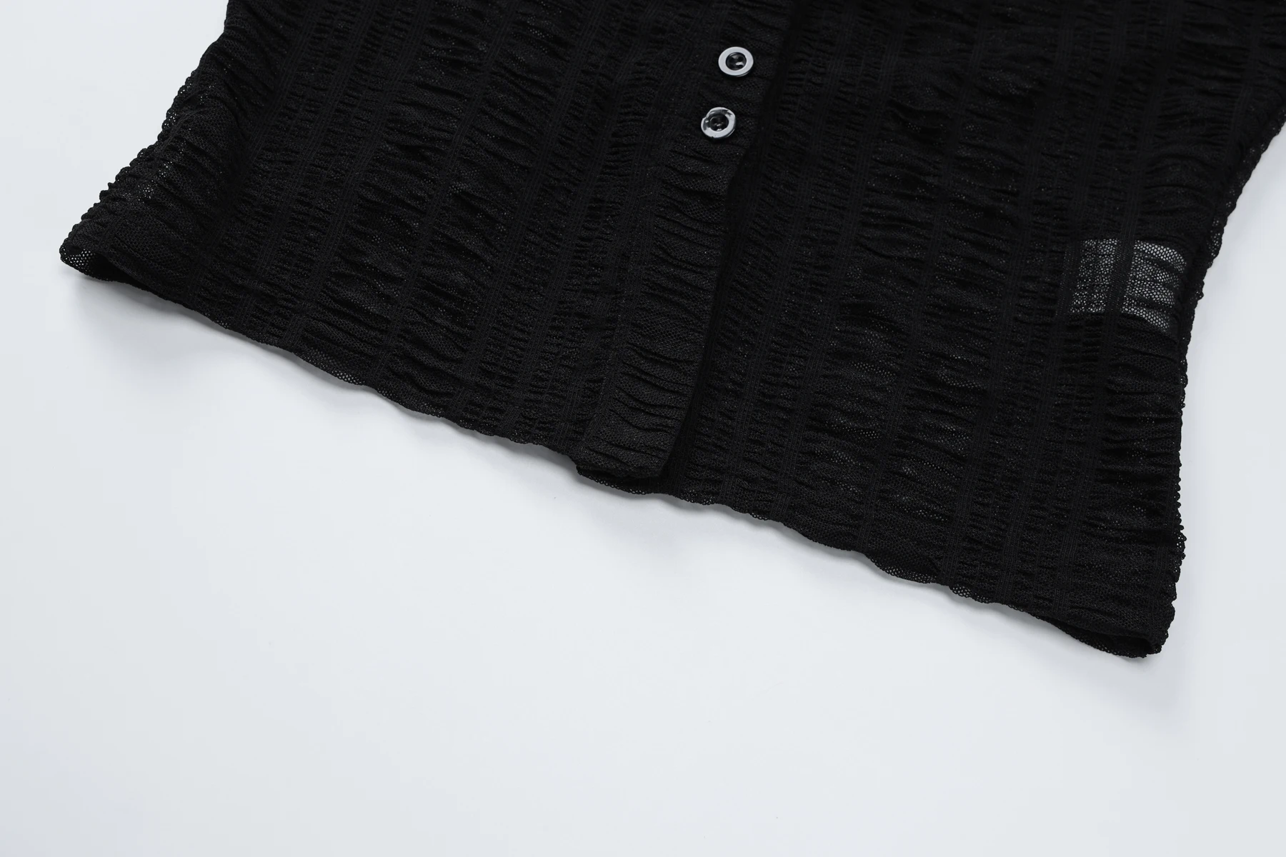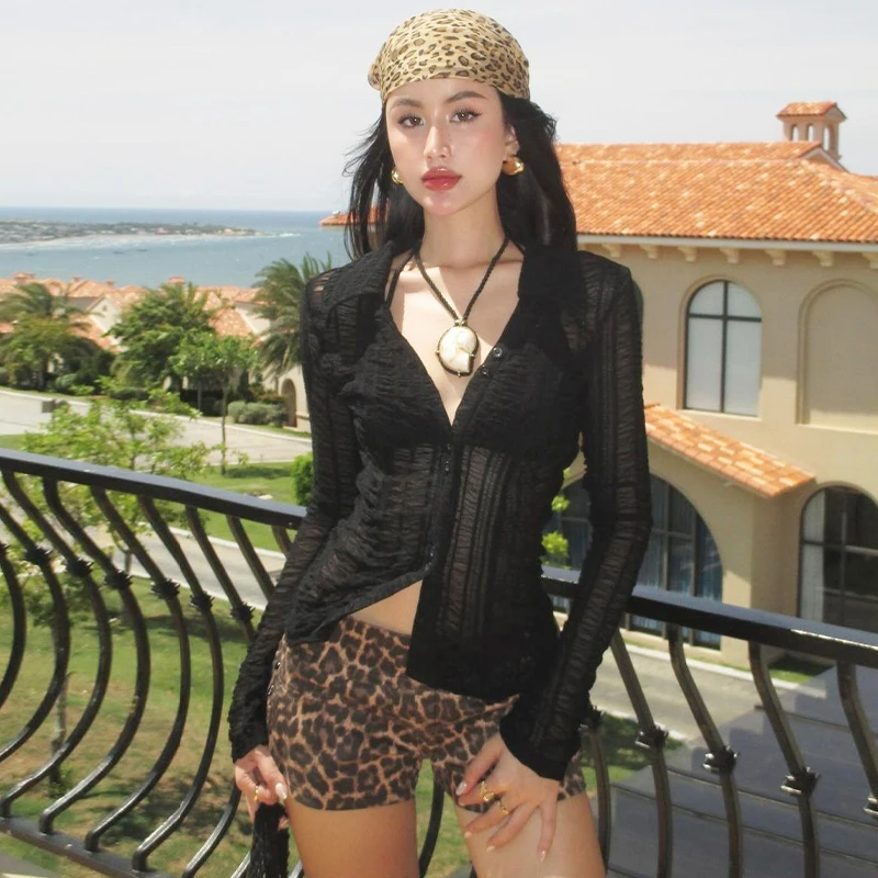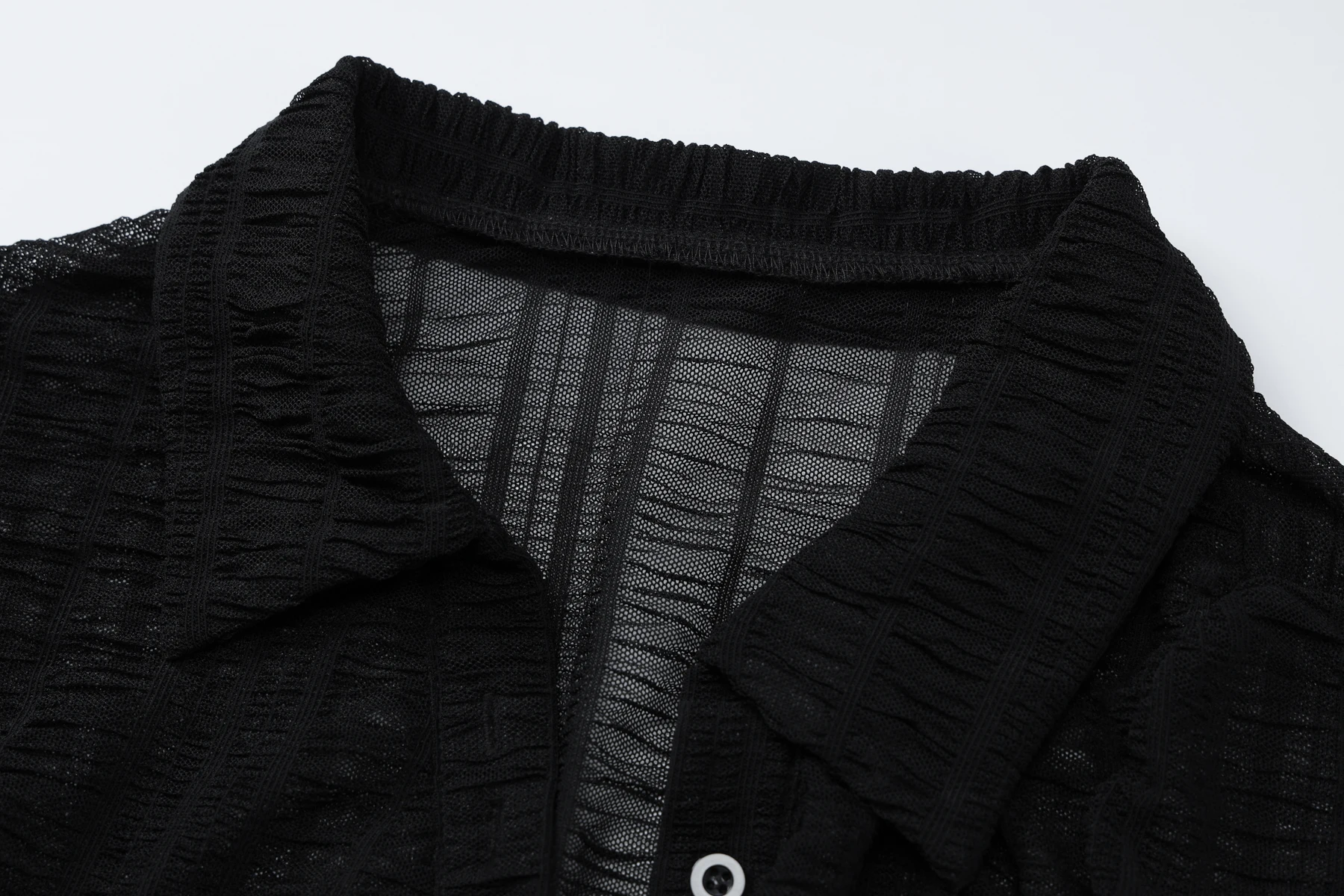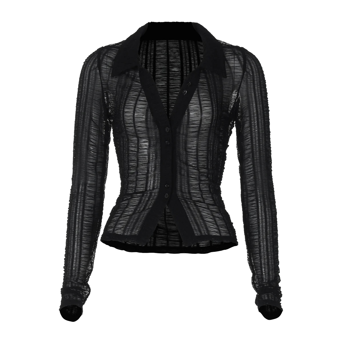 Mesh Black Turndown Collar Long Sleeve Buttons Sexy See Through Crop T-Shirt Top Fall Women Outfits Festival Nightclub
