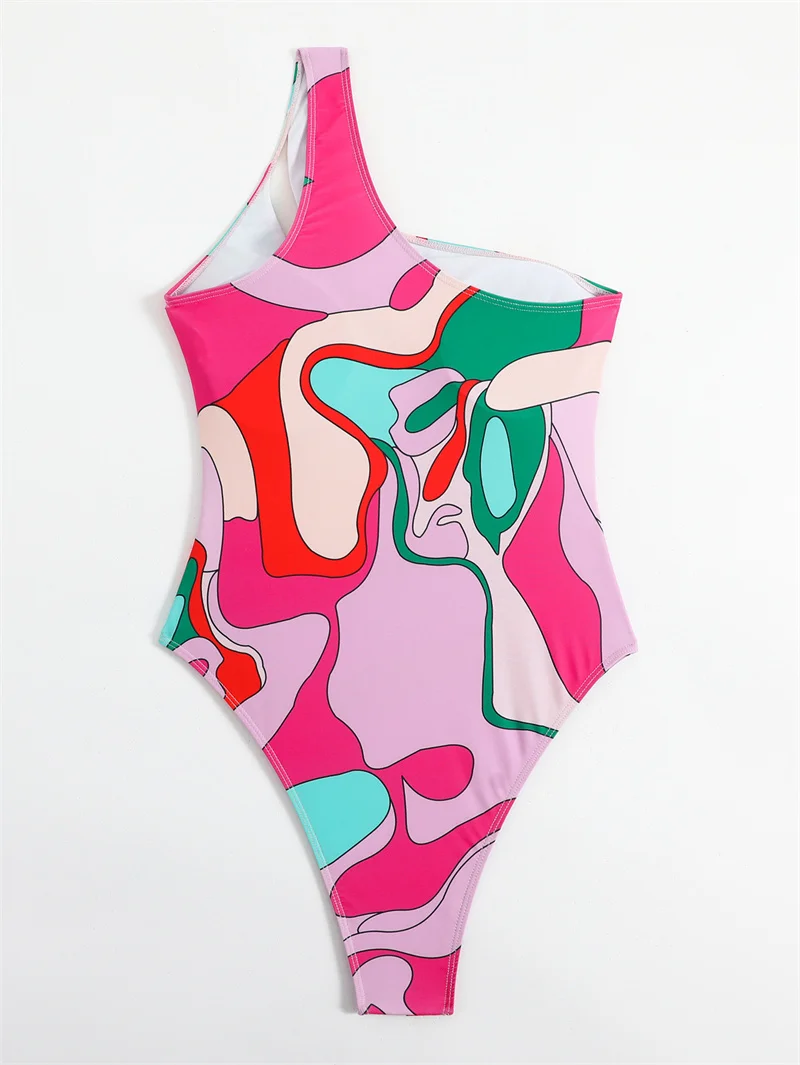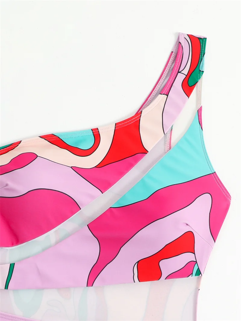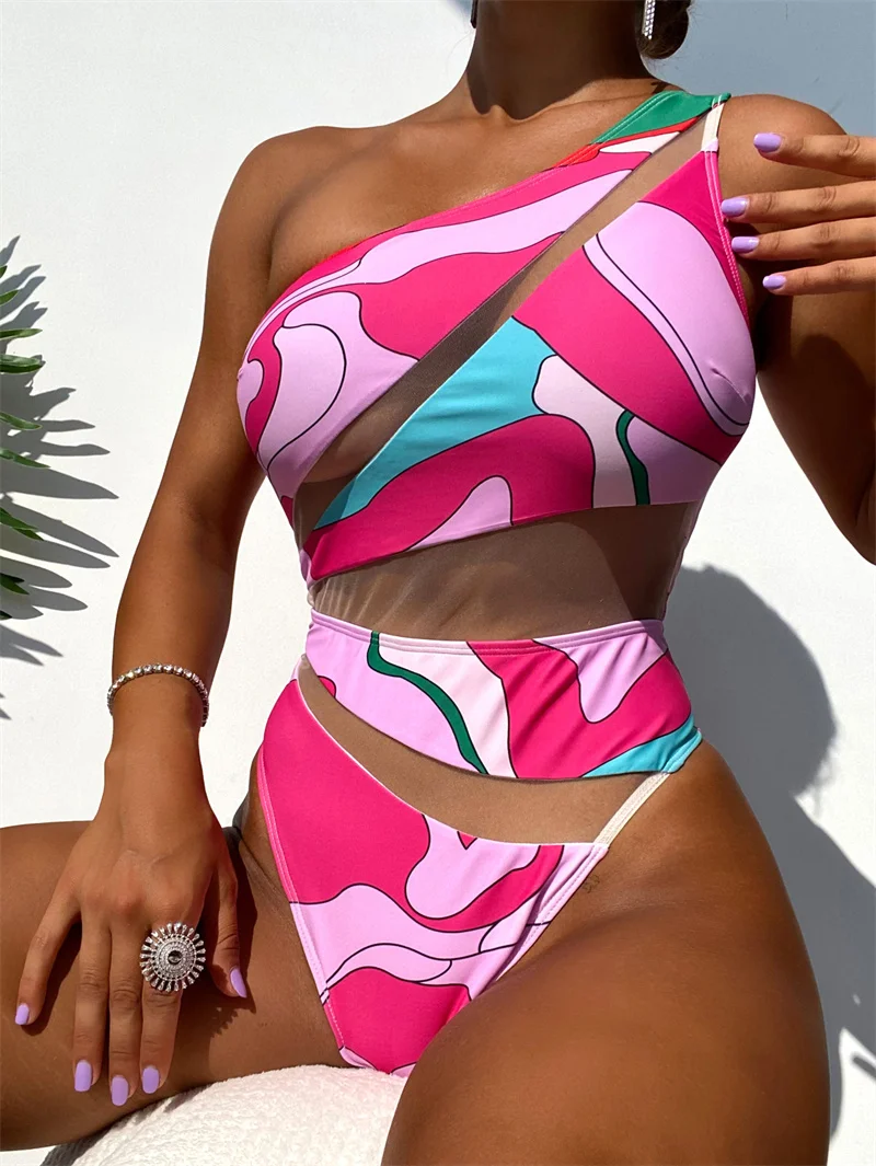 Mesh One Shoulder One Piece Swimsuit Bandeau Swimwear for Women Sexy Bathing Suit High Waist Monokini Bodysuit
