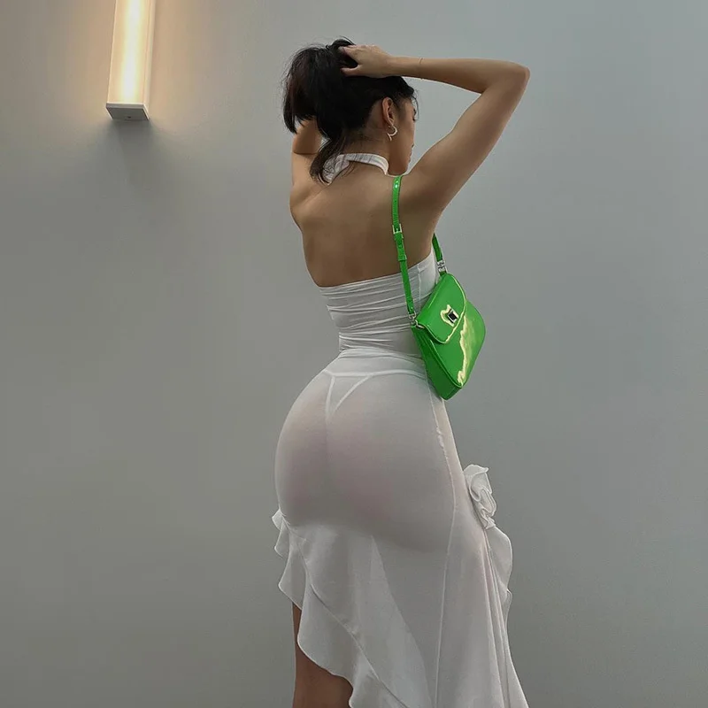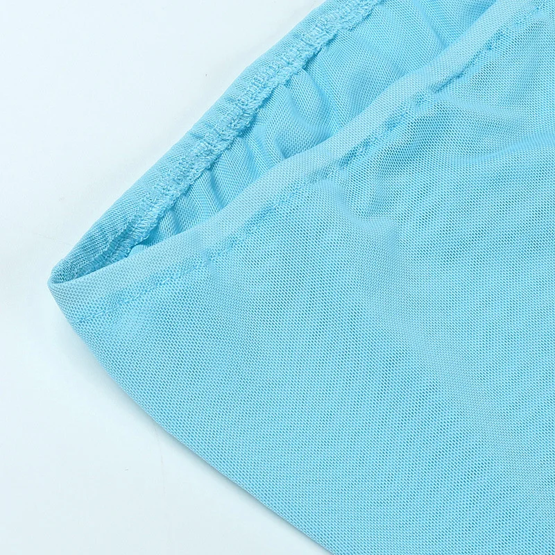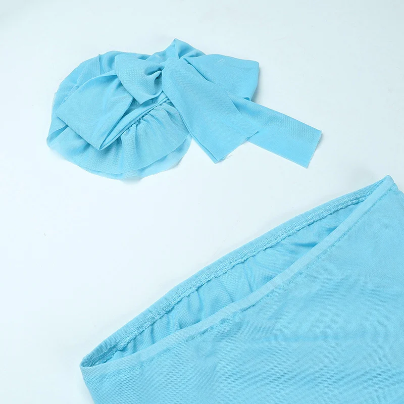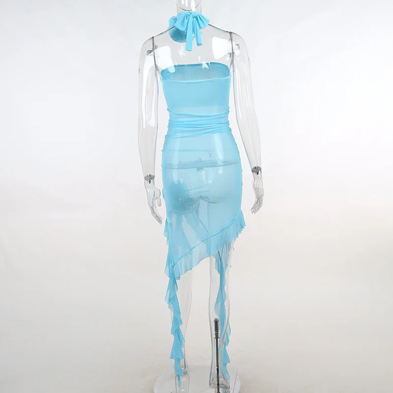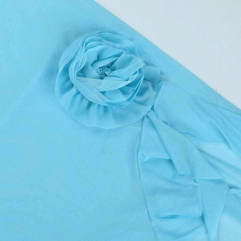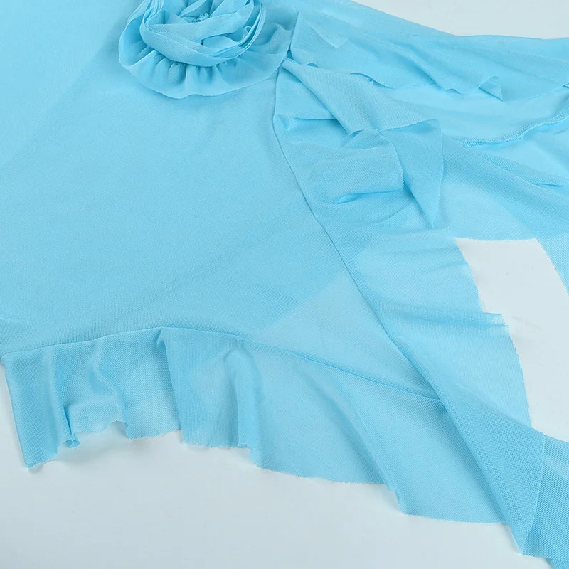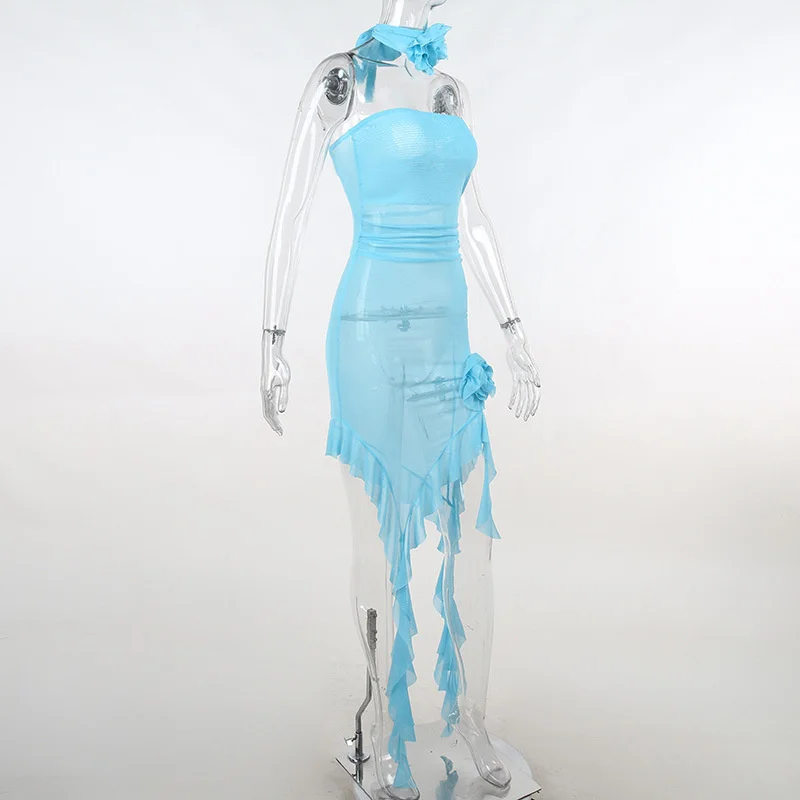 Mesh See Through RUFFLES Flower Strapless Mini Dress Women Patchwork Asymmetrical Elegant Dress Sexy Holiday Partywear