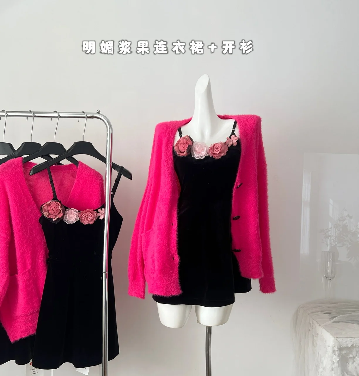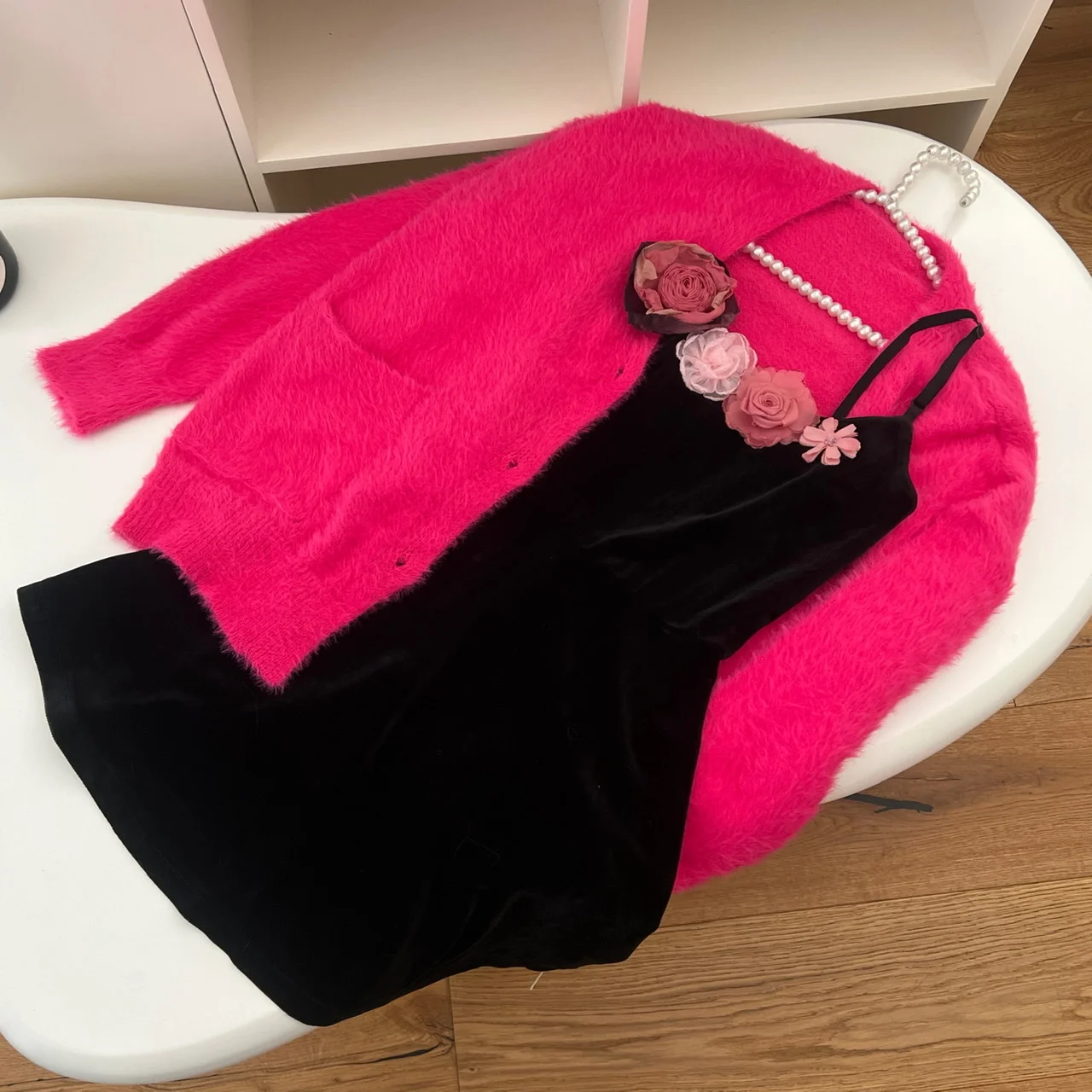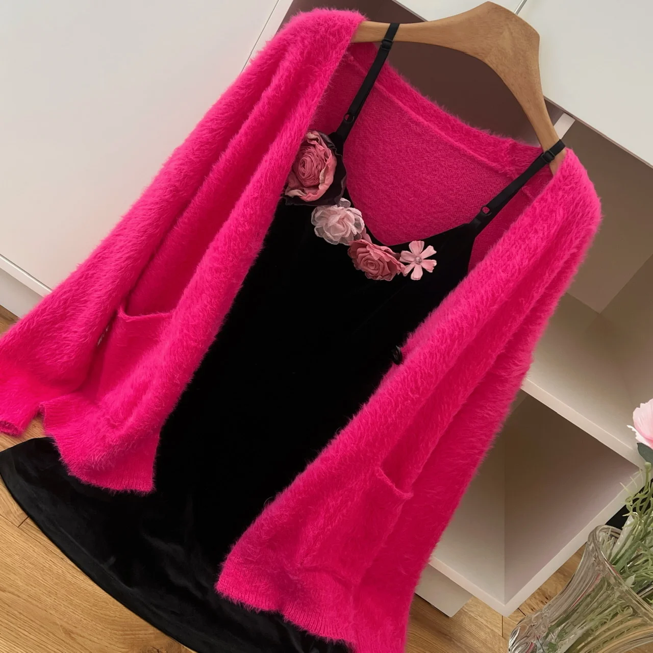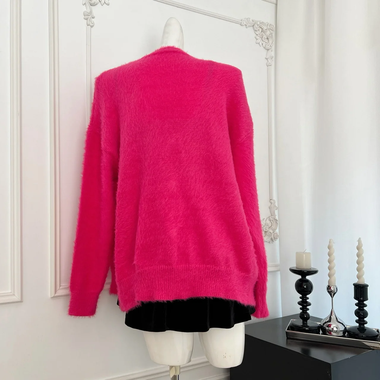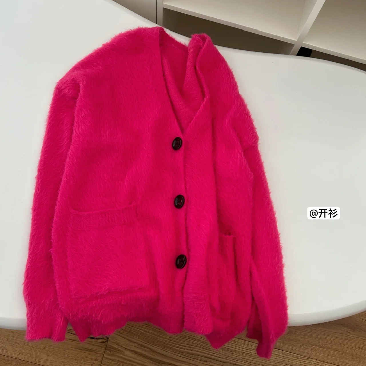 New Rose Red V-neck Single Breasted Knitted Cardigan Warm Tops Women Long Sleeve Loose Casual Sweater 2024 Autumn Winter Fashion