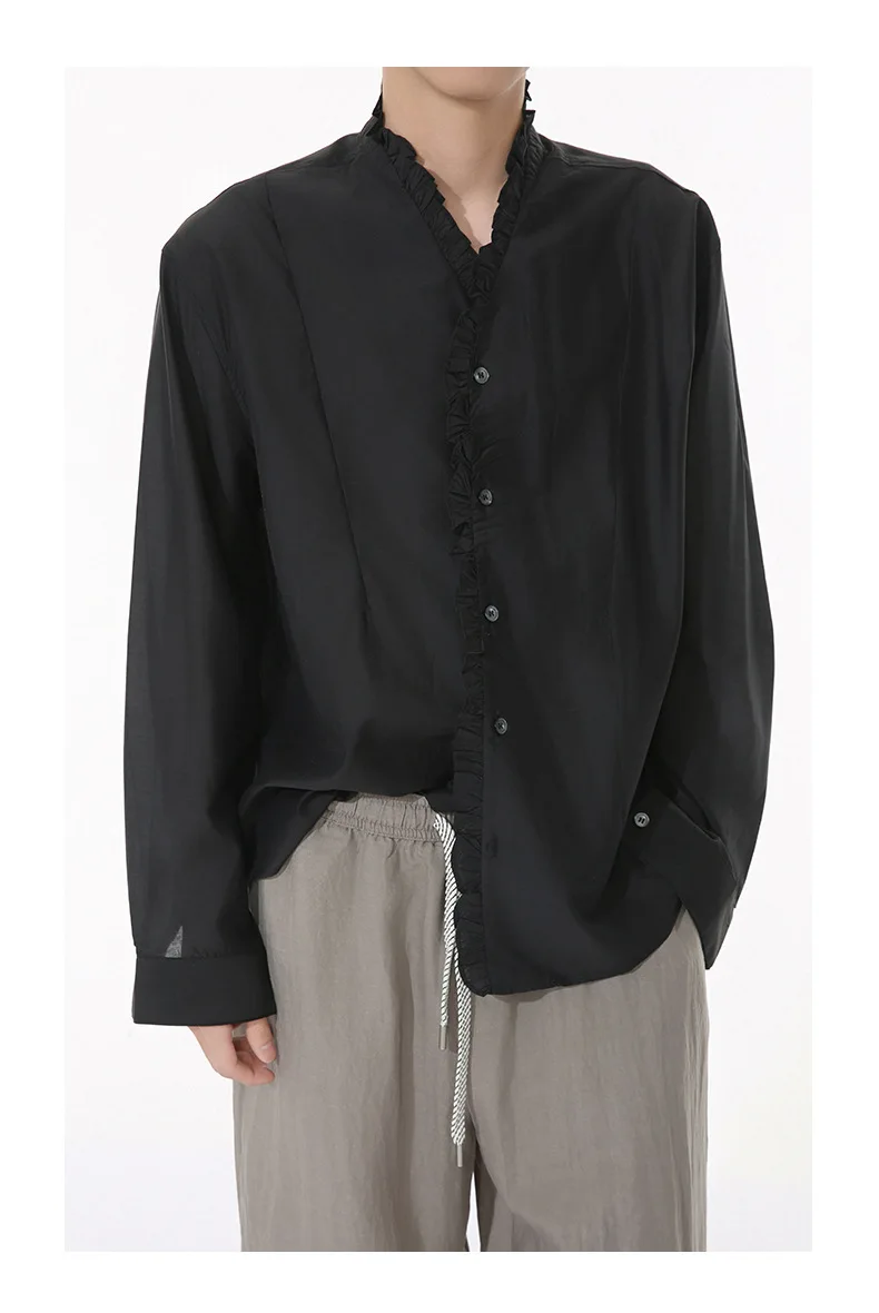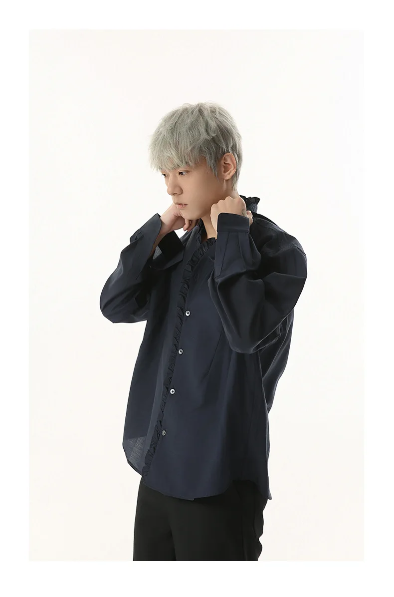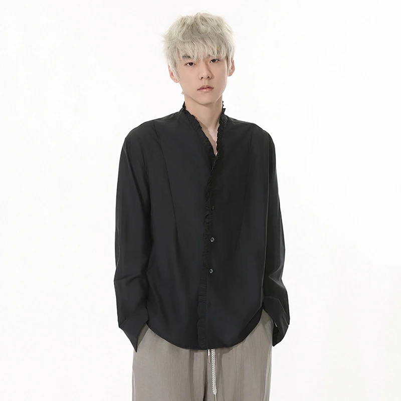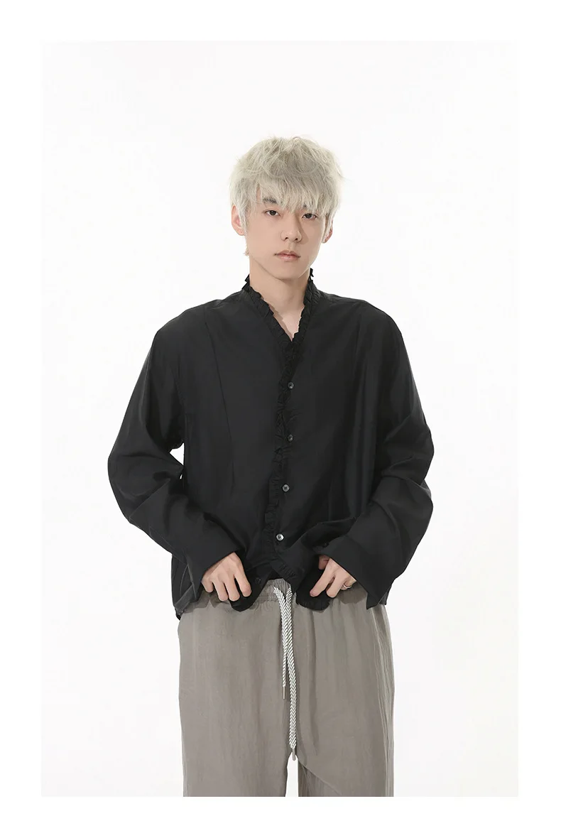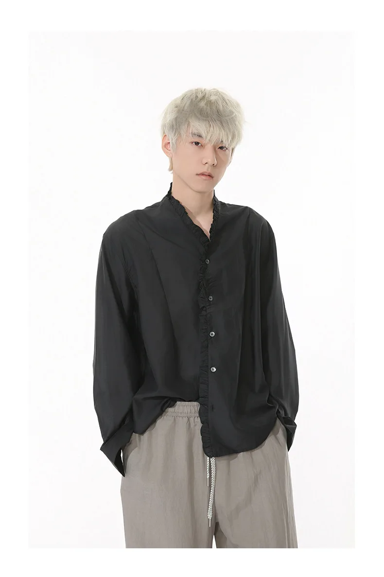 Niche Design Men's Shirts Pleated Lacework Design Solid Color Casual Tops Long Sleeve Single Breasted Loose Menswear 9W1254