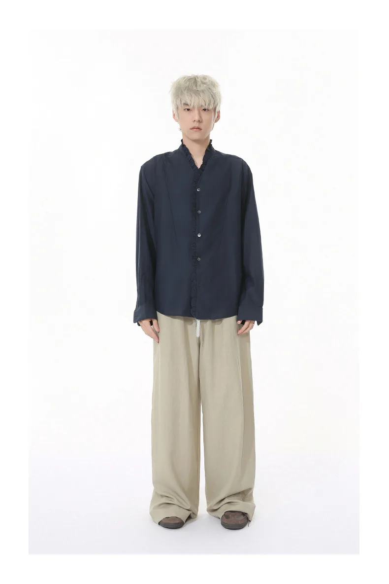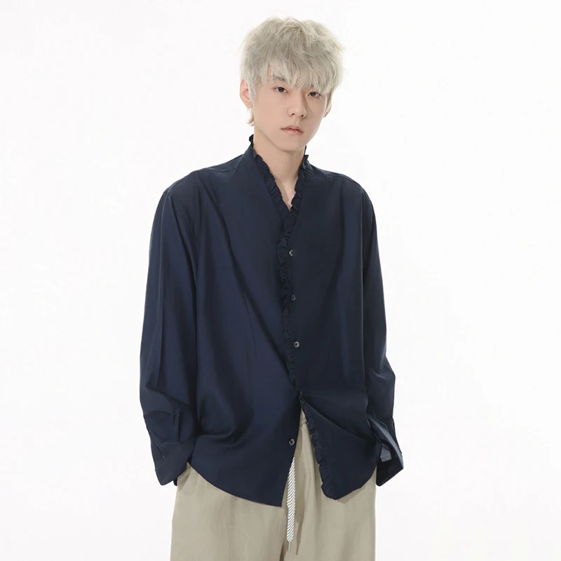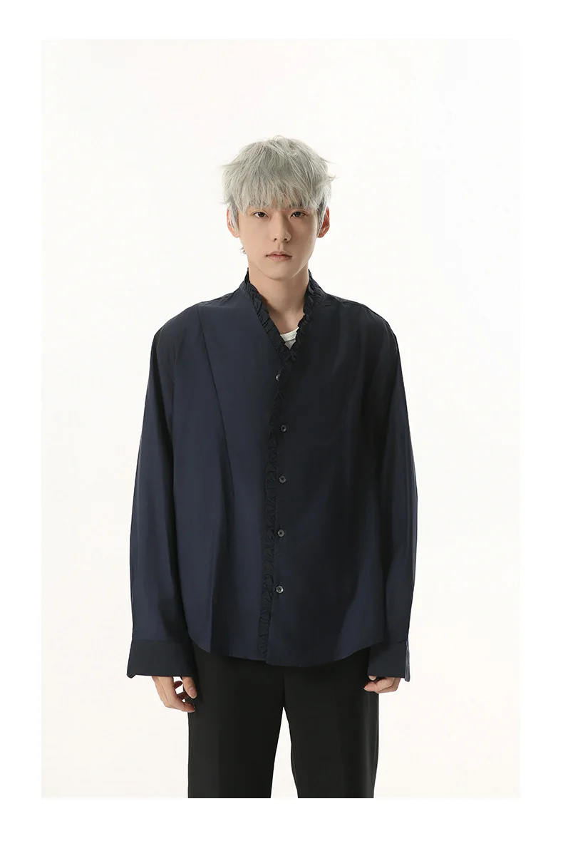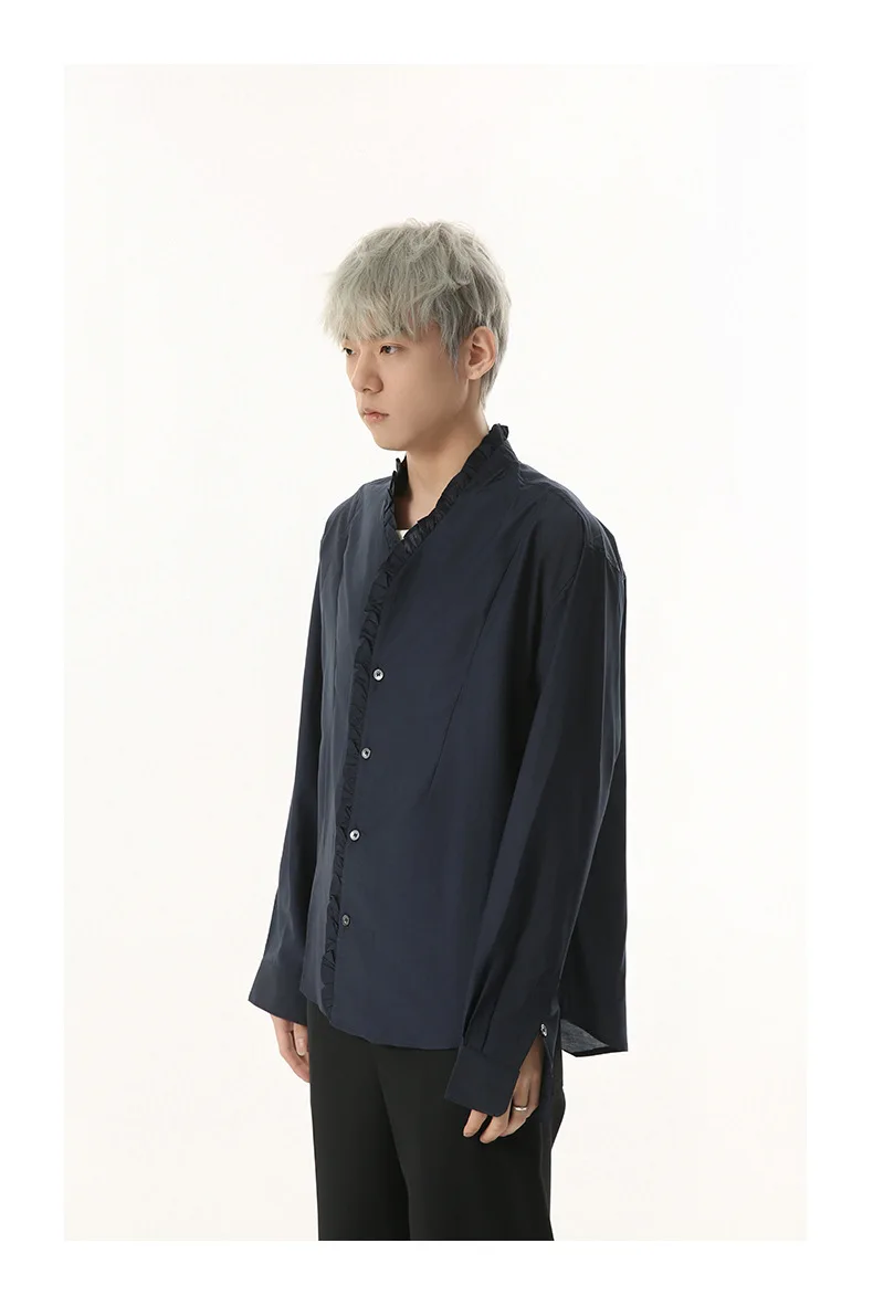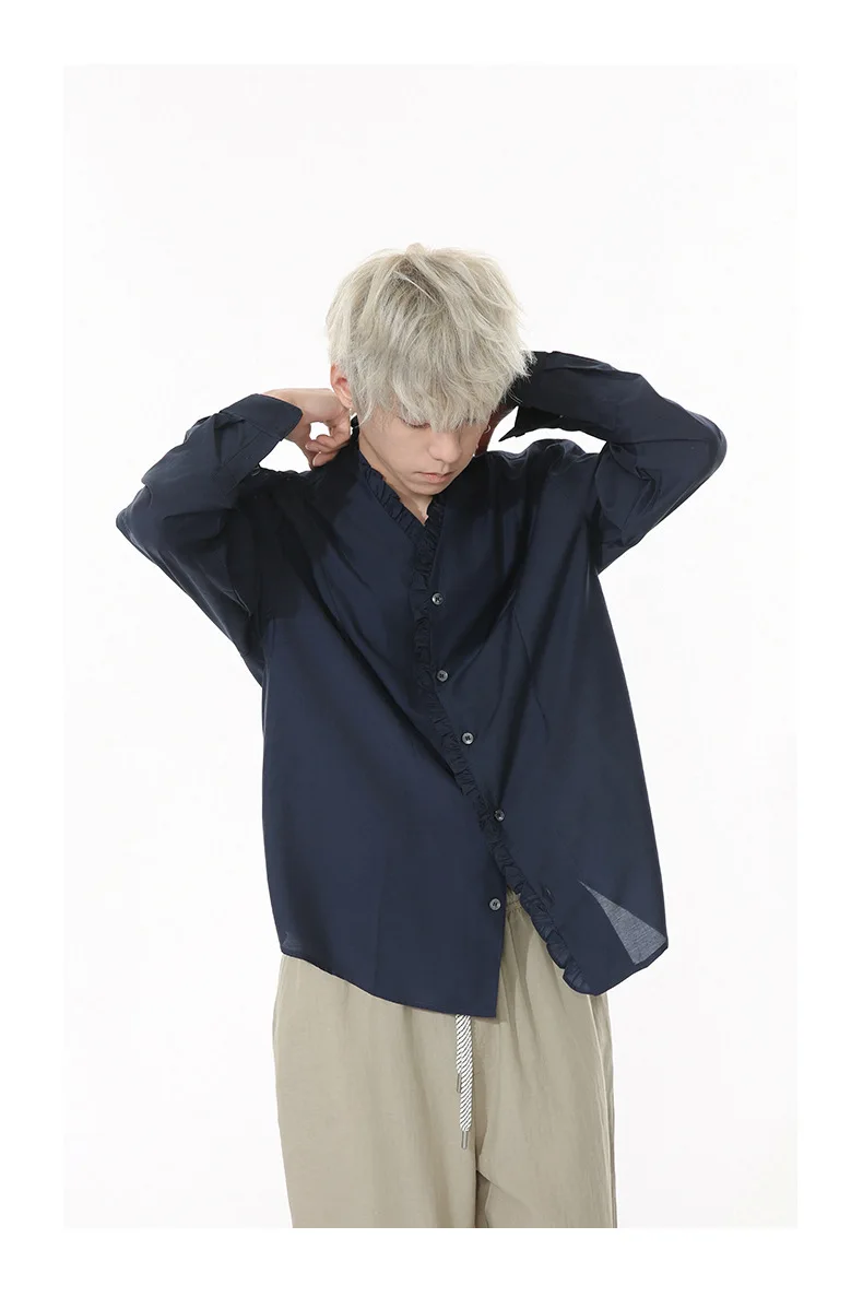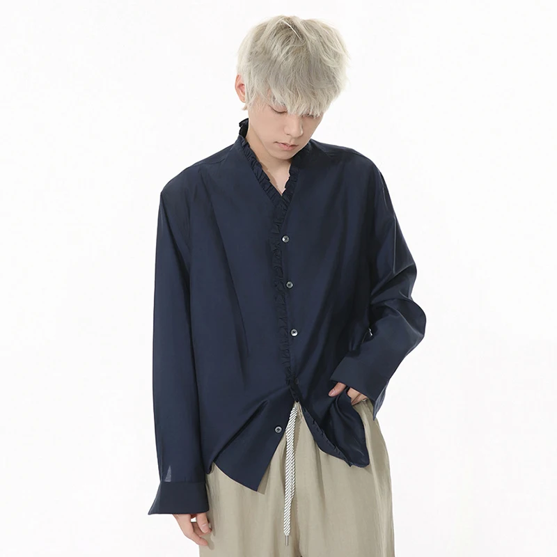 Niche Design Men's Shirts Pleated Lacework Design Solid Color Casual Tops Long Sleeve Single Breasted Loose Menswear 9W1254