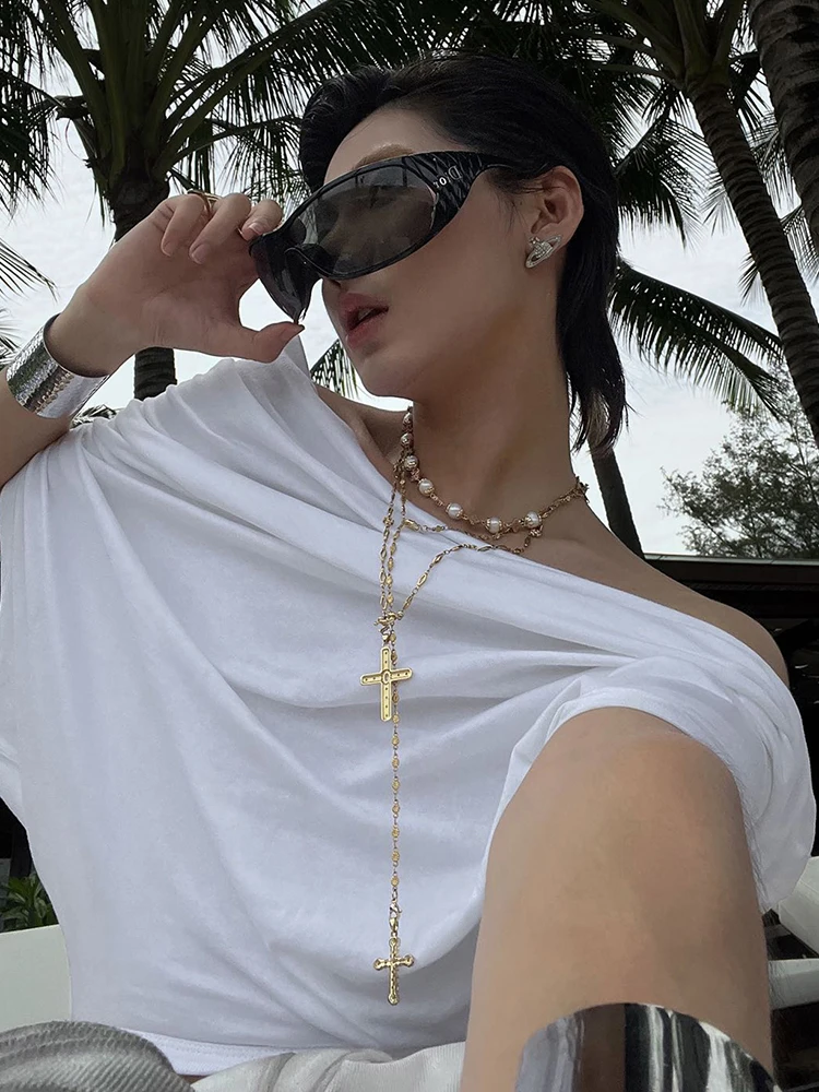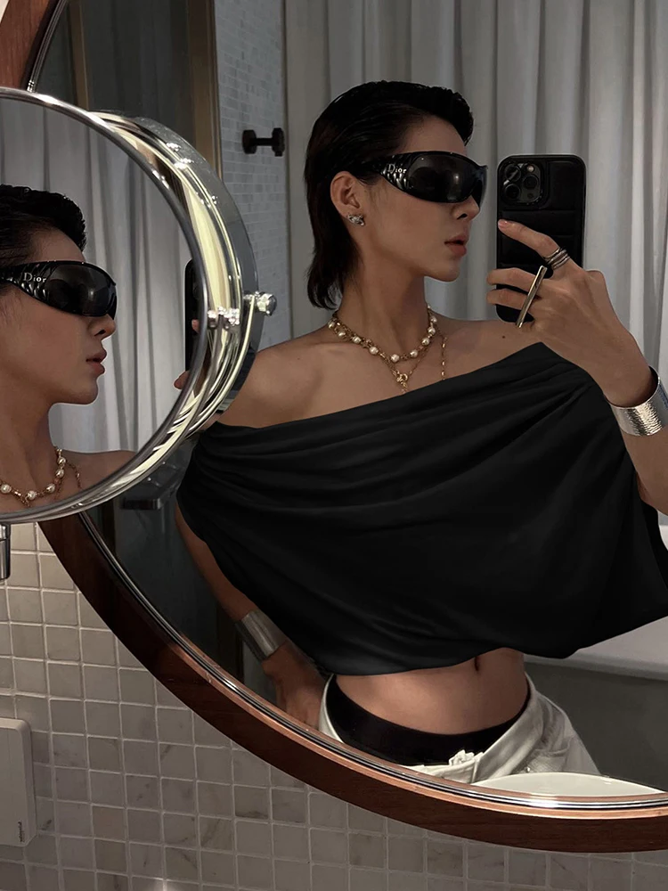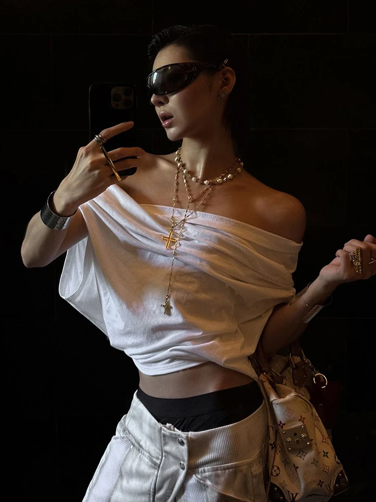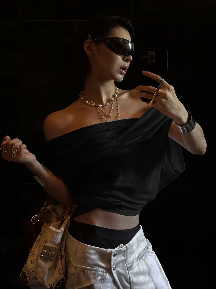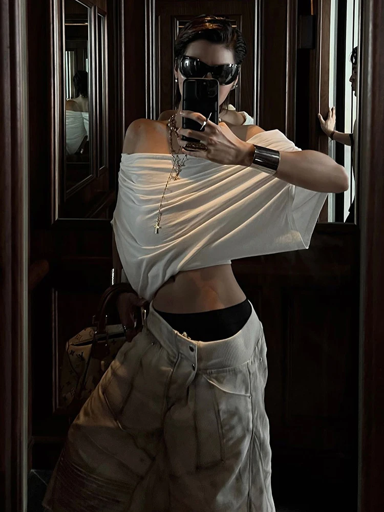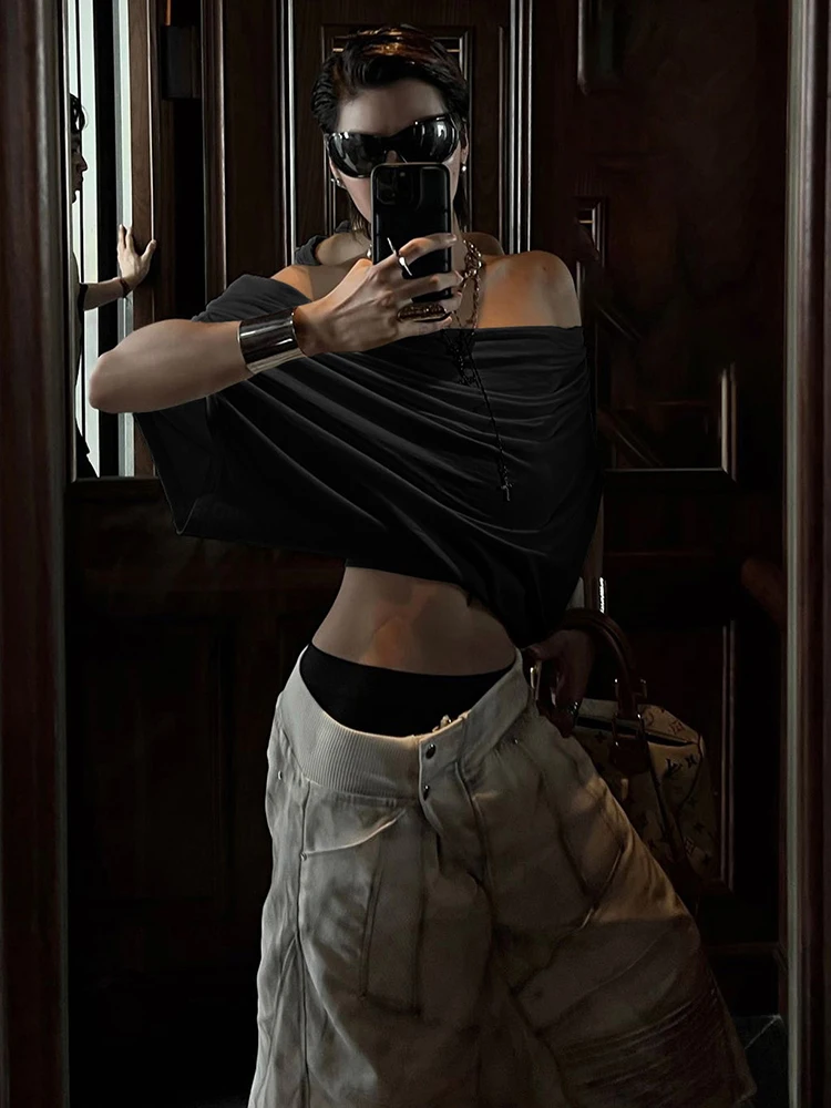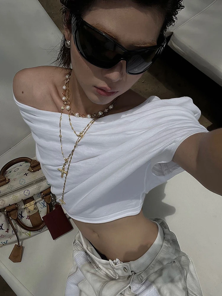 One Shoulder Leisure t-Shirt Women Folds Solid Skinny Loose Summer New Trend Simple Classic Versatile Street Daily Tops