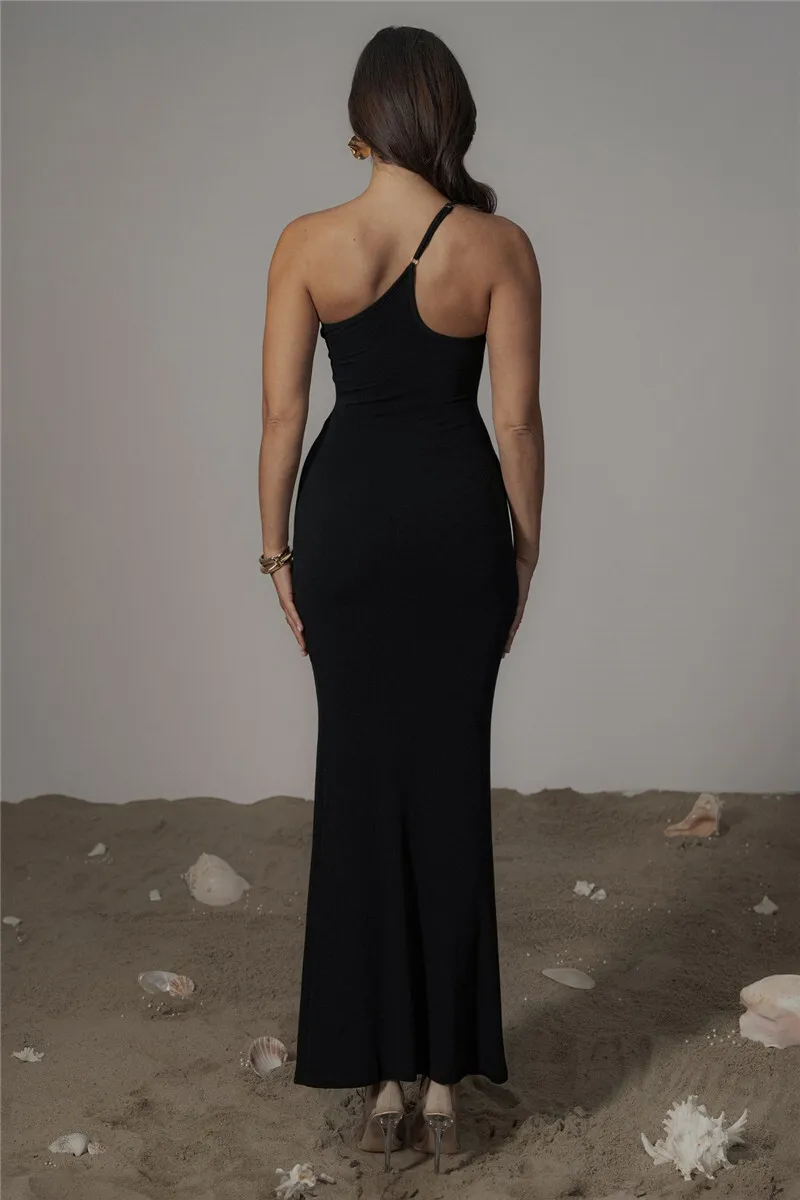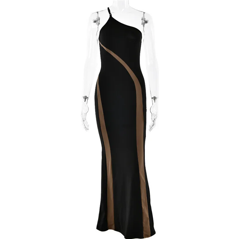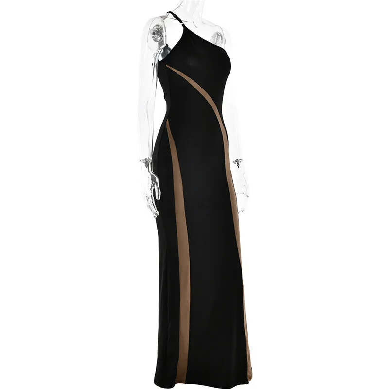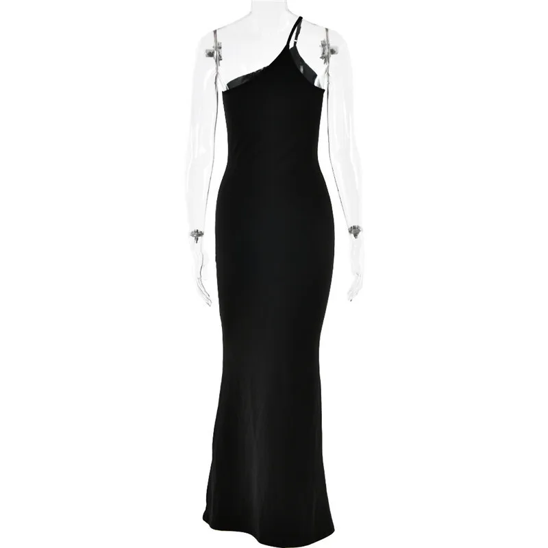 Patchwork One Shoulder Sexy Maxi Dress For Women Black Off-shoulder Backless Bodycon Club Party Evening Long Dress
