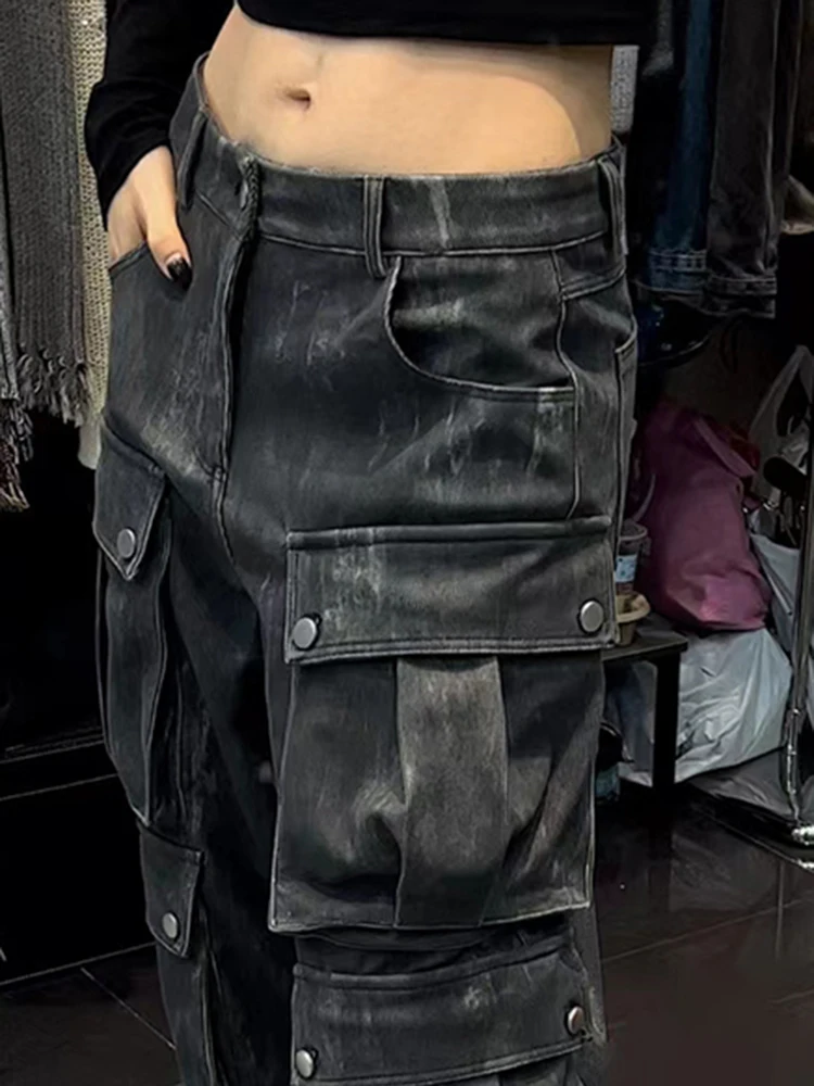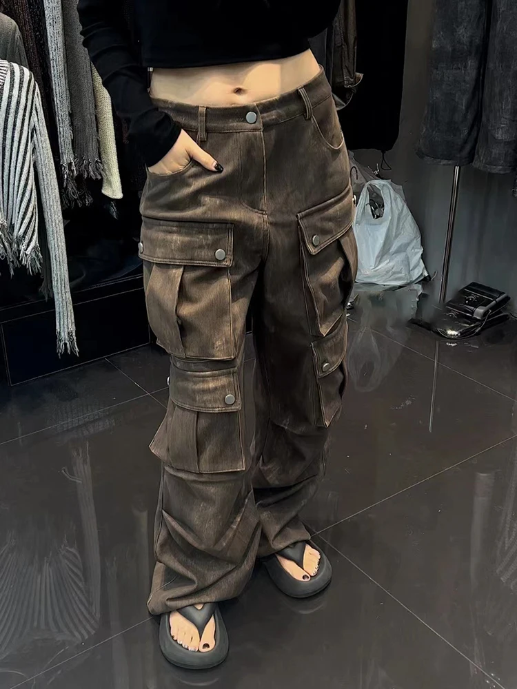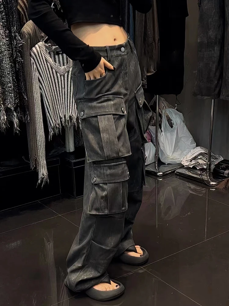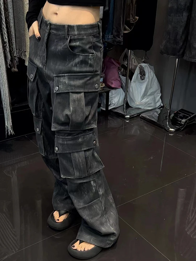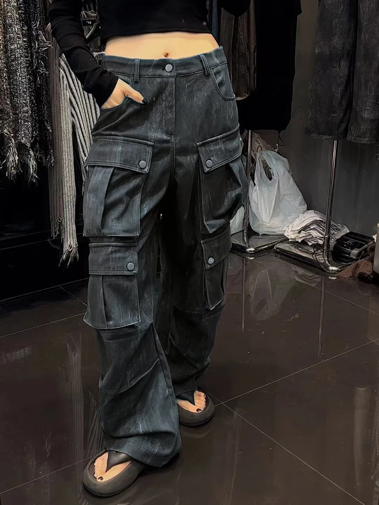 Patchwork Pockets Casual Loose Denim Pants For Women High Waist Spliced Button Streetwear Wide Leg Jeans Female