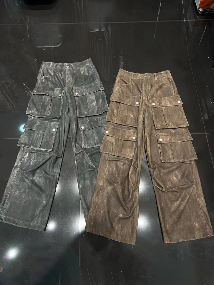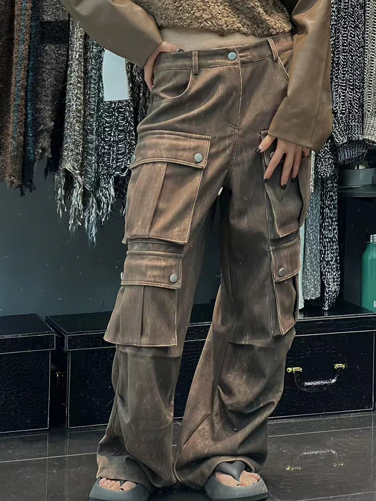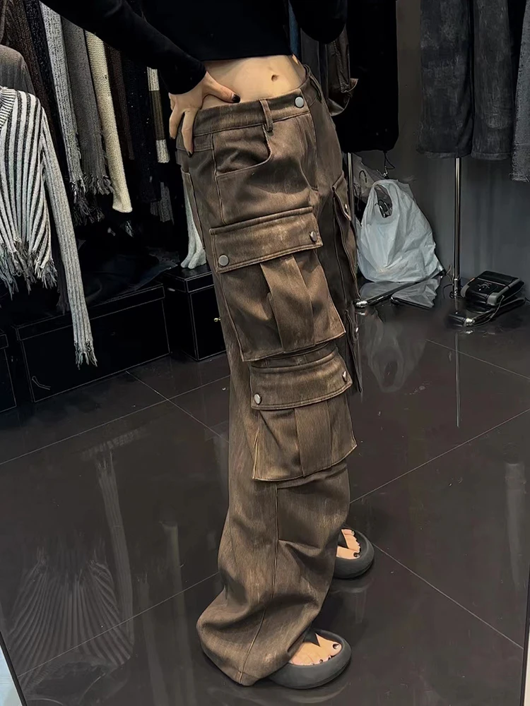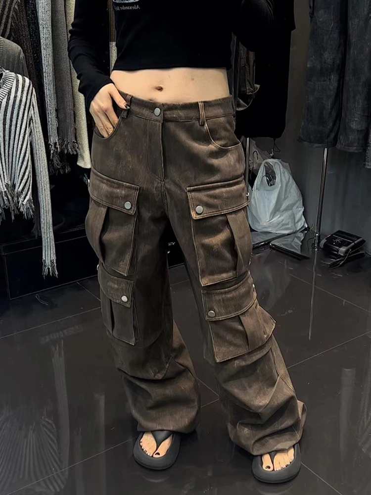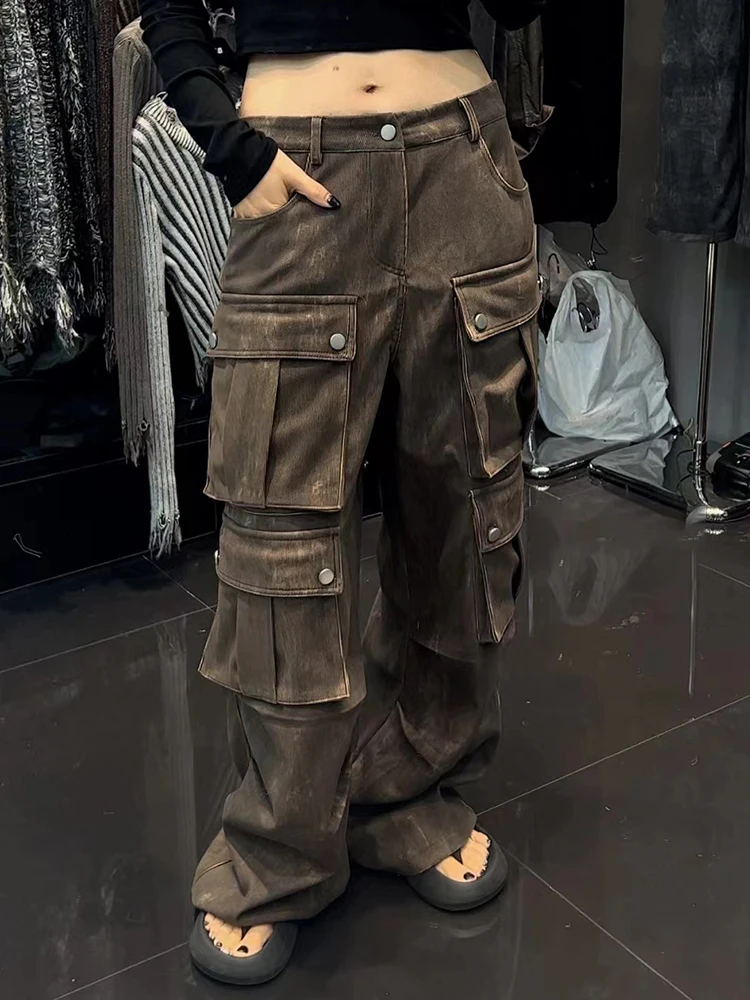 Patchwork Pockets Casual Loose Denim Pants For Women High Waist Spliced Button Streetwear Wide Leg Jeans Female