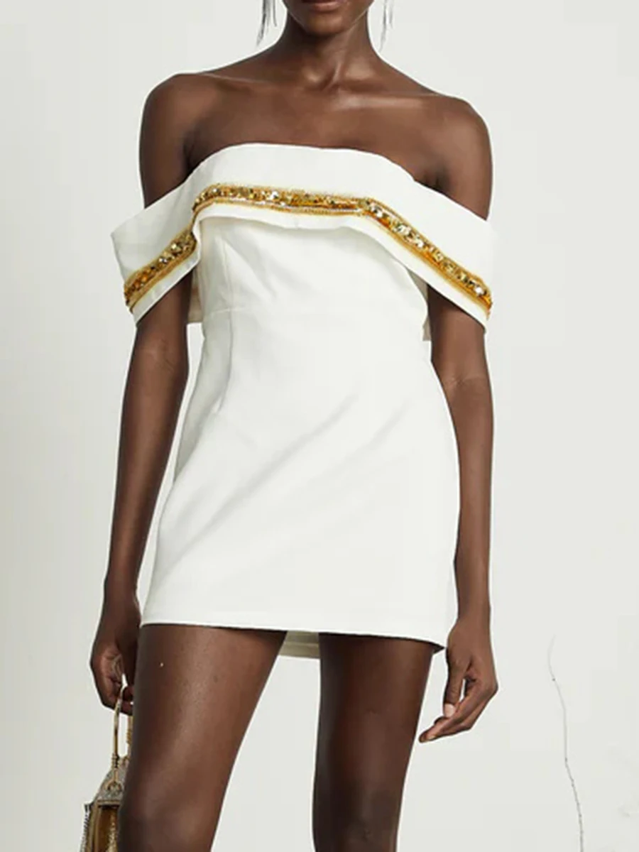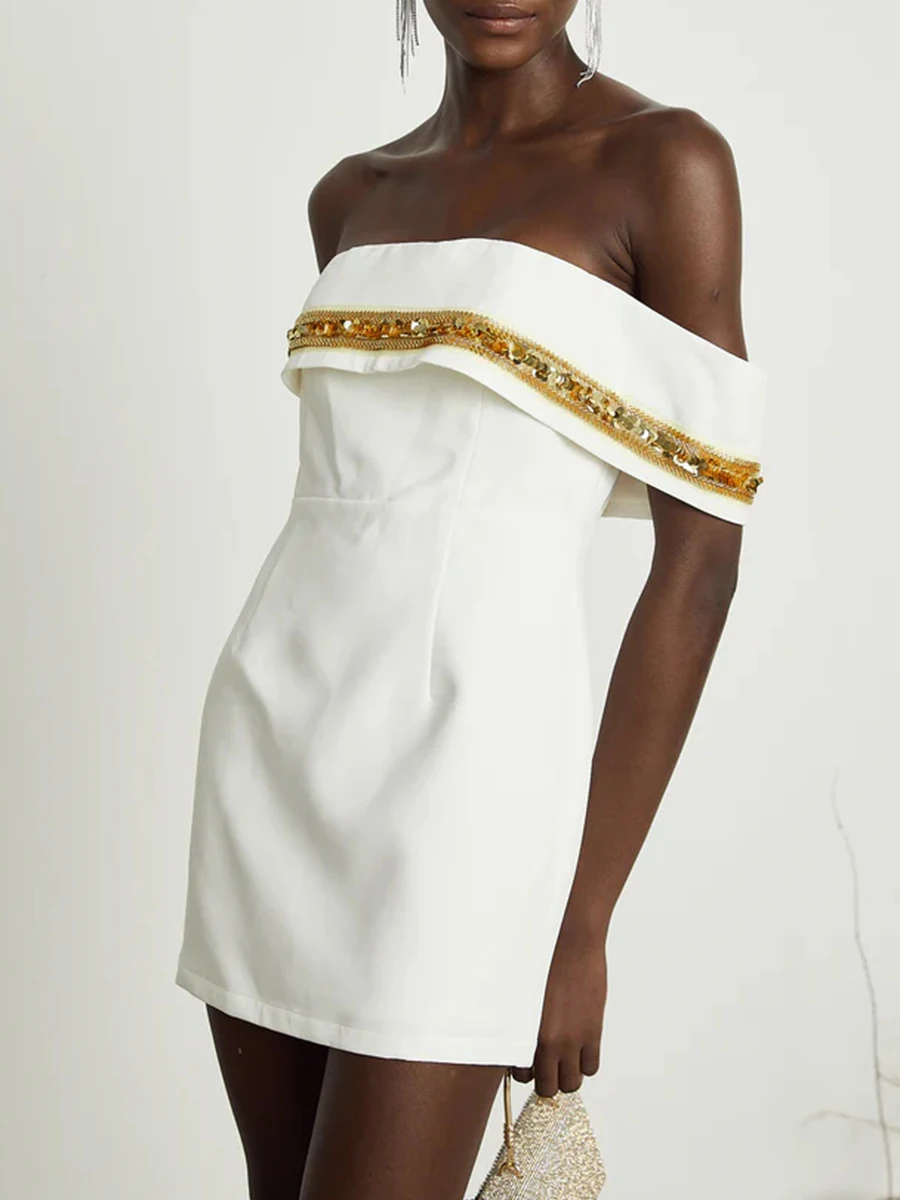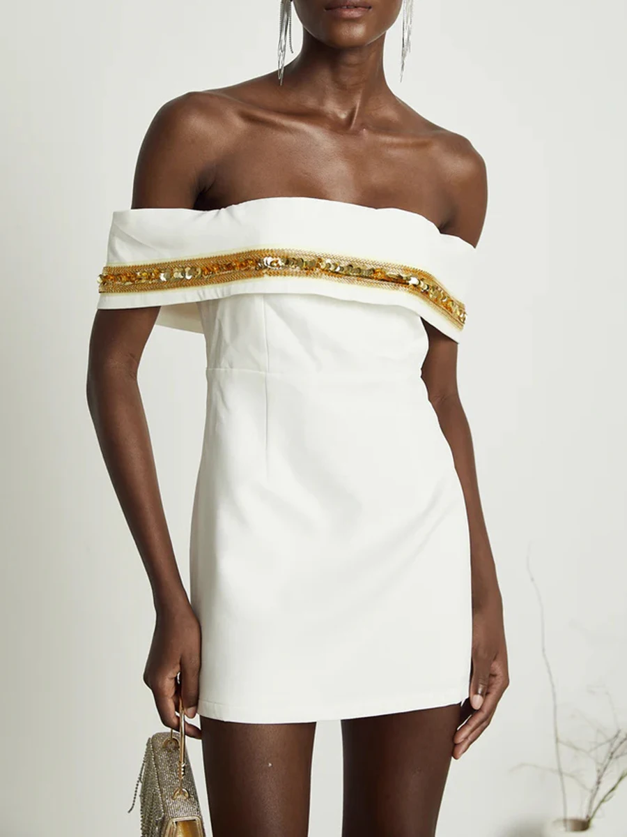 Patchwork Sequines Slimming Mini Dresses For Women Slash Neck Shoulder Cuff High Waist Temperament Dress Female New