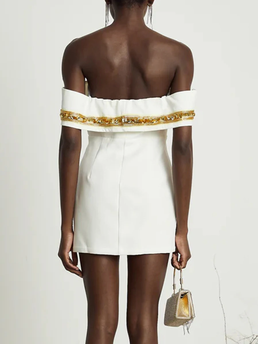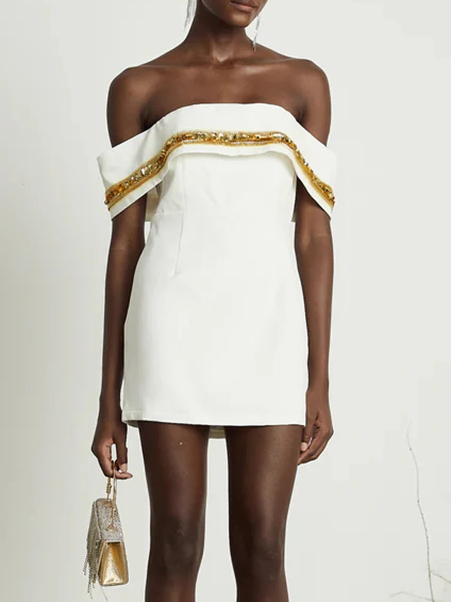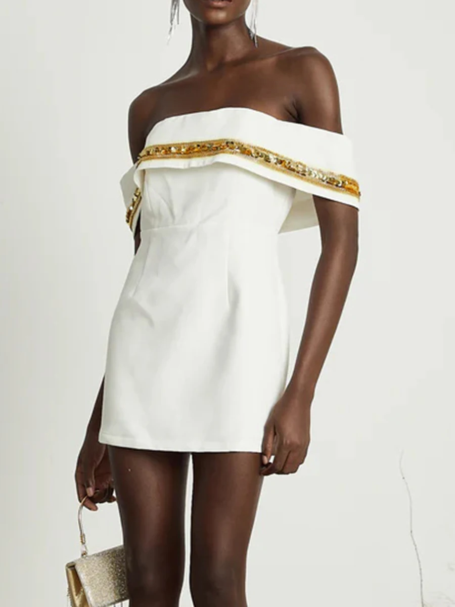 Patchwork Sequines Slimming Mini Dresses For Women Slash Neck Shoulder Cuff High Waist Temperament Dress Female New