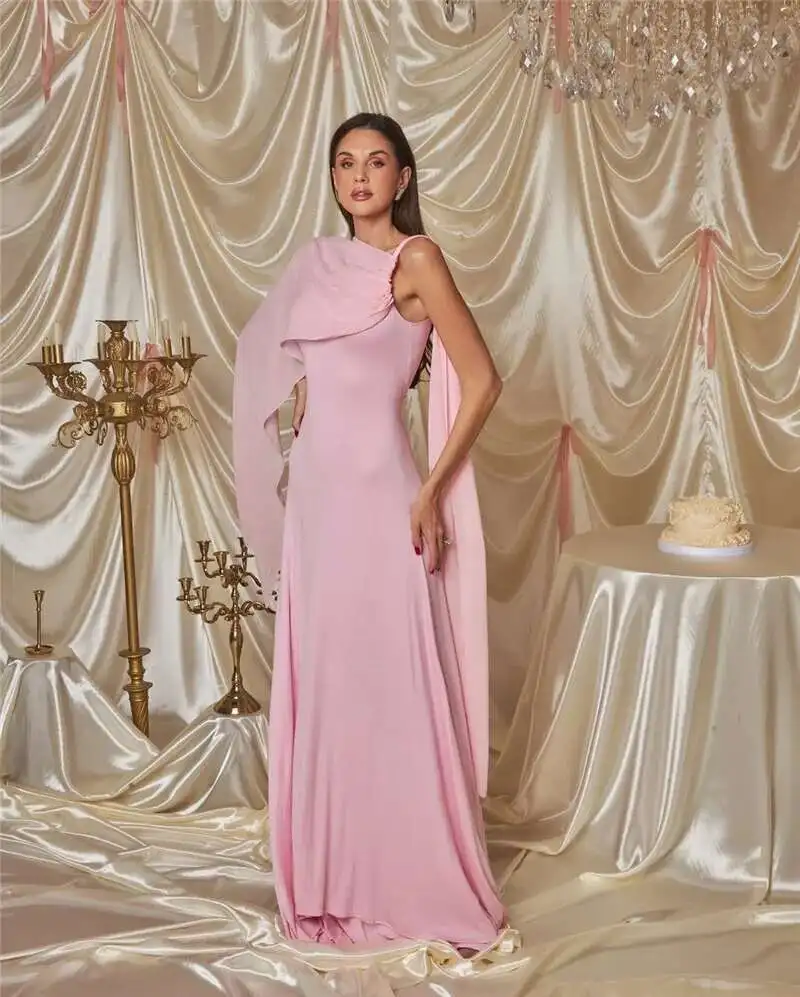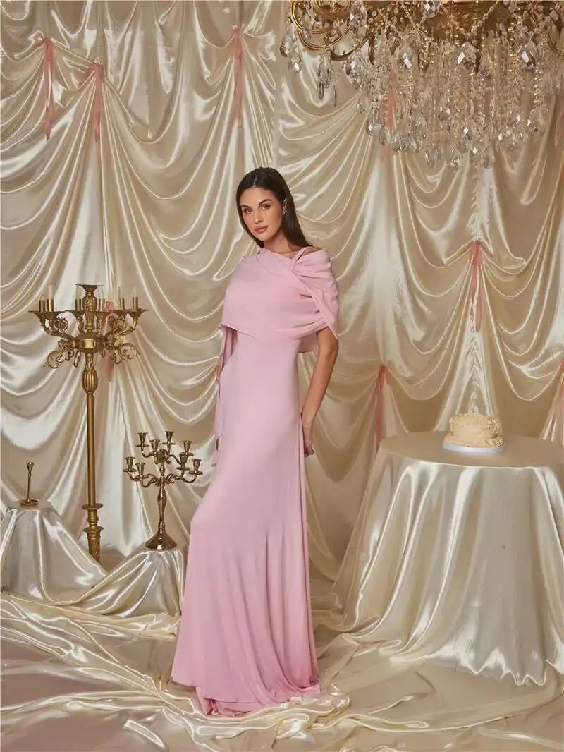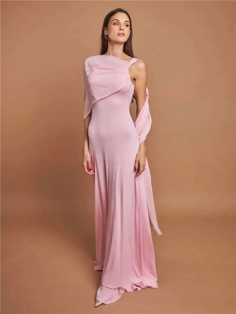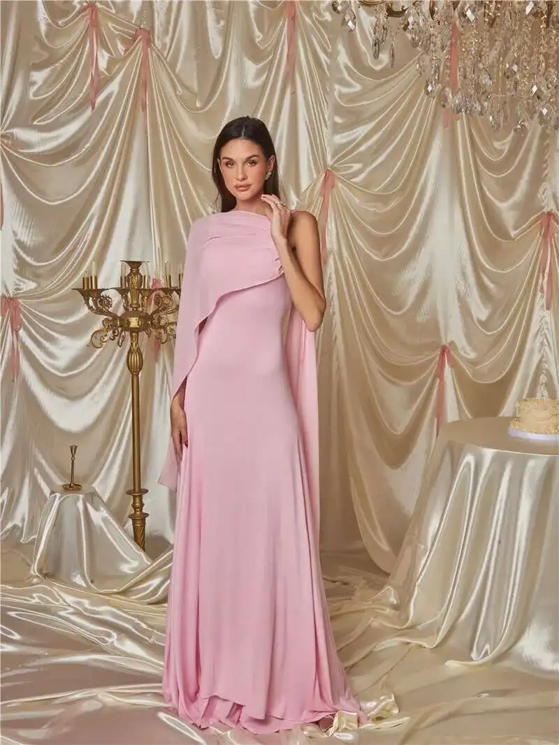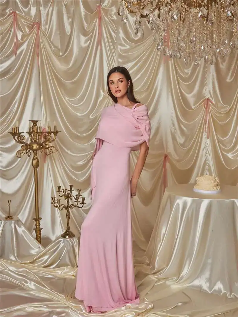 Pink Cape Sleeve Sexy Maxi Dress For Women Off-shoulder Backless Gown Elegant Skew Collar Lace-up Long Dress Vestido