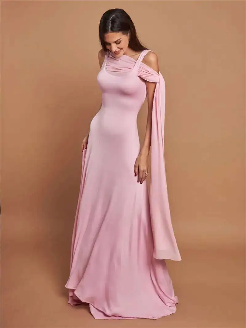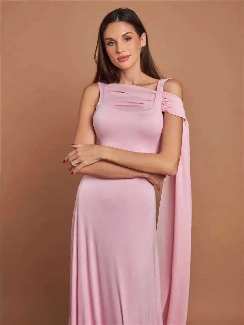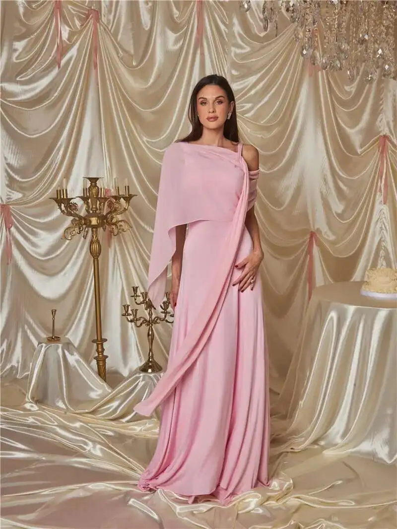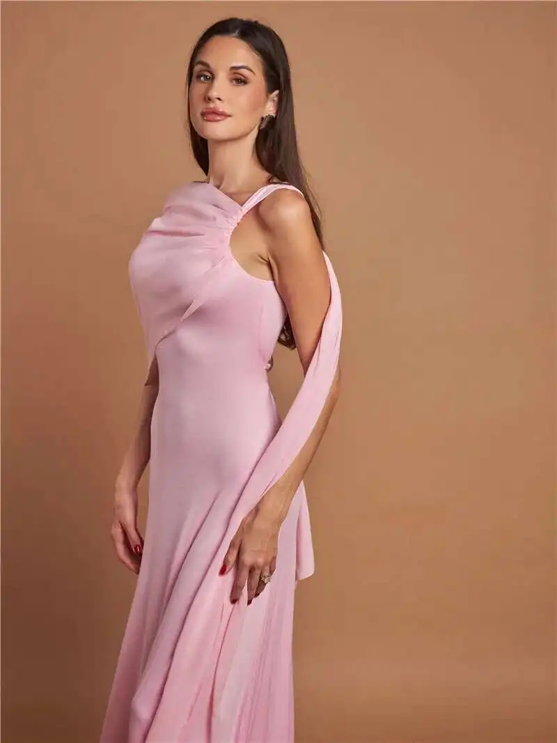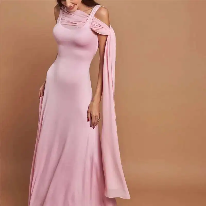 Pink Cape Sleeve Sexy Maxi Dress For Women Off-shoulder Backless Gown Elegant Skew Collar Lace-up Long Dress Vestido
