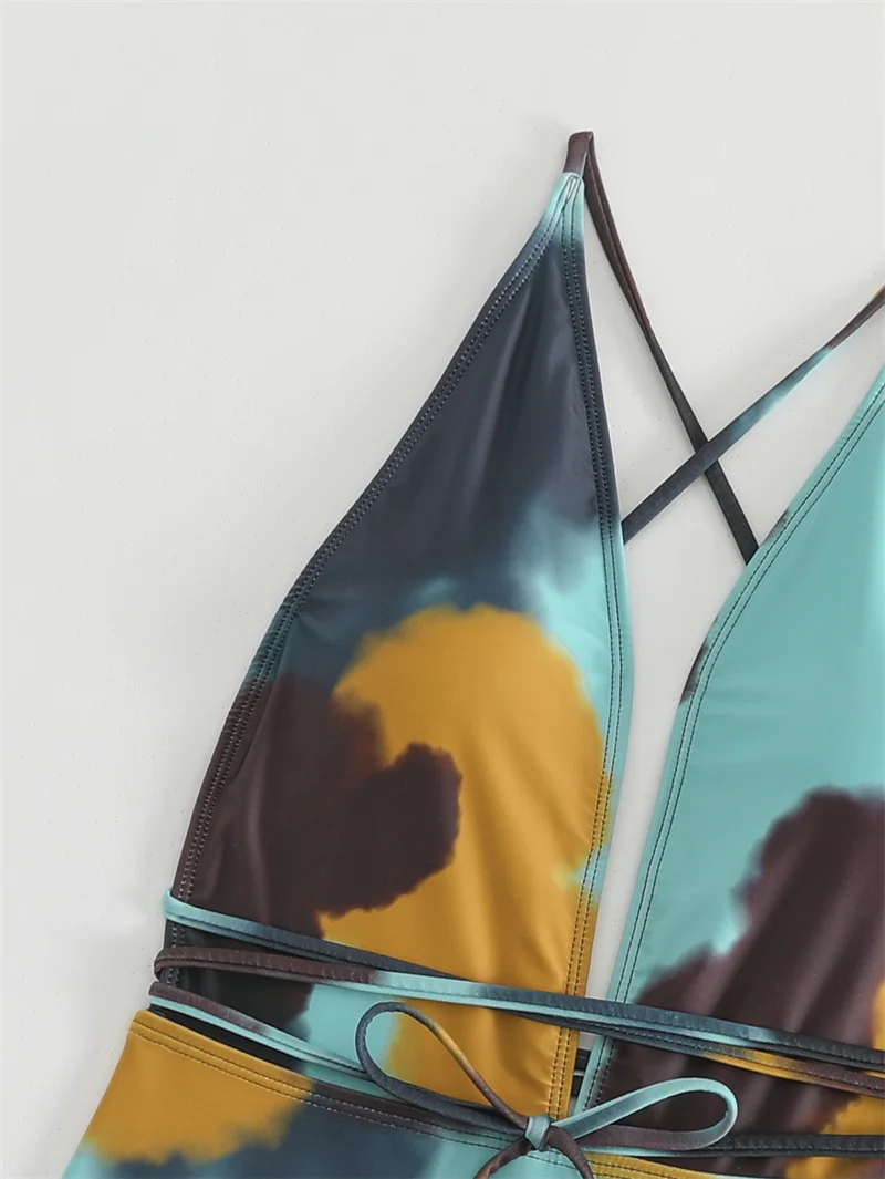 Print High Cut Halter One Piece Swimsuit 2024 Swimwear for Women Sexy Around Bandage Bathing Suit Backless Monokini