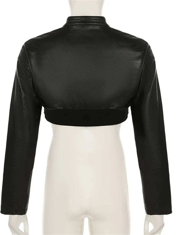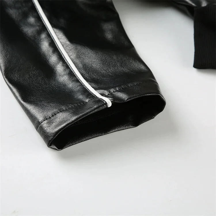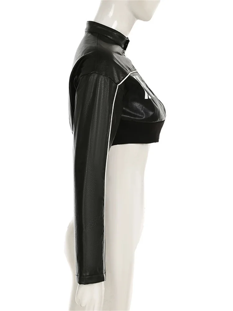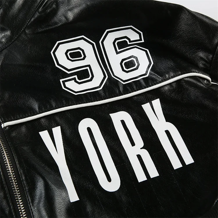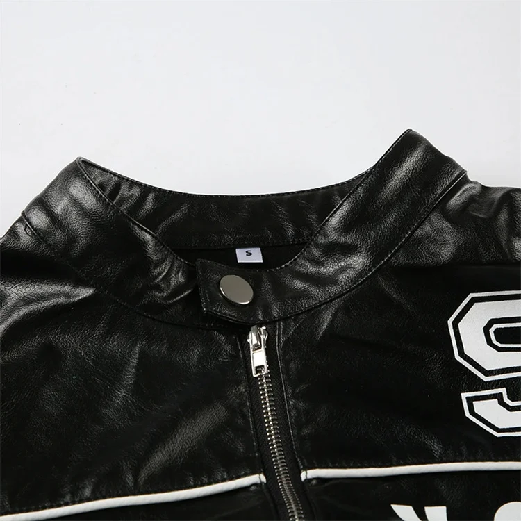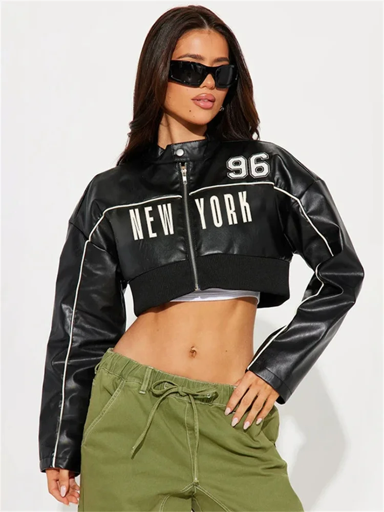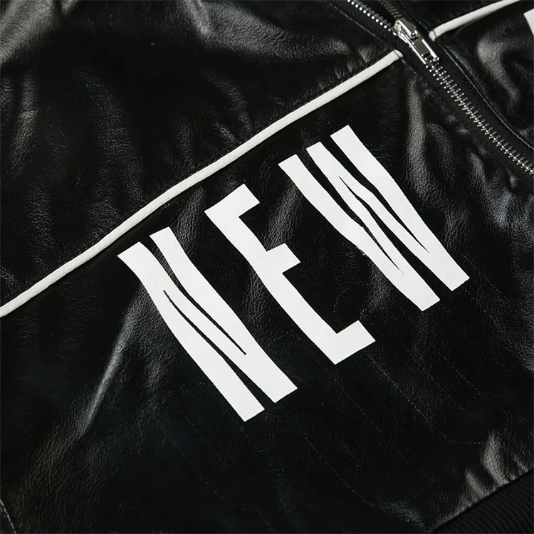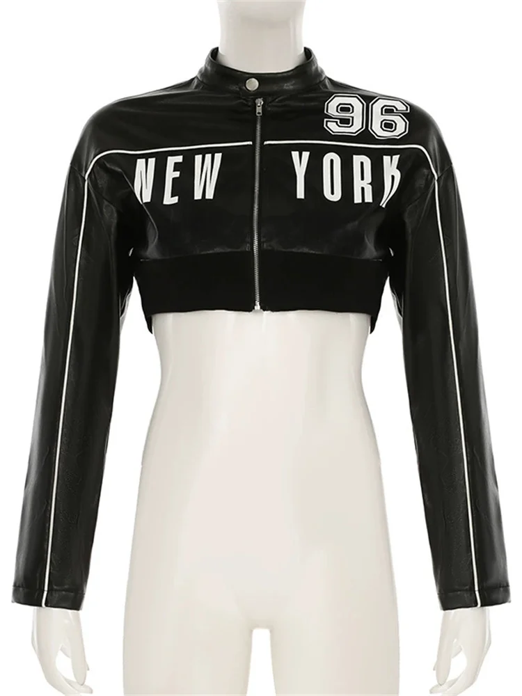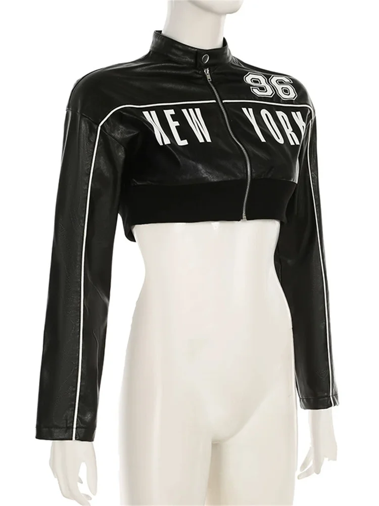 PU Patchwork Women Jacket Letter Print Hipster Button Zip Full Sleeve Trend Cool Street Wild Spring Outwear Crop Coat