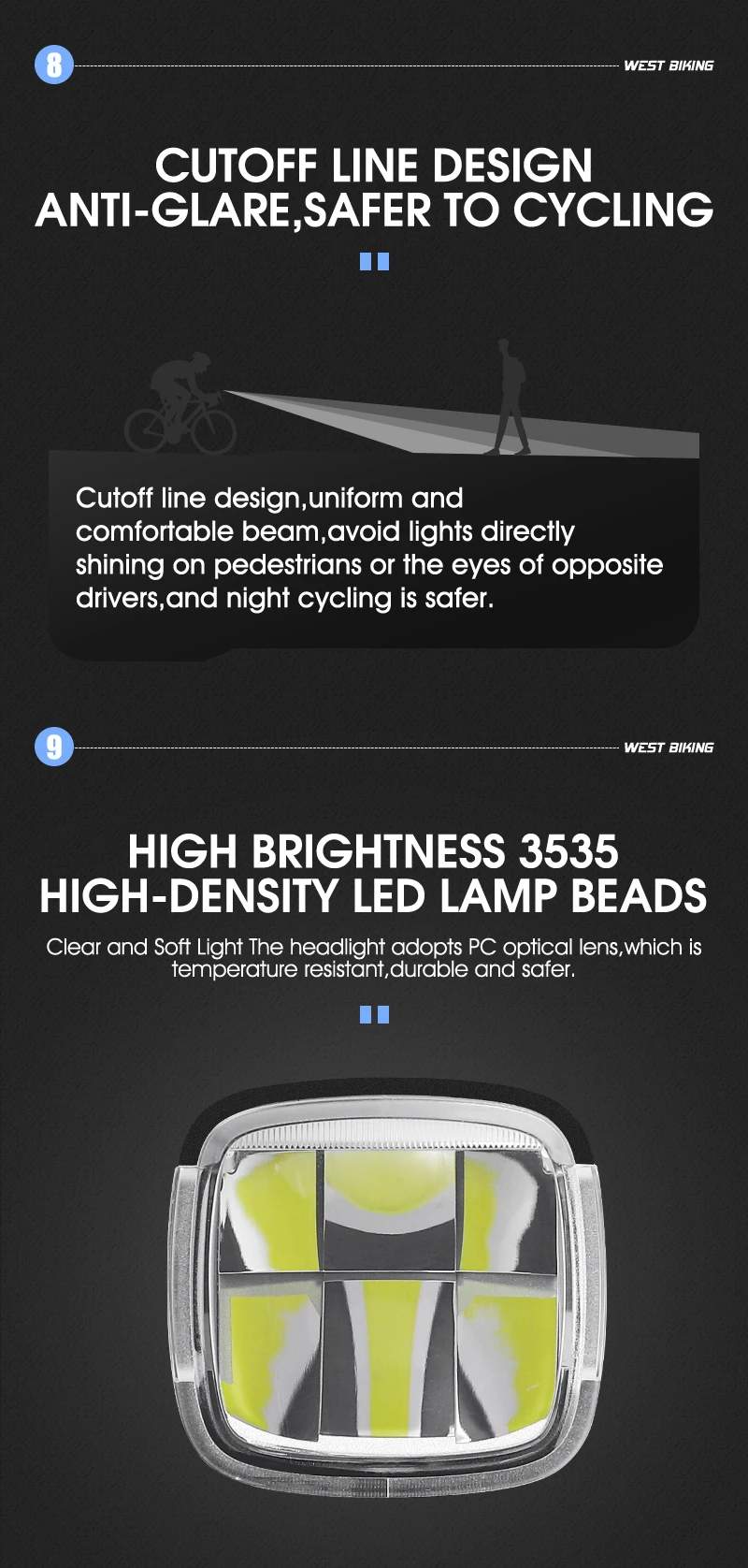 Cutoff line design,evenly and comfortable beam,avoid lights directly shining on pedestrians or the eyes of opposite drivers,and night cycling is safer.