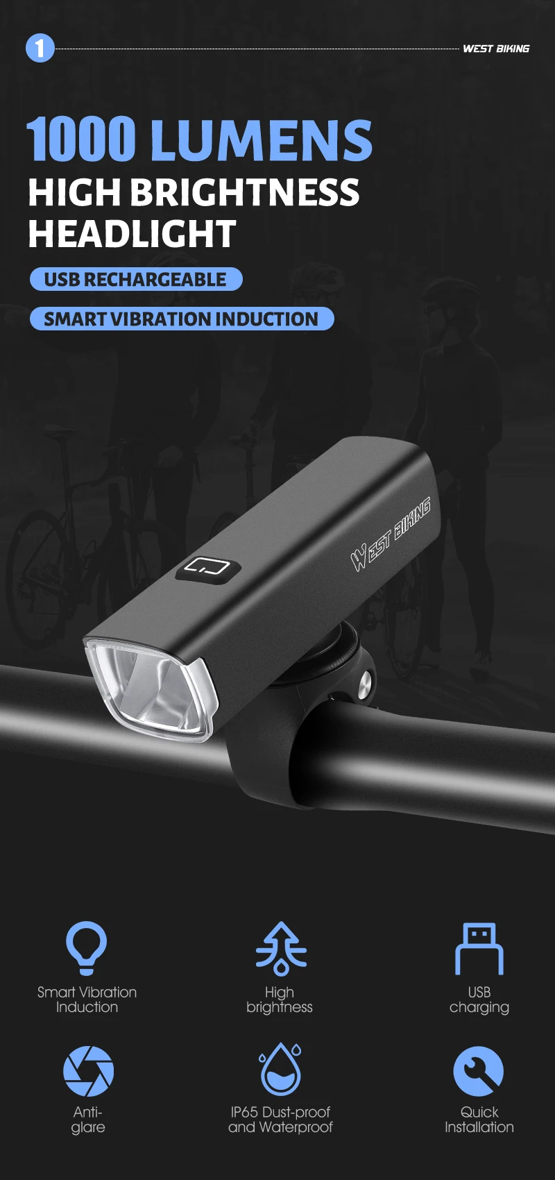Smart vibration induction/high brightness/IP65 dust-proof and waterproof/four mode/anti-glare