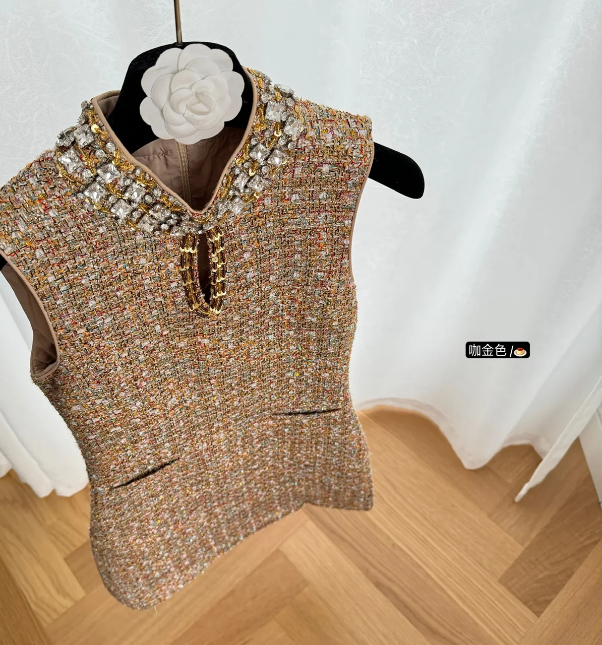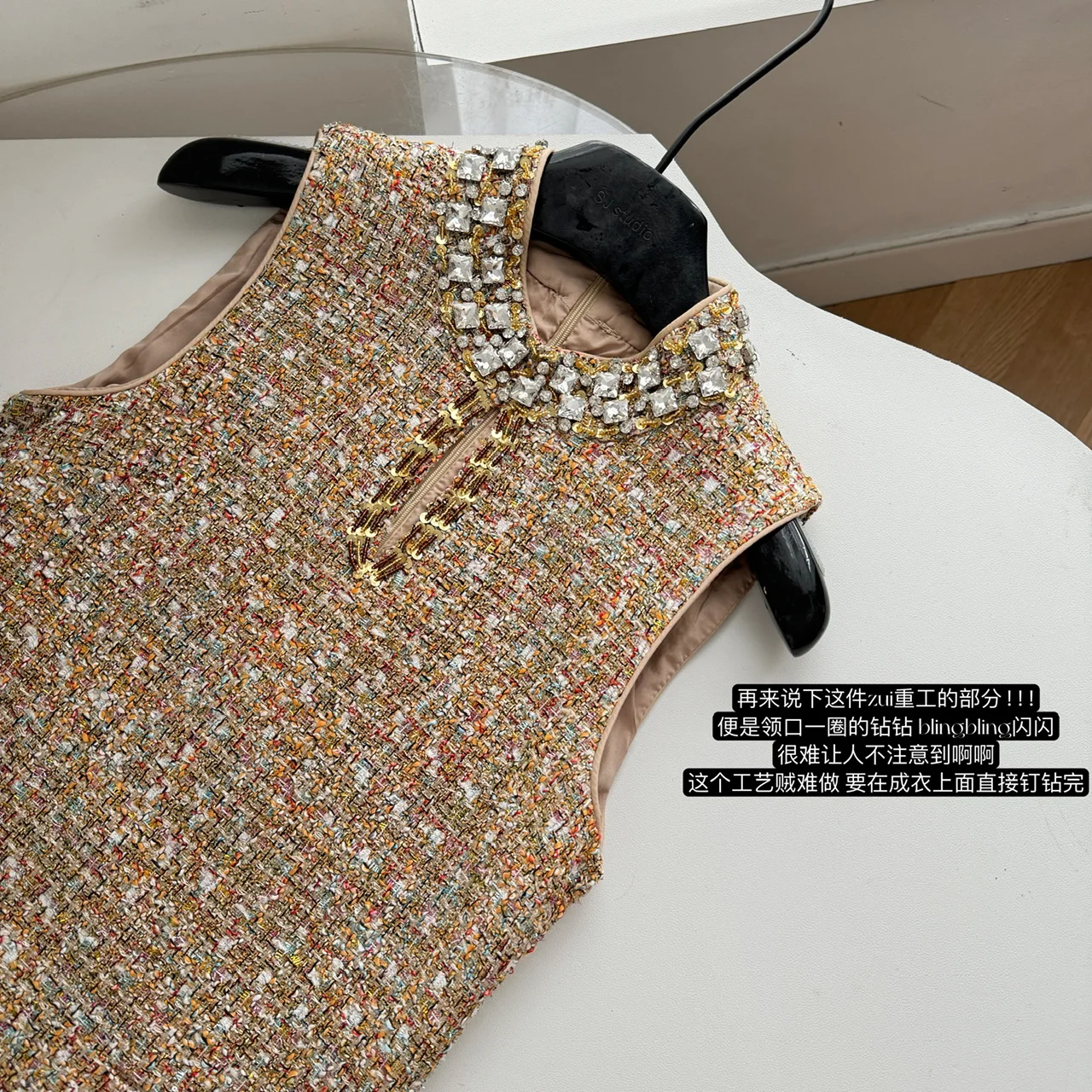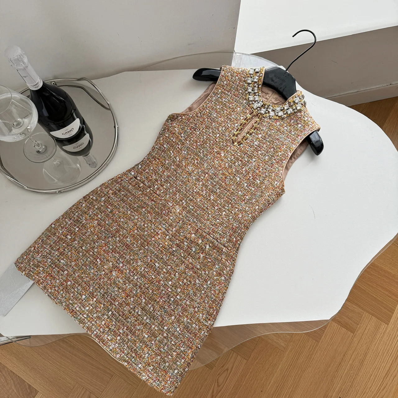 Retro 2024 Autumn Winter New Brown Diamond Woolen Sleeveless Mini Dress Women Round Neck Elegant Short Tweed Dress Popular Trend