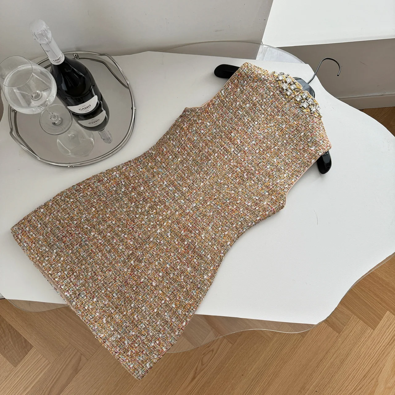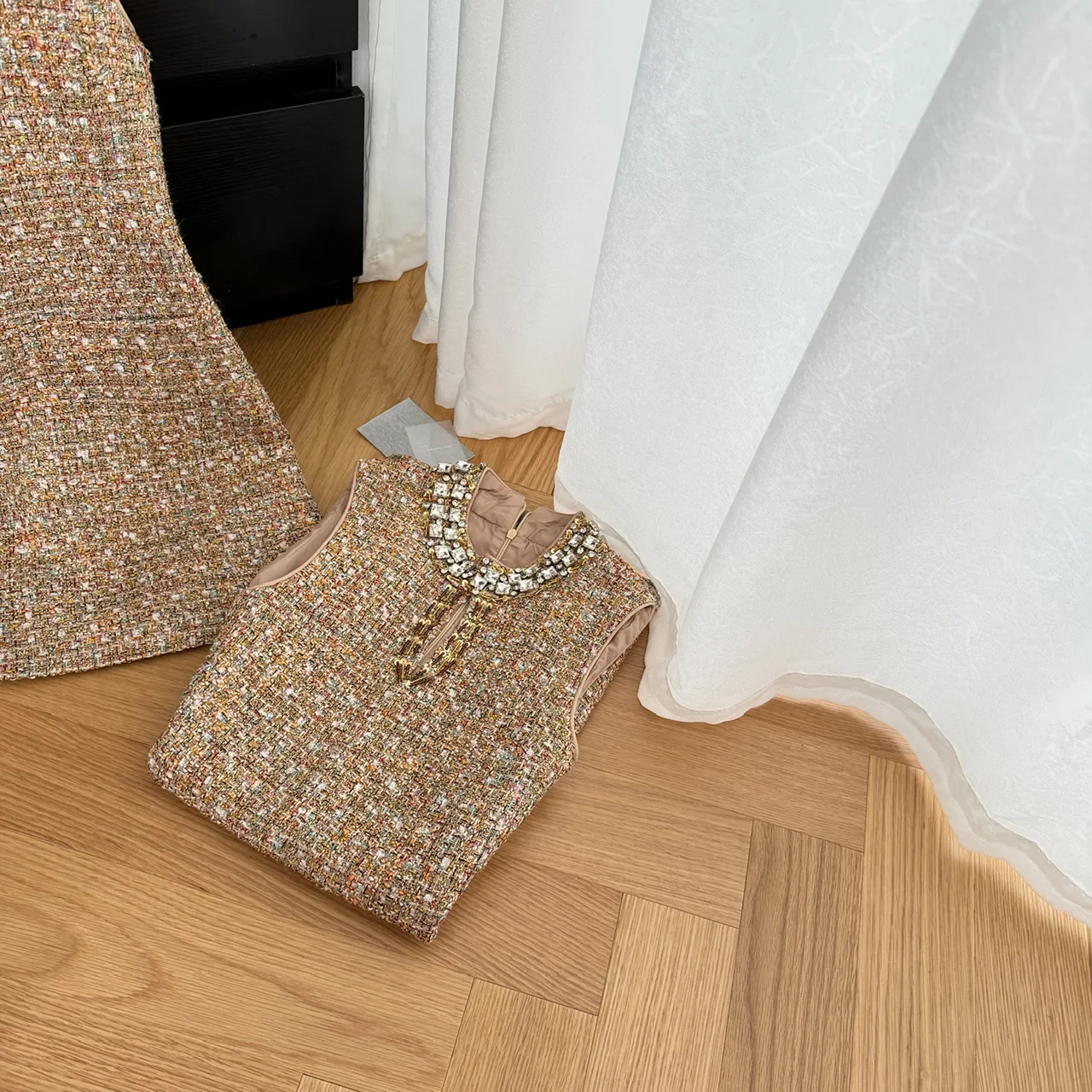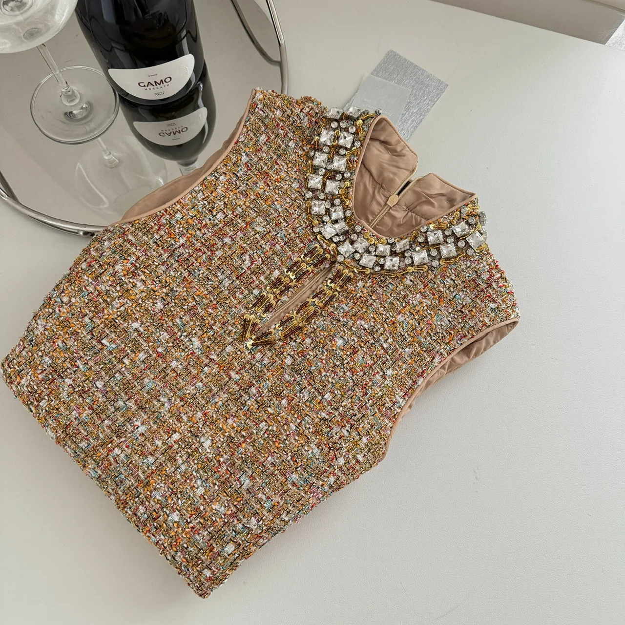 Retro 2024 Autumn Winter New Brown Diamond Woolen Sleeveless Mini Dress Women Round Neck Elegant Short Tweed Dress Popular Trend