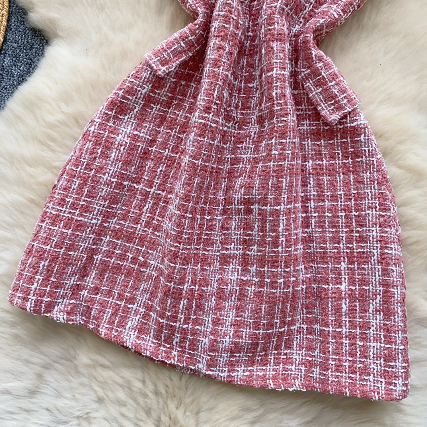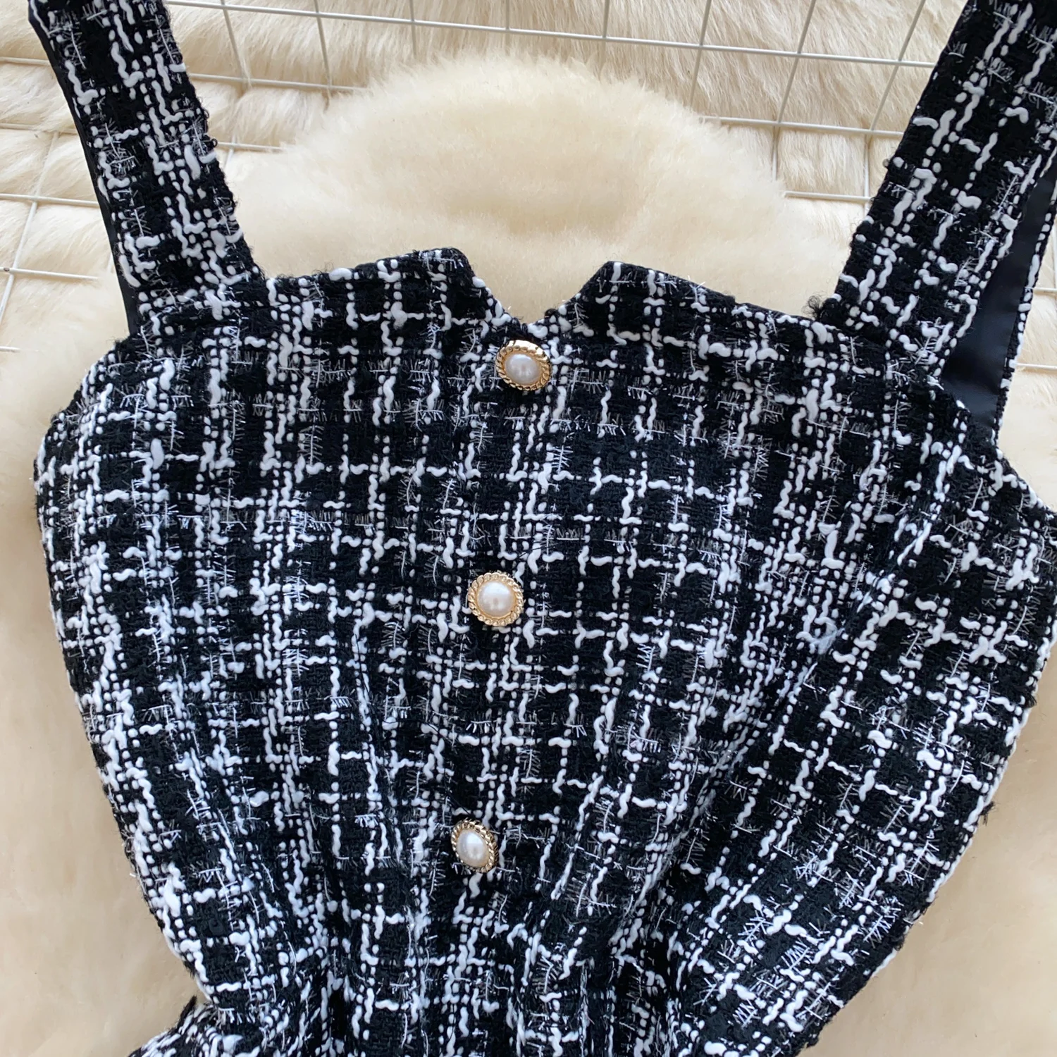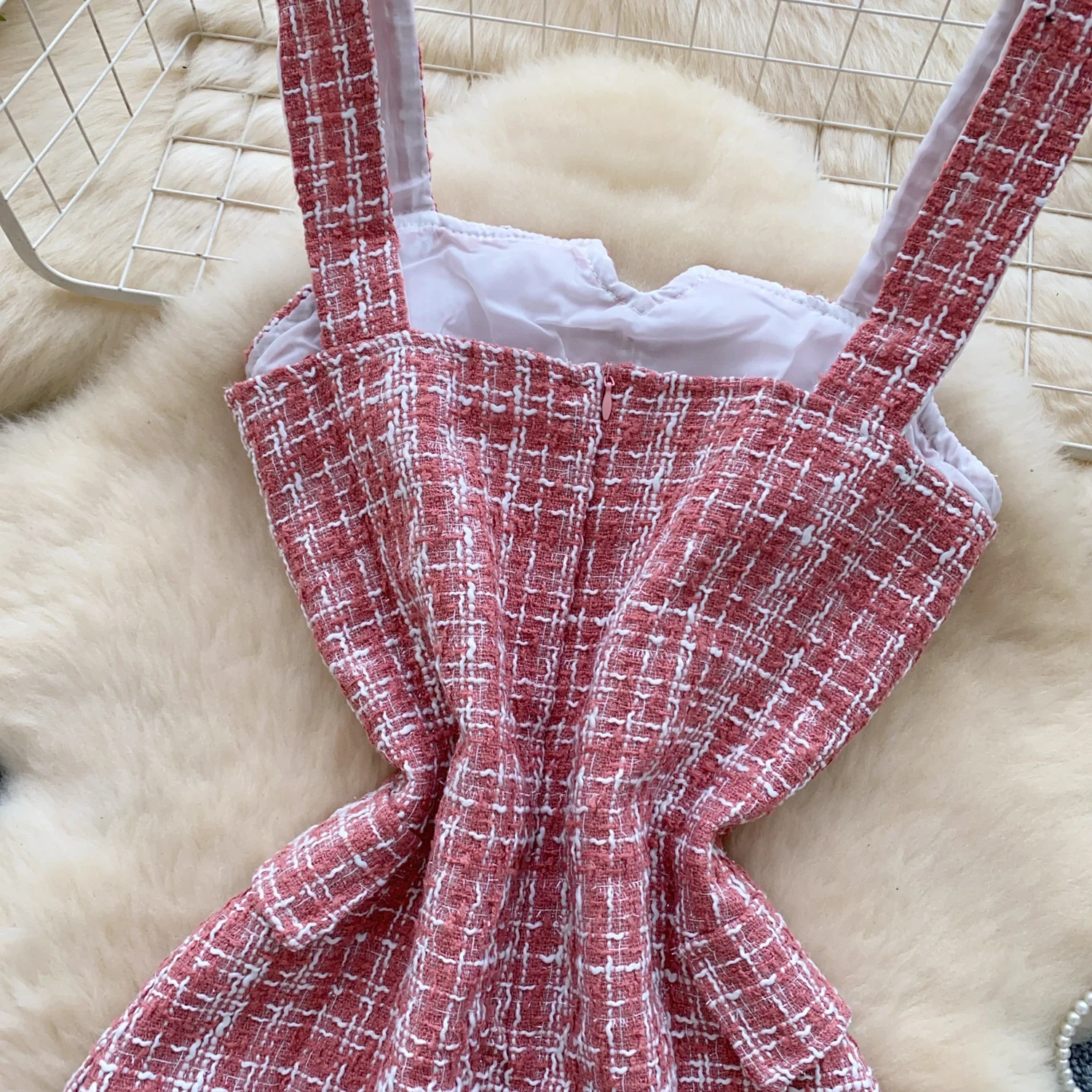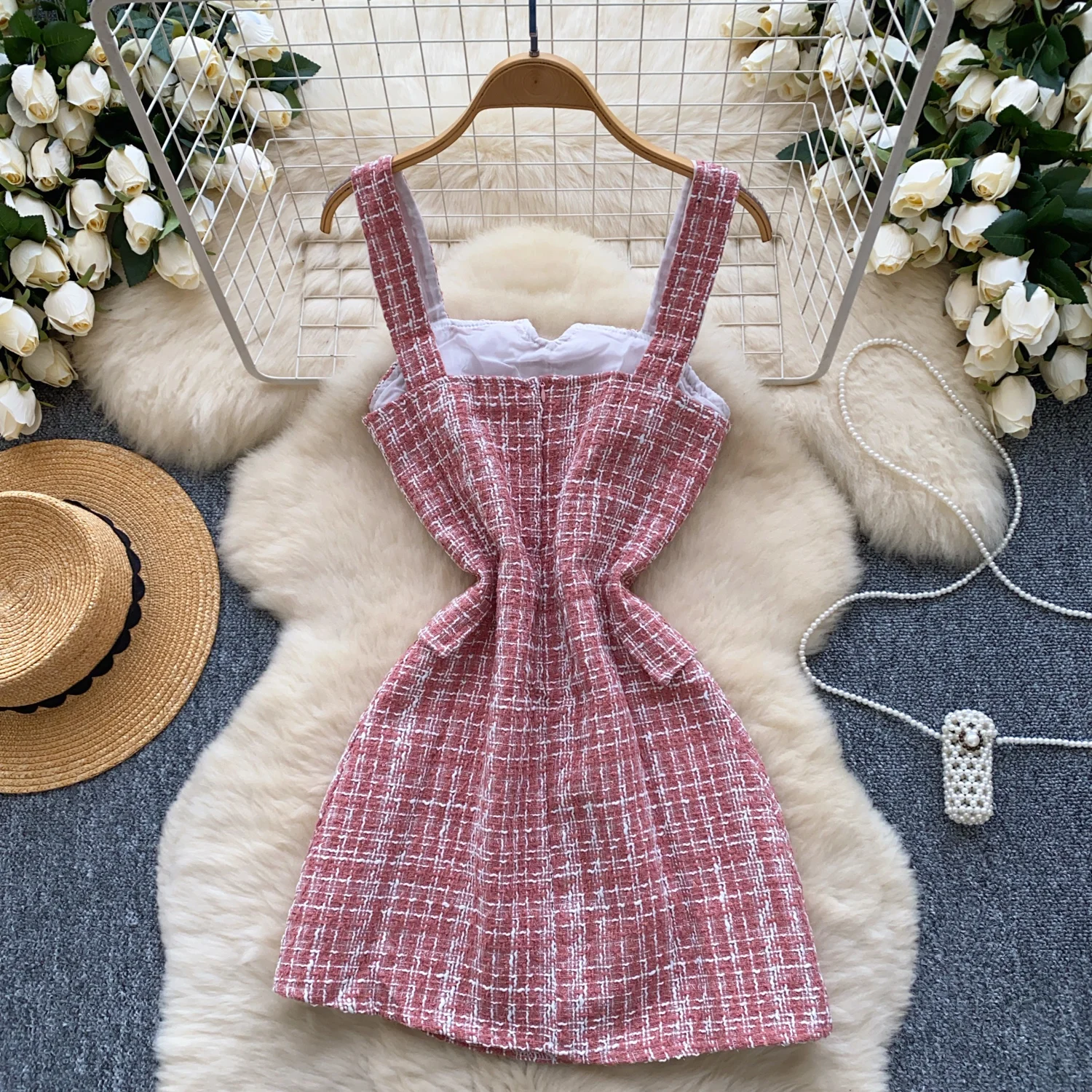 Retro 2024 Autumn Winter New Pink Plaid Woolen Sleeveless Mini Slip Dress Women's Black Button Elegant Short Tweed Dress Popular