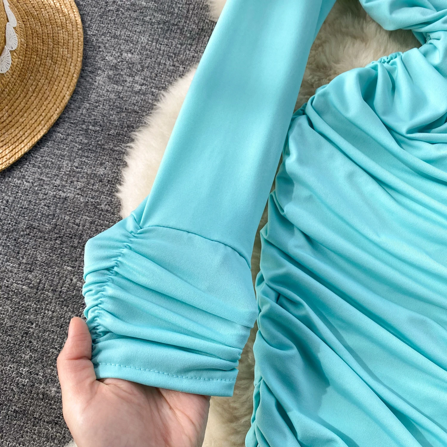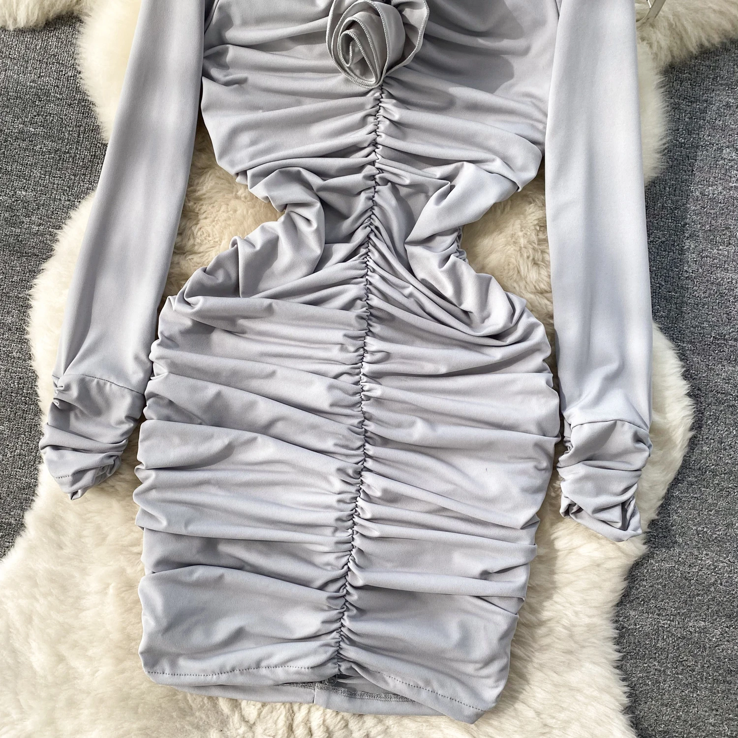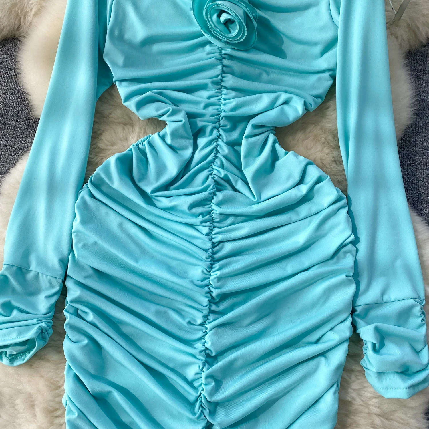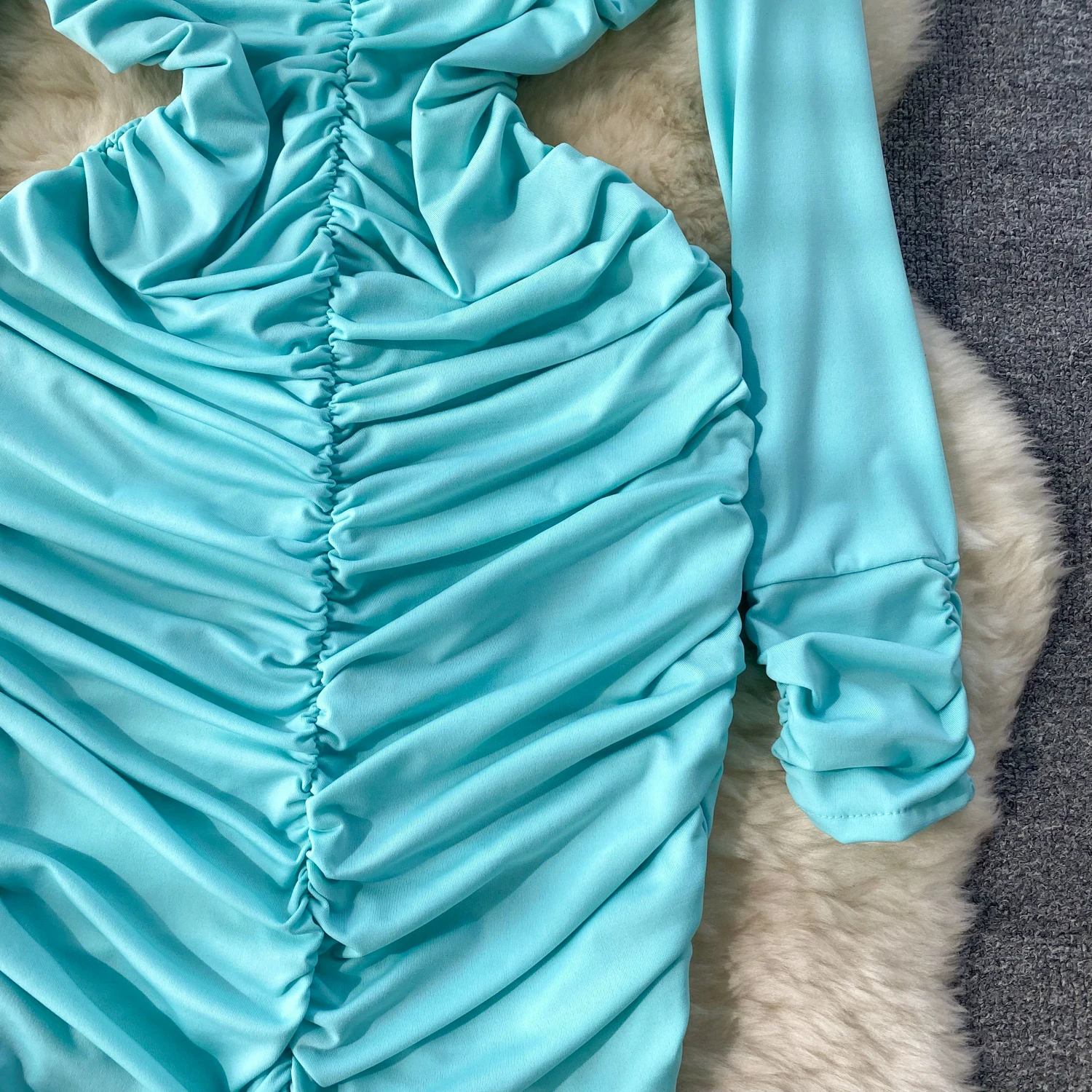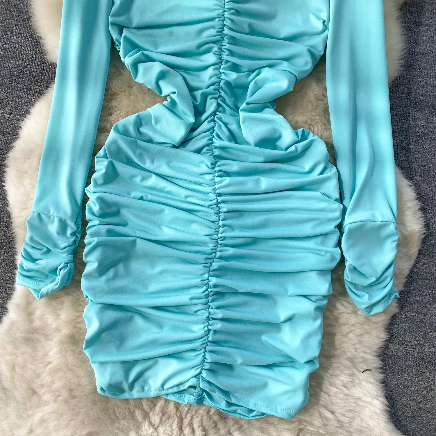 Retro Blue Bodycon Pleated Dress Women Long Sleeved Gray Dresses Women Autumn Black Sexy Club Dress Festival Night Party Dresses