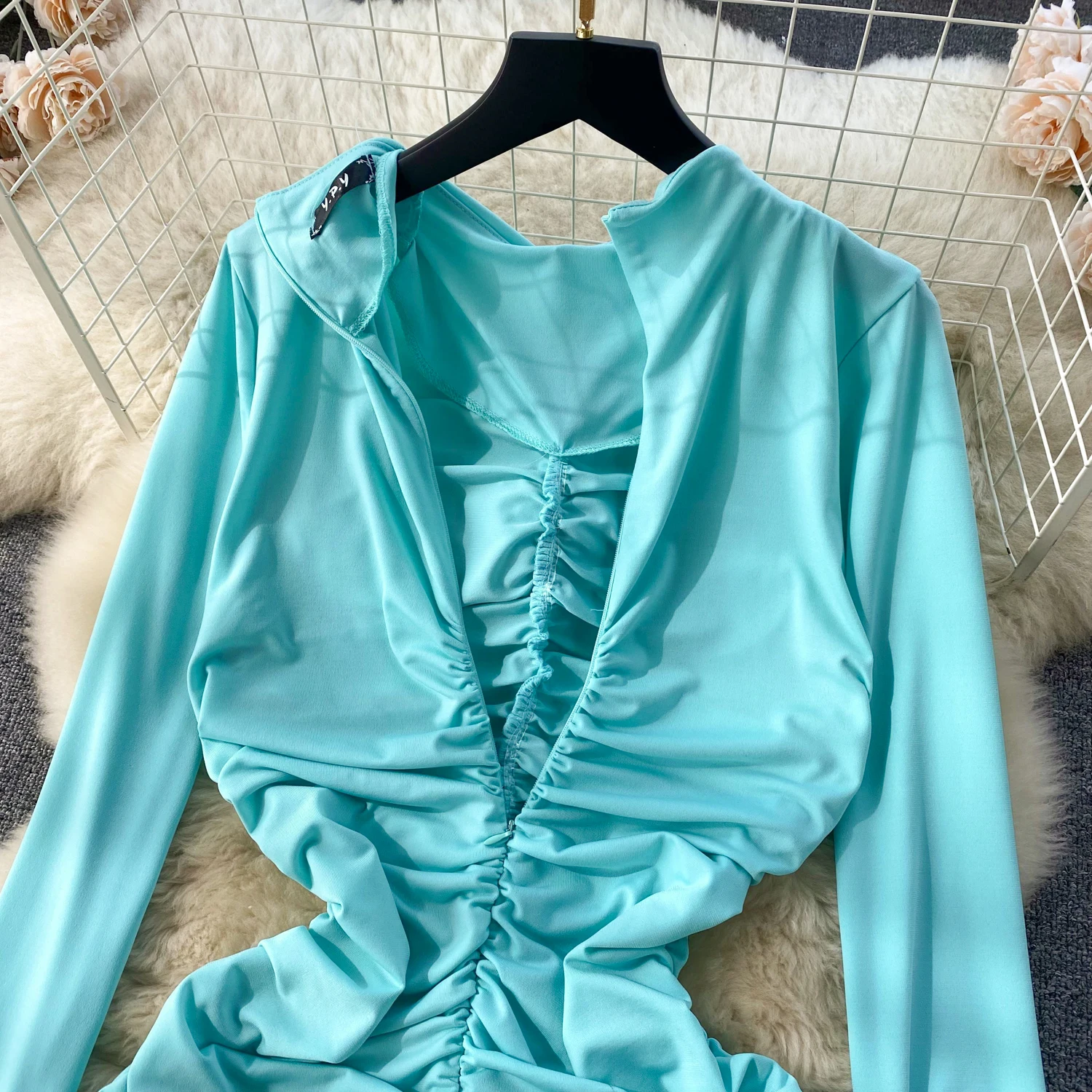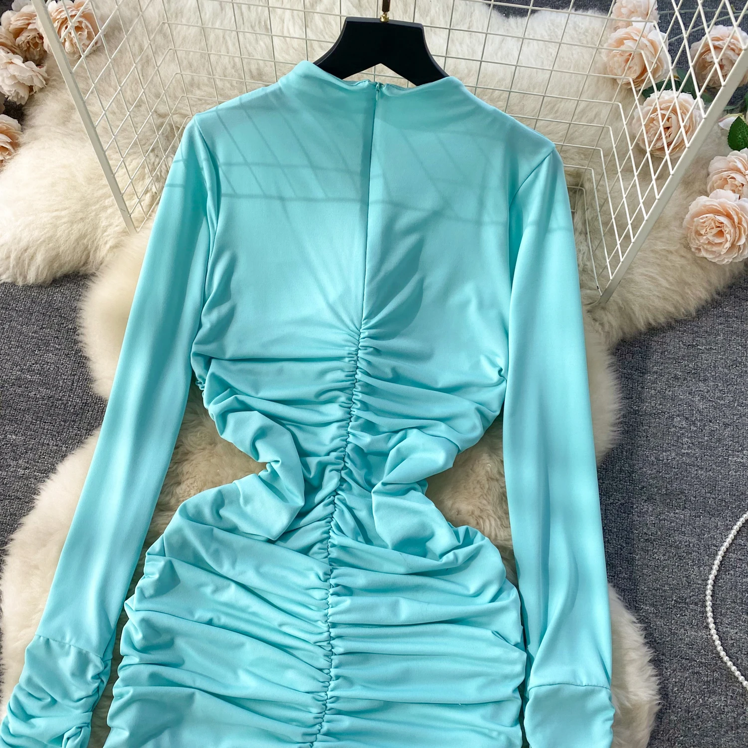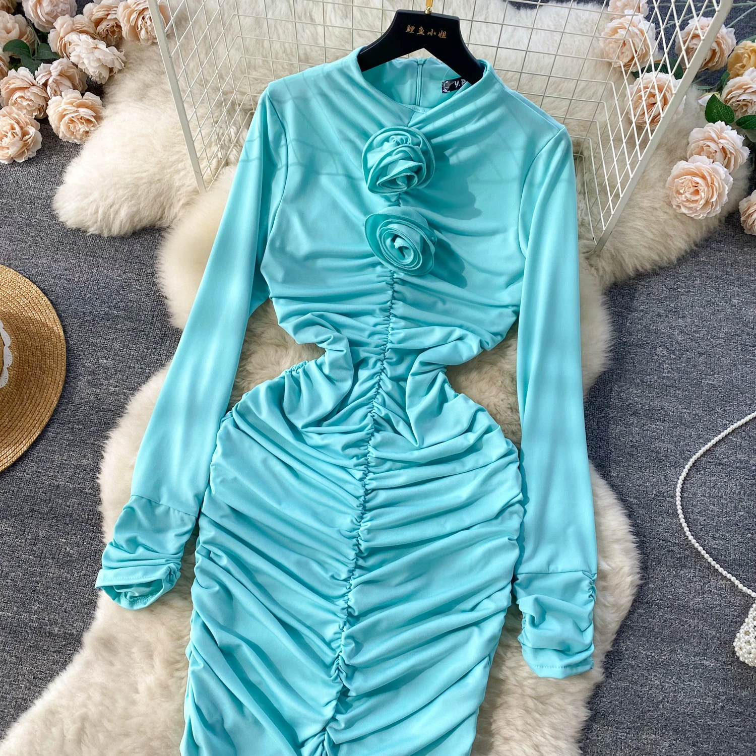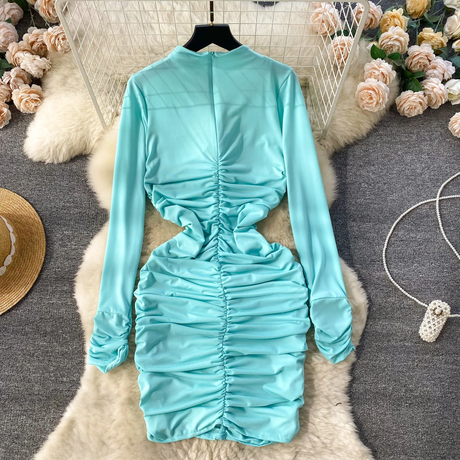 Retro Blue Bodycon Pleated Dress Women Long Sleeved Gray Dresses Women Autumn Black Sexy Club Dress Festival Night Party Dresses