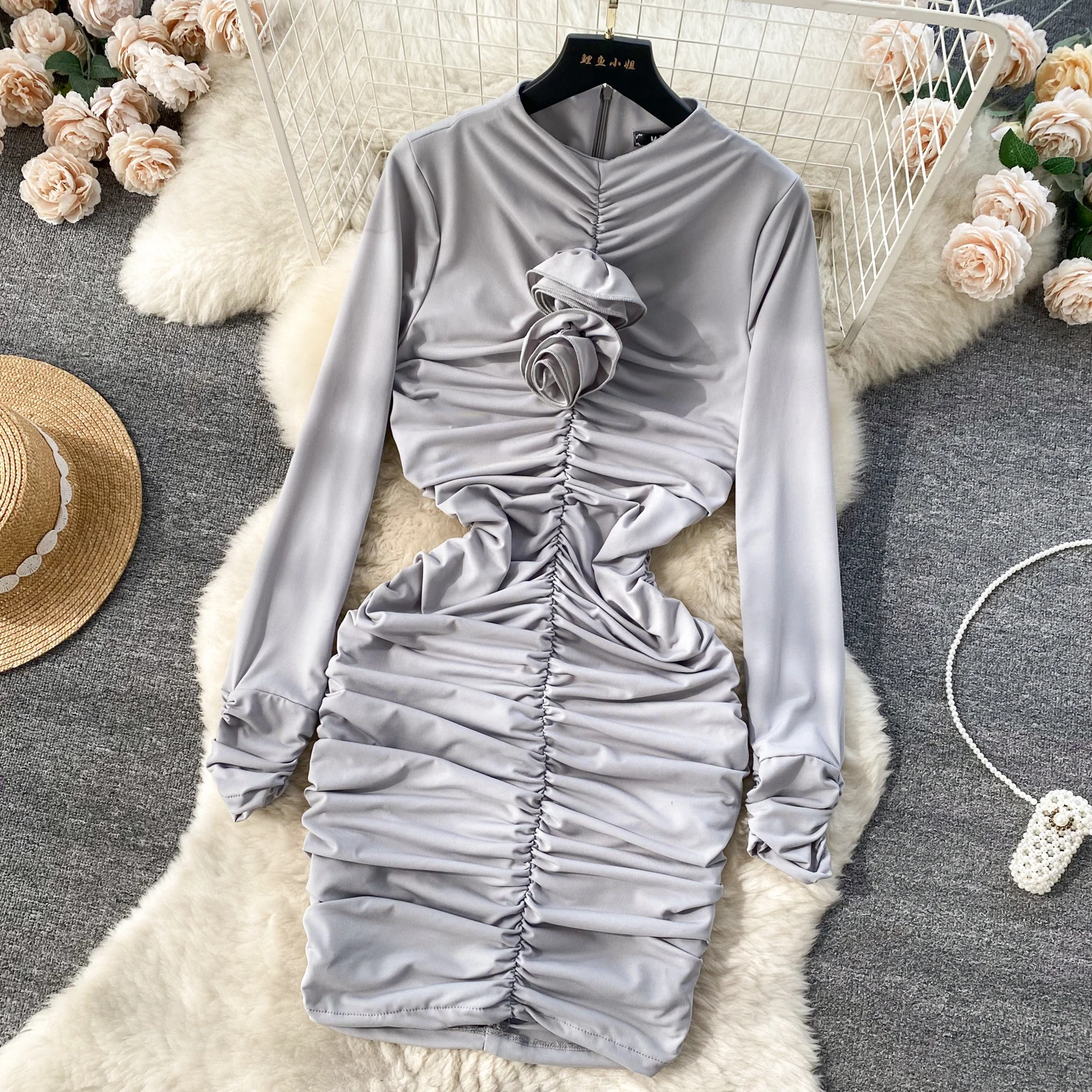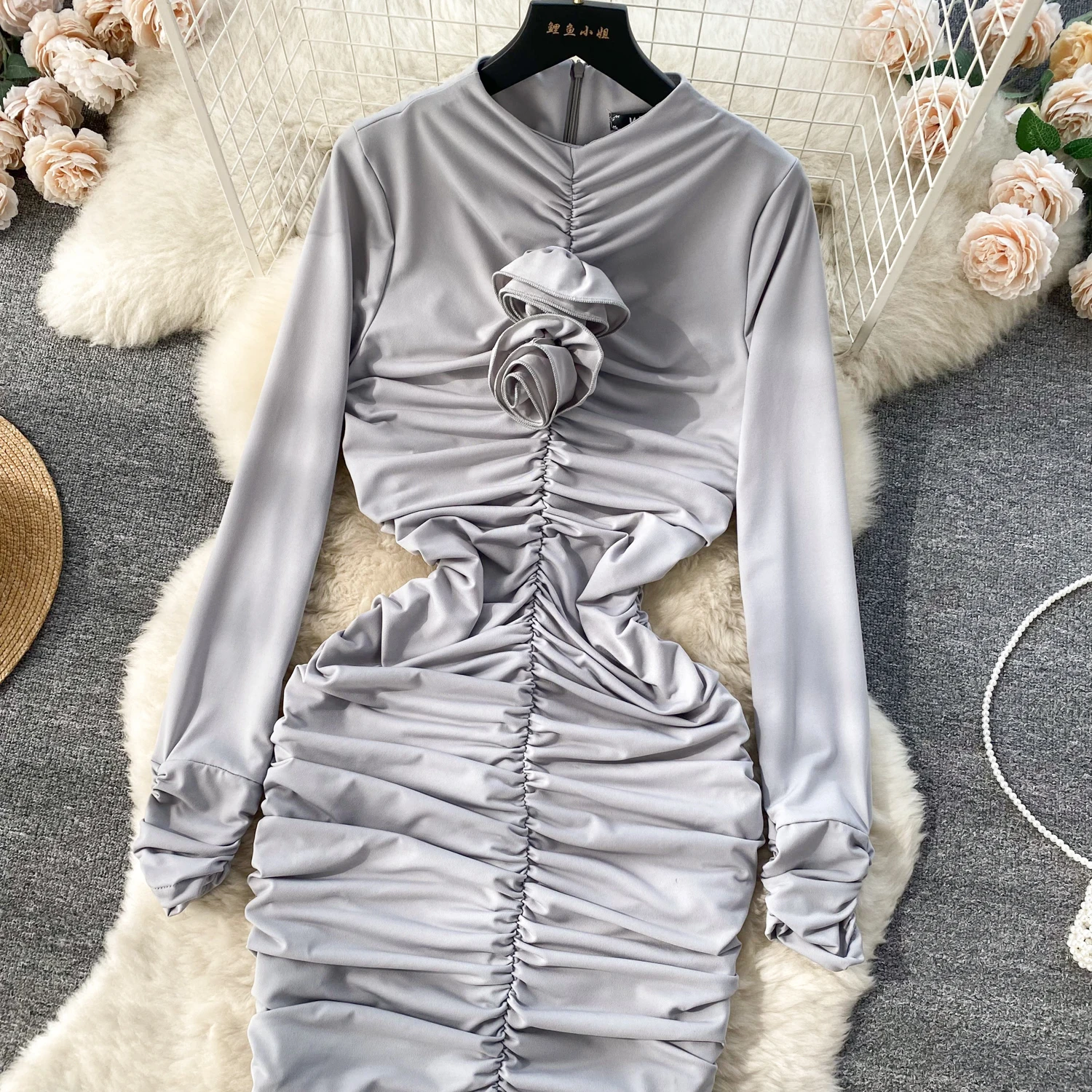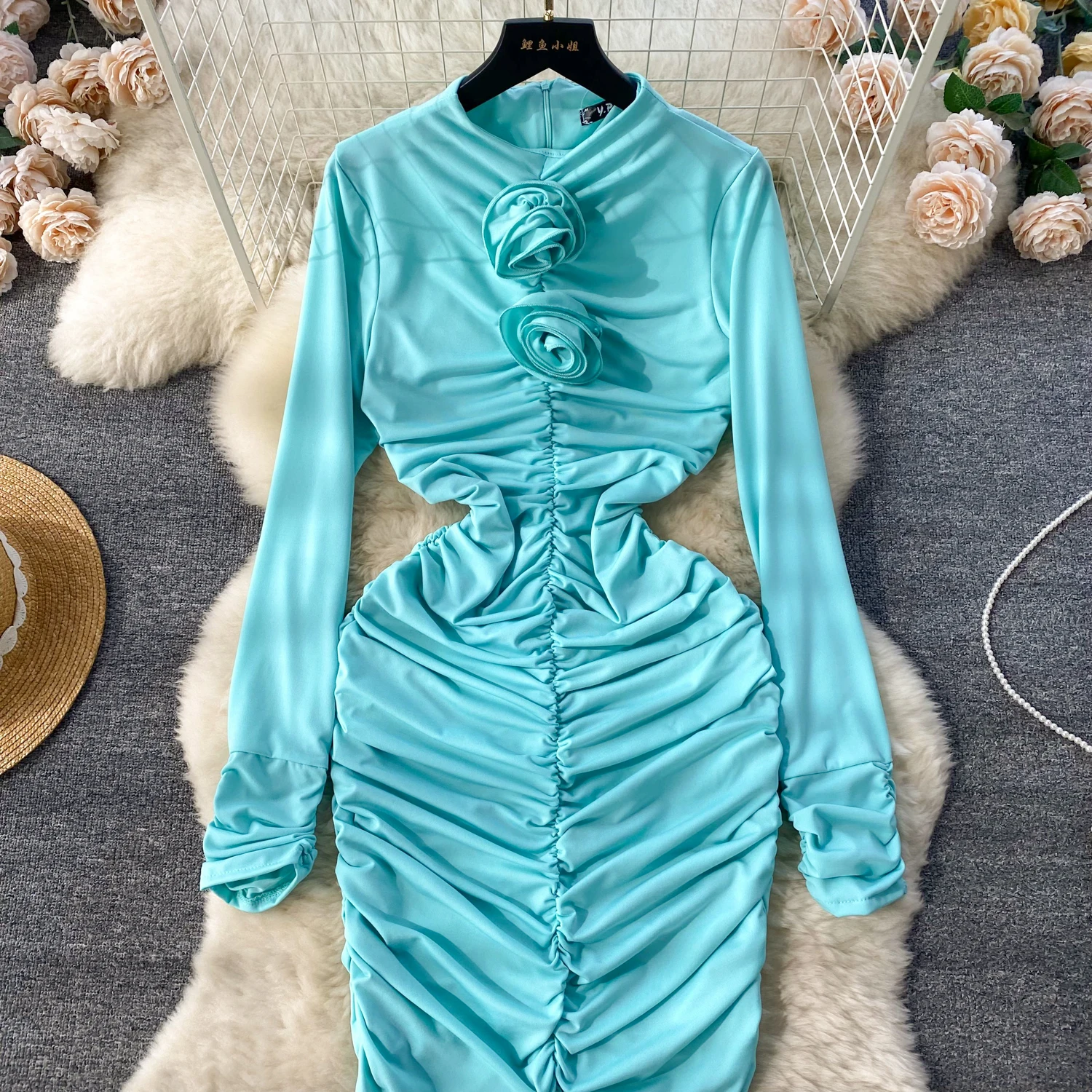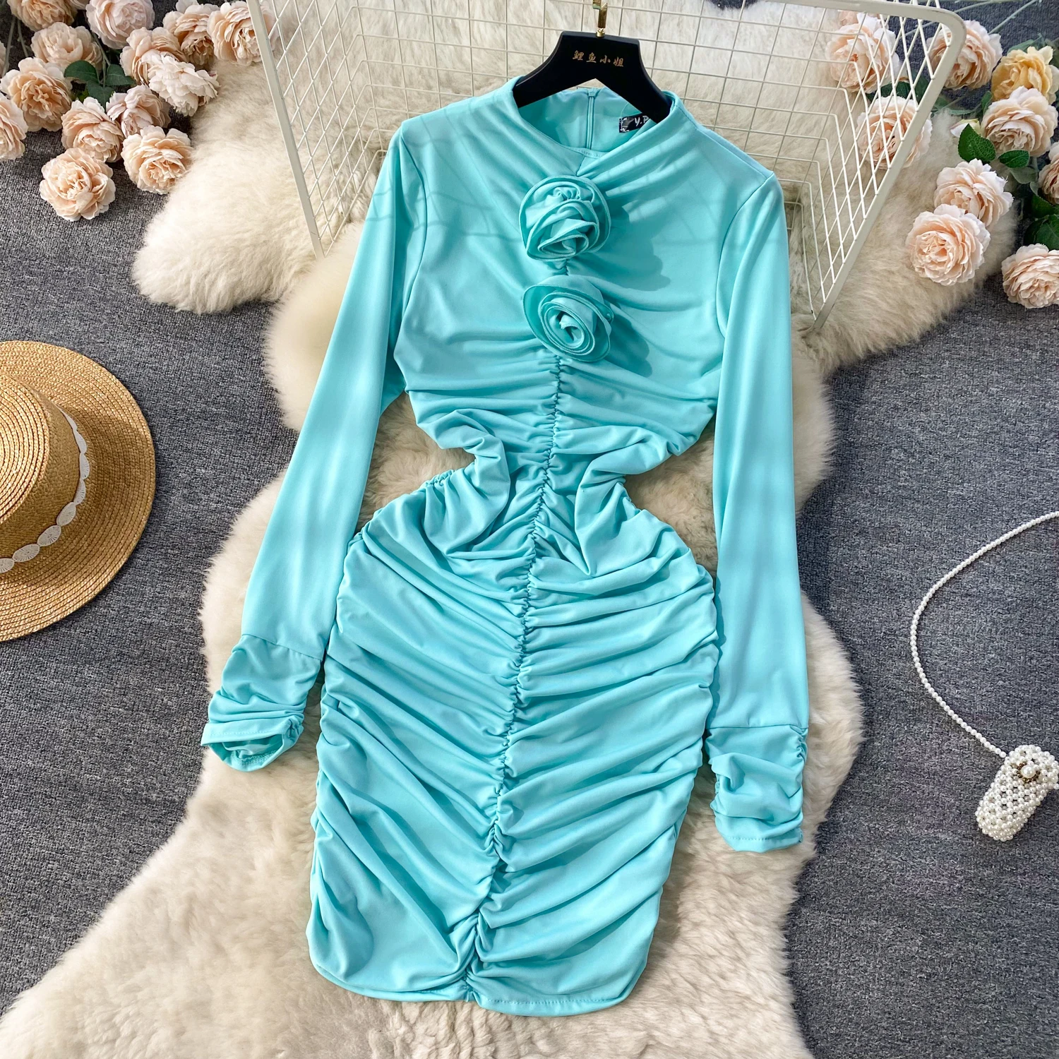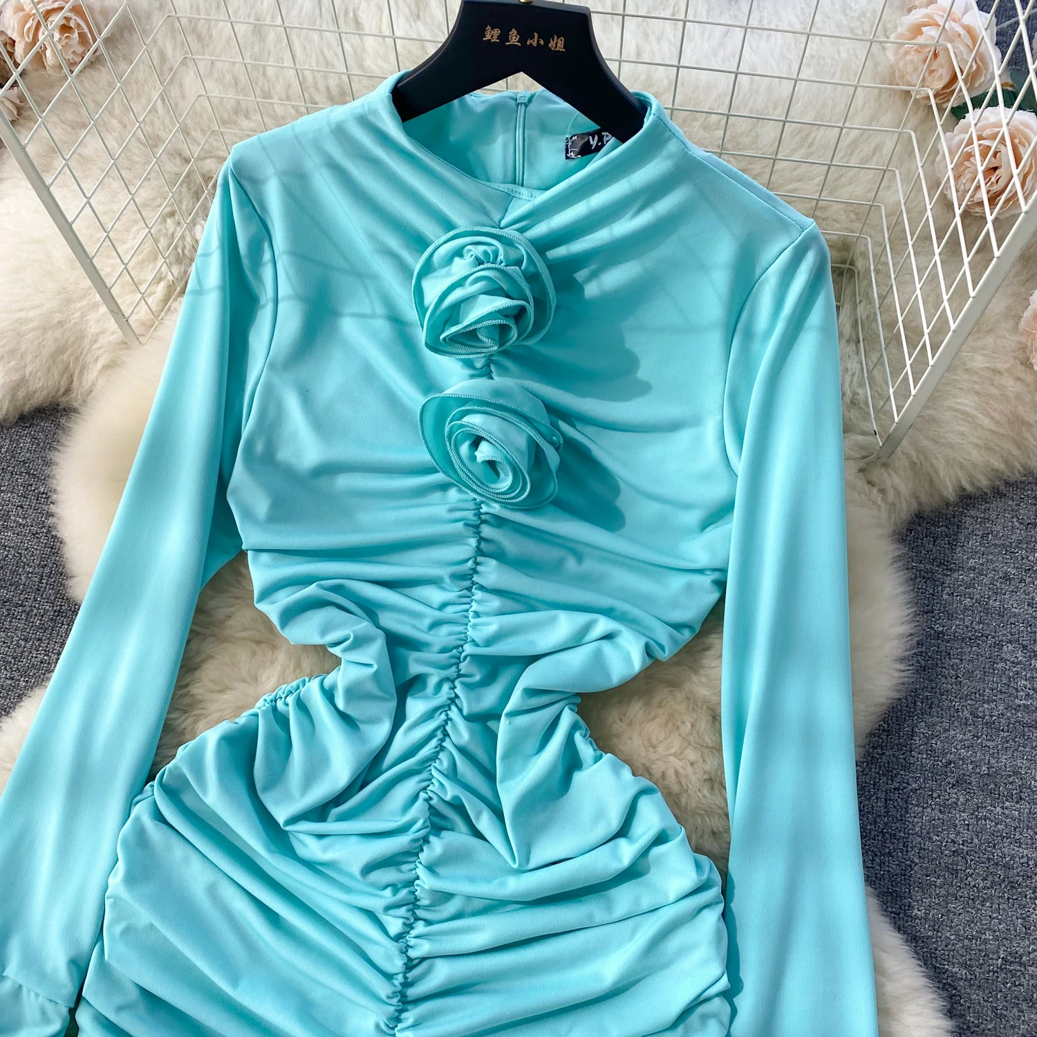 Retro Blue Bodycon Pleated Dress Women Long Sleeved Gray Dresses Women Autumn Black Sexy Club Dress Festival Night Party Dresses
