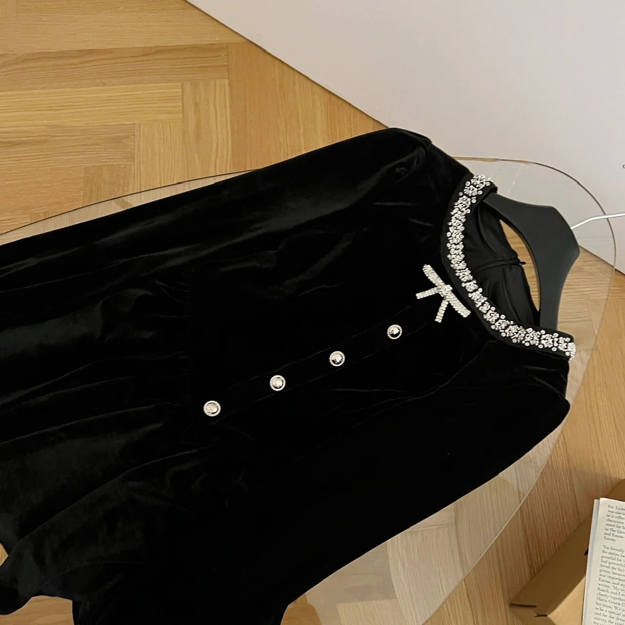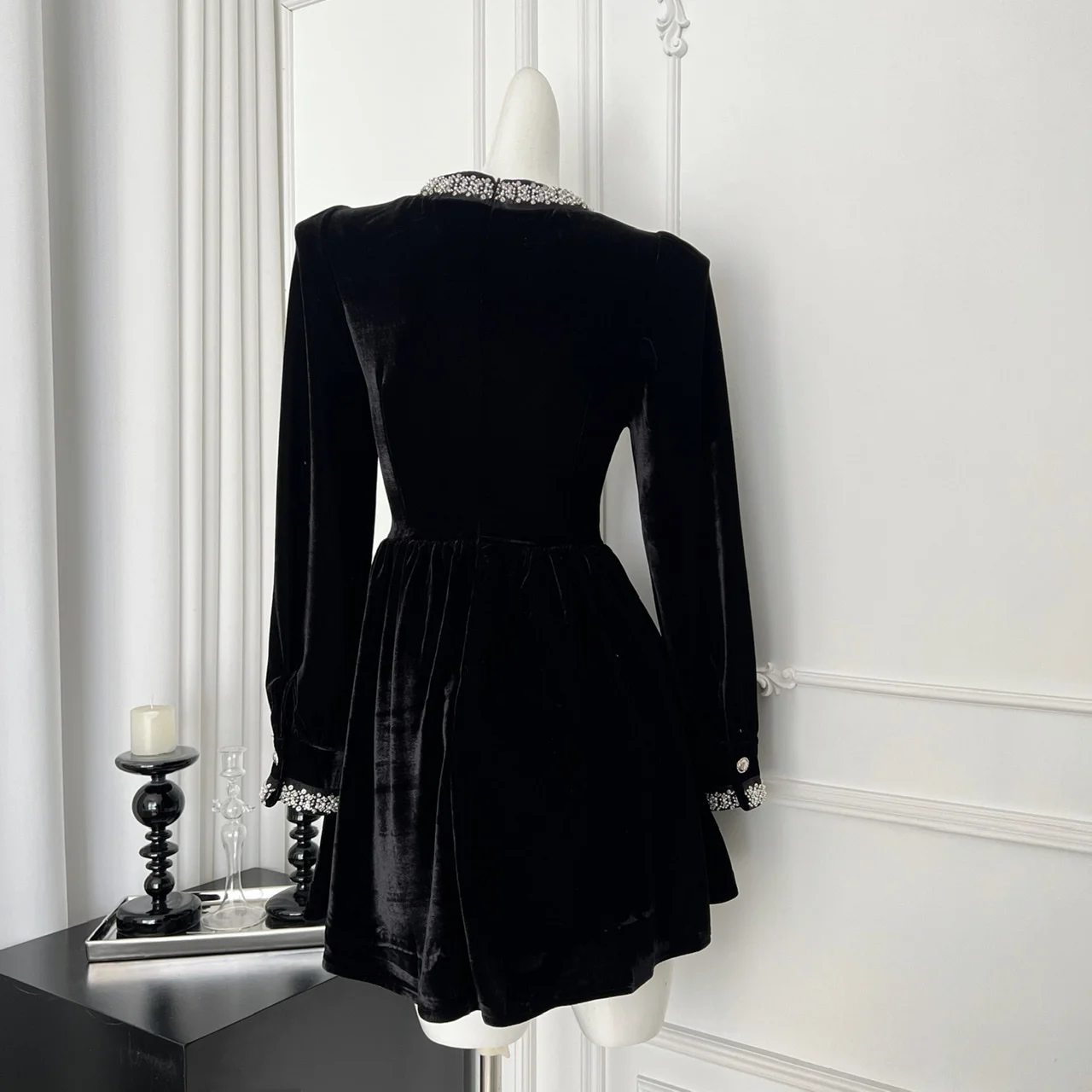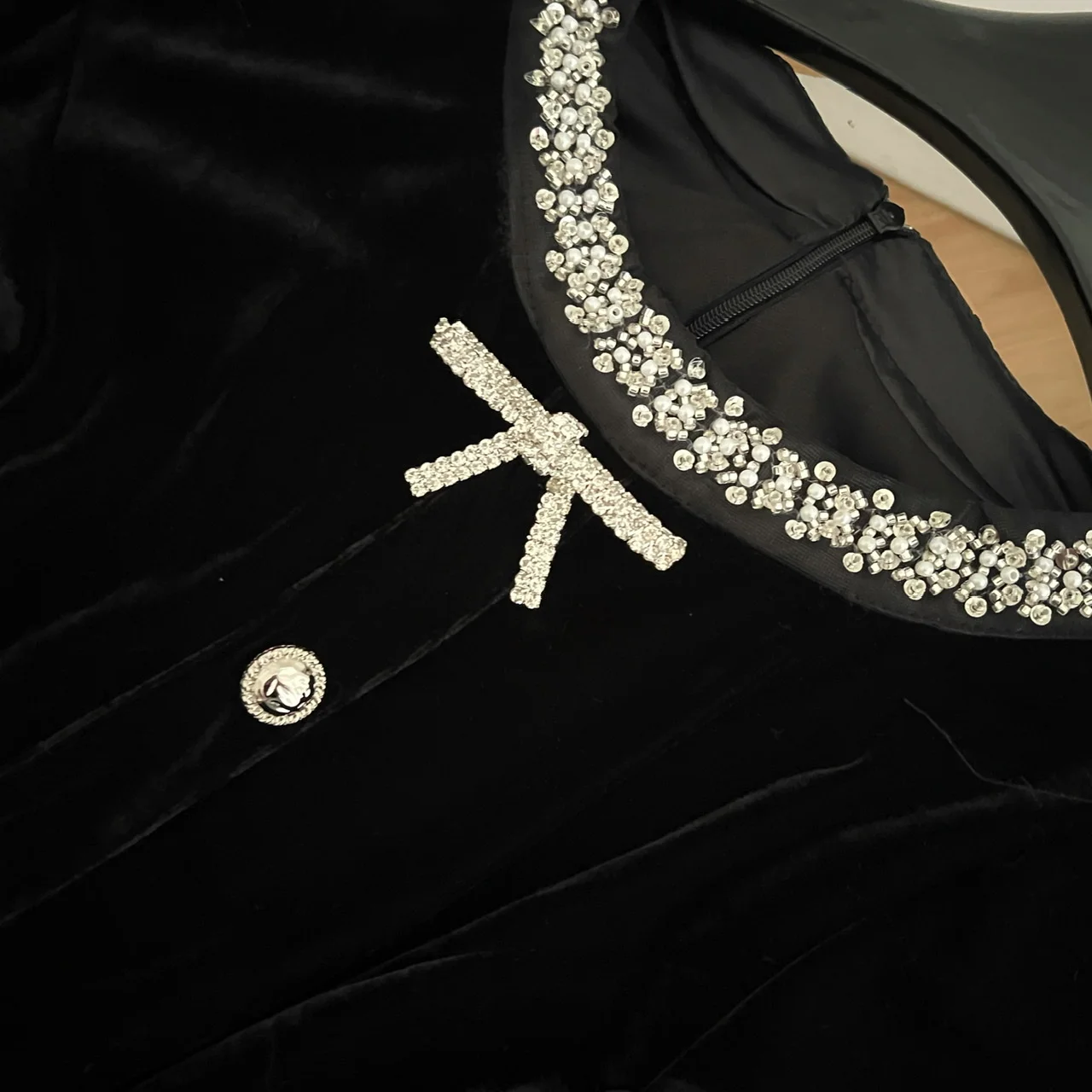 Retro Fashion Women Black Velvet Diamond Long Sleeved Bow Party Evening Short Dress Autumn Winter High Waist Pleated Mini Dress