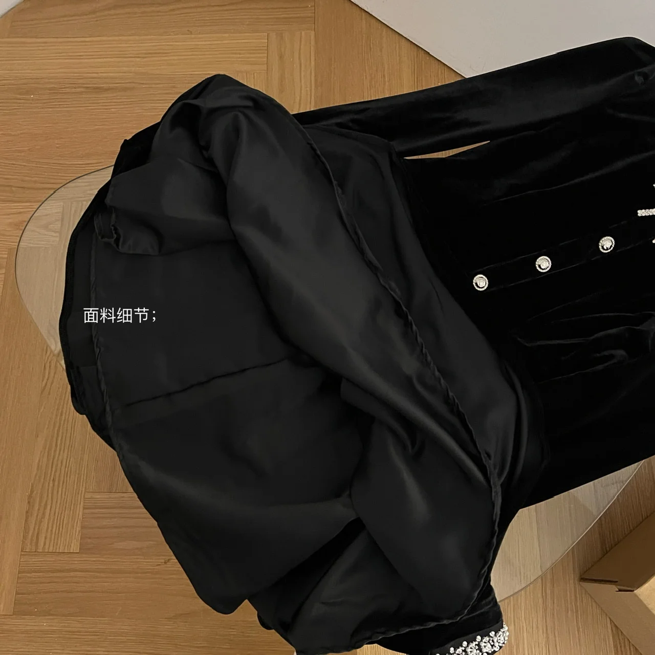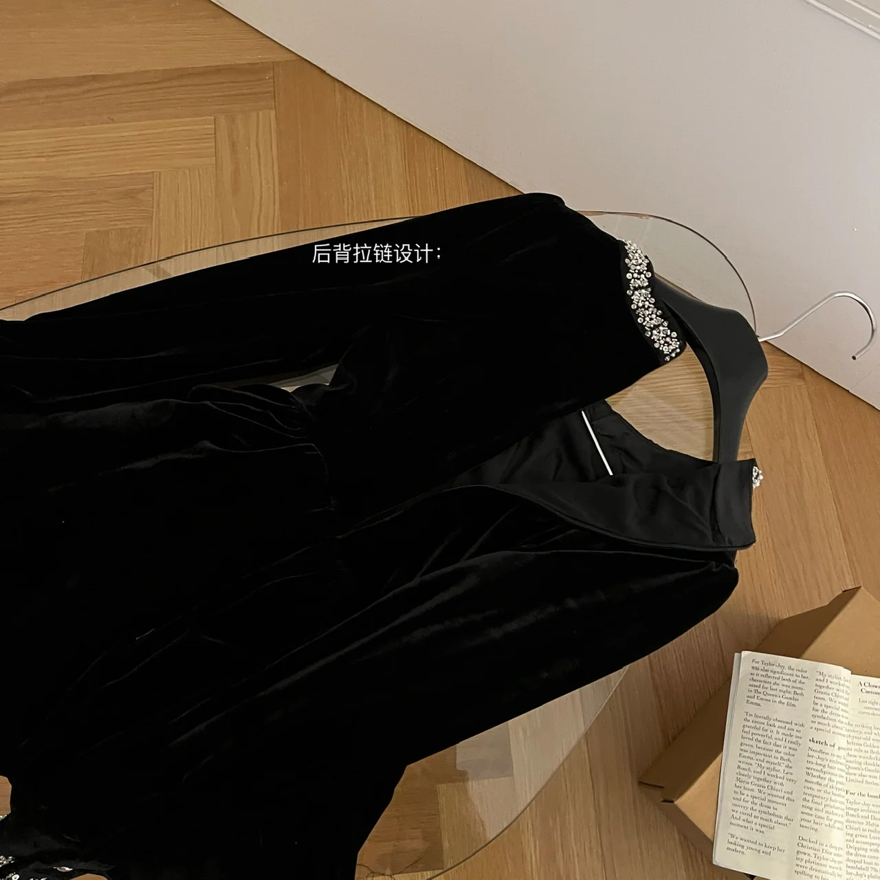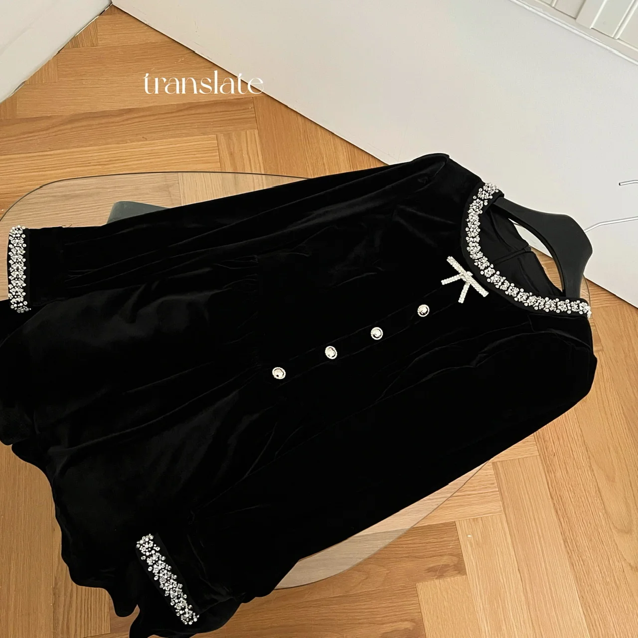 Retro Fashion Women Black Velvet Diamond Long Sleeved Bow Party Evening Short Dress Autumn Winter High Waist Pleated Mini Dress