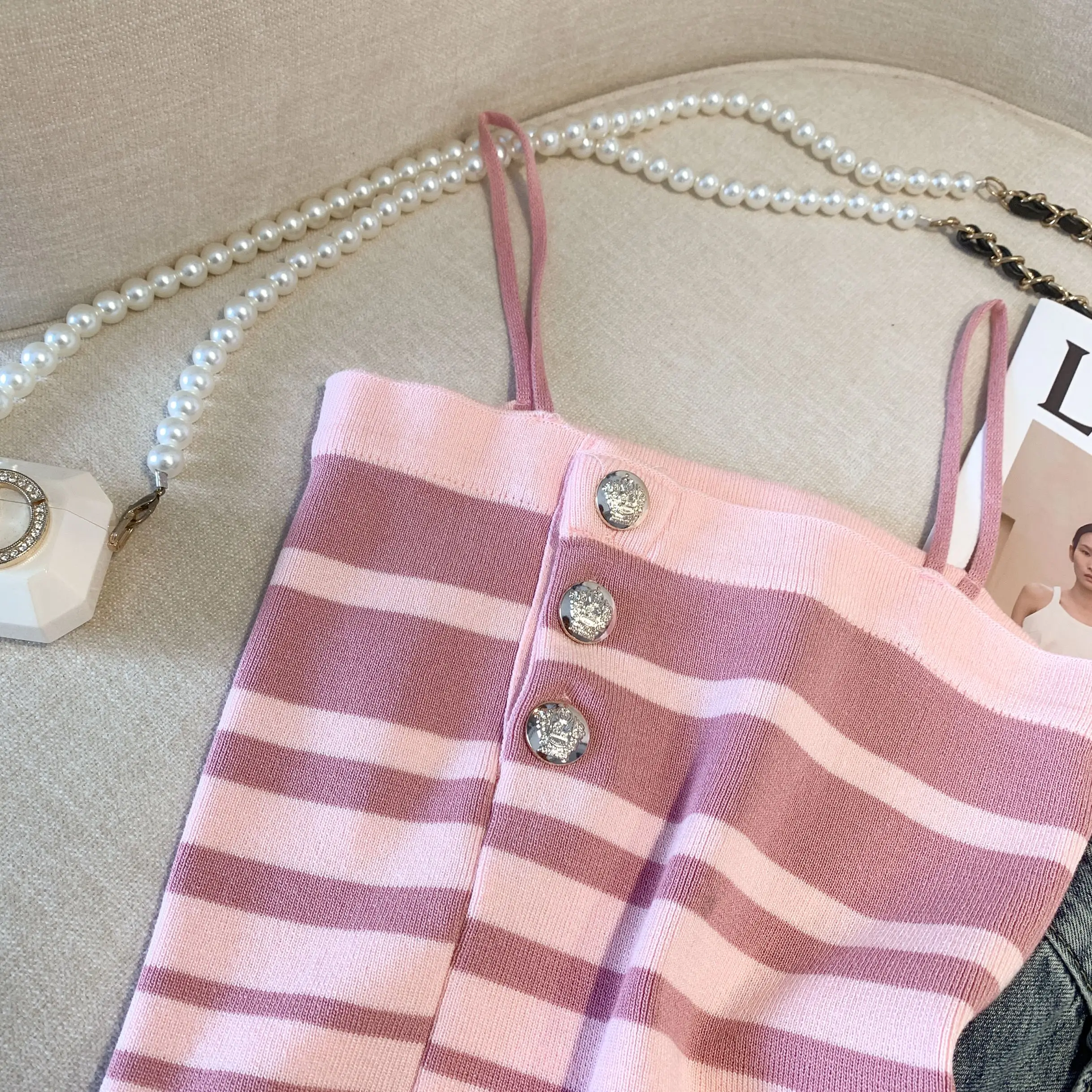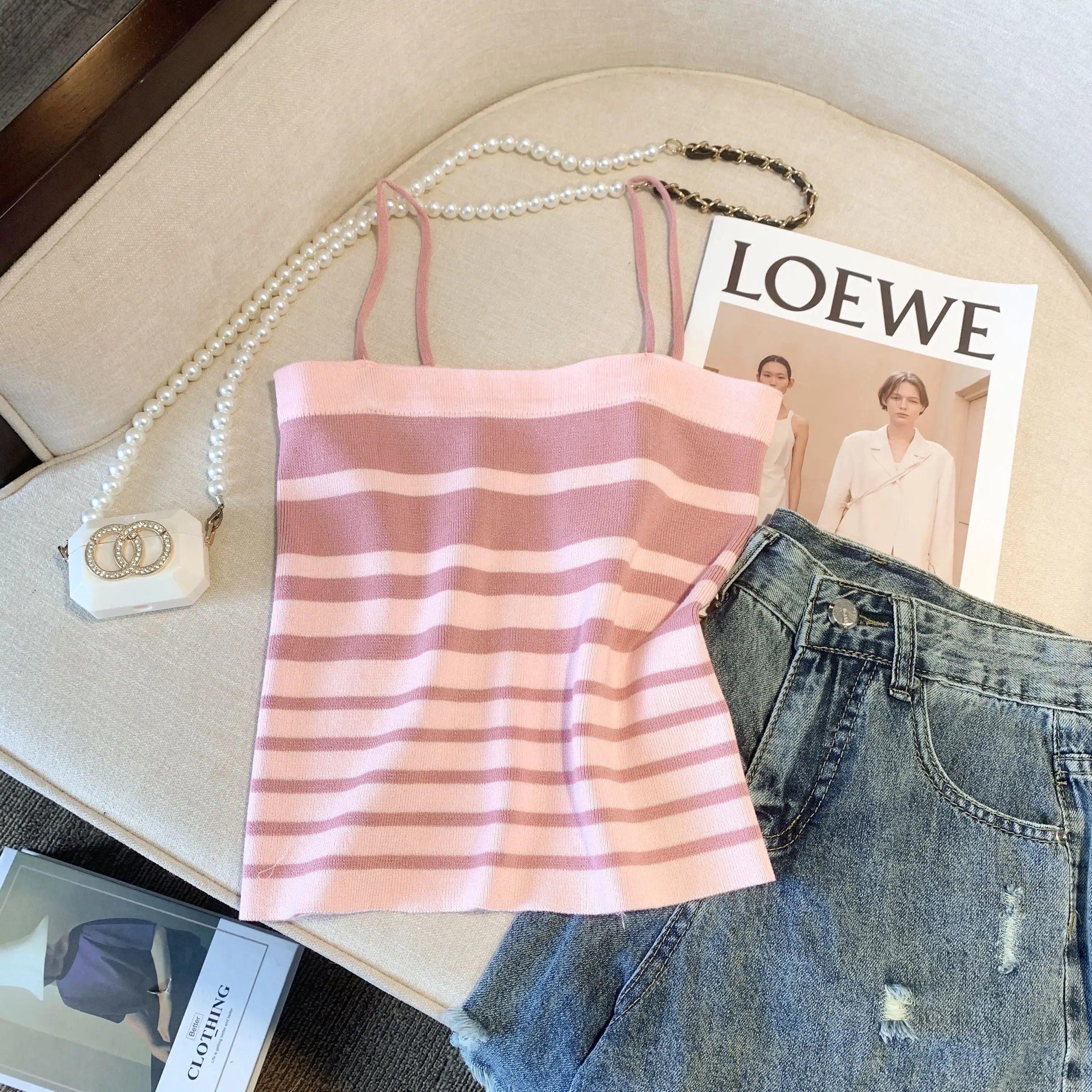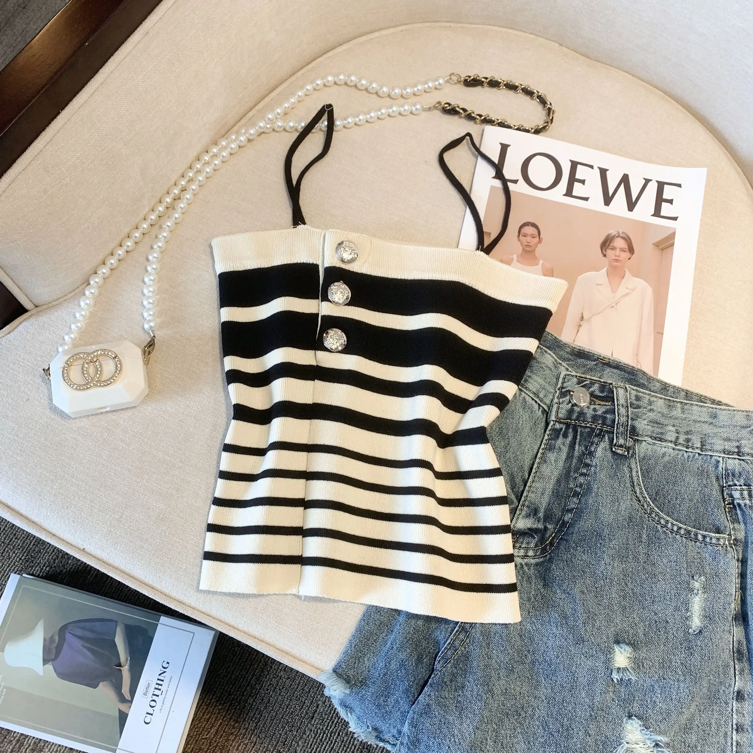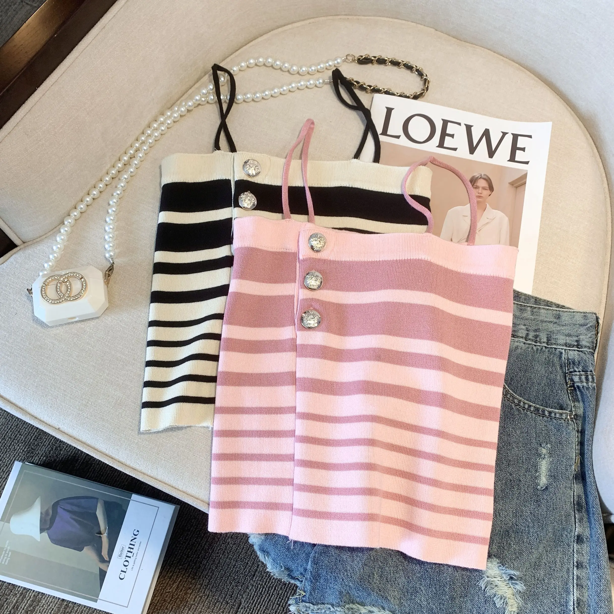 Retro Women Black White Striped Knit Crochet Top Summer Sexy Pink Patchwork Backless Single Breasted Short Spaghetti Strap Tops