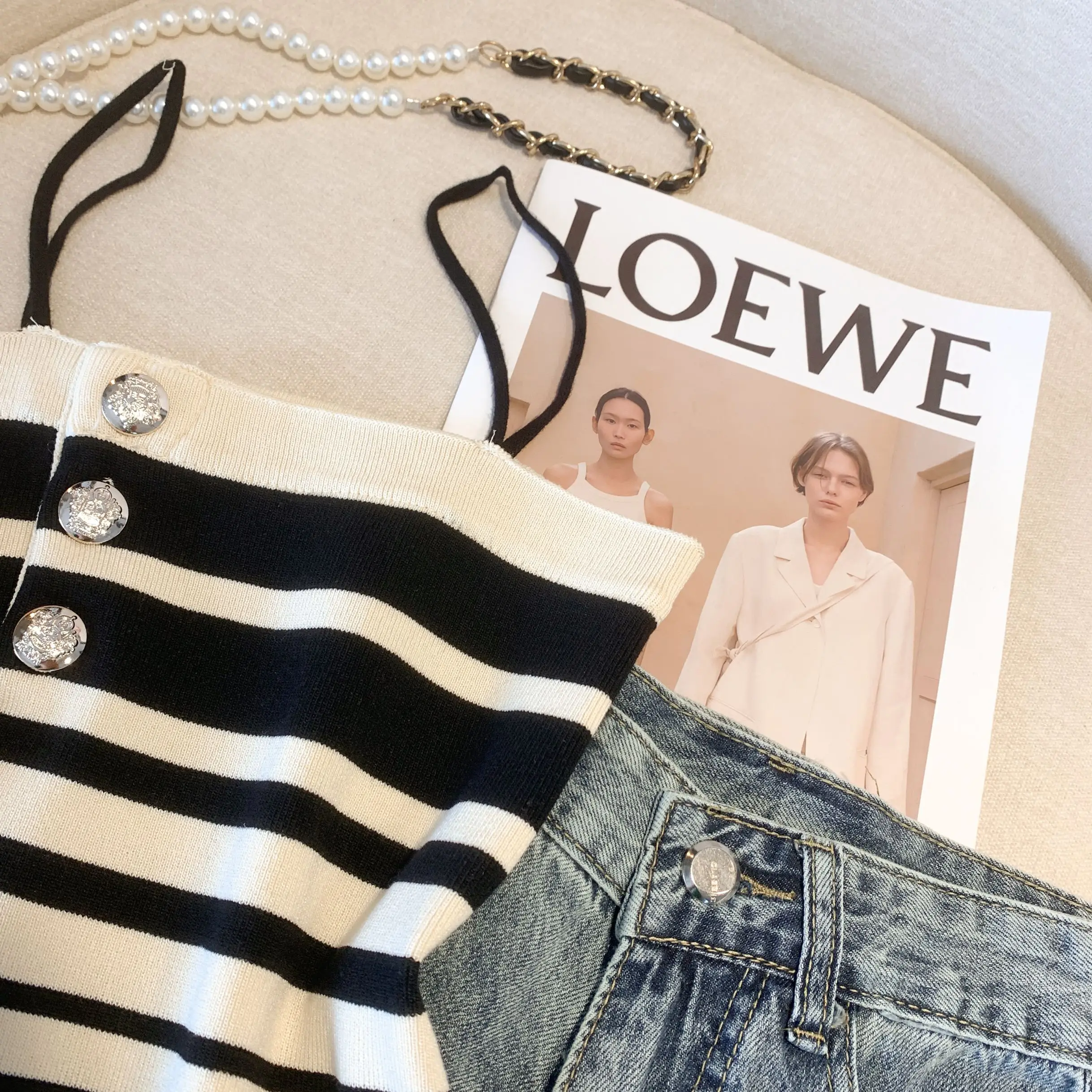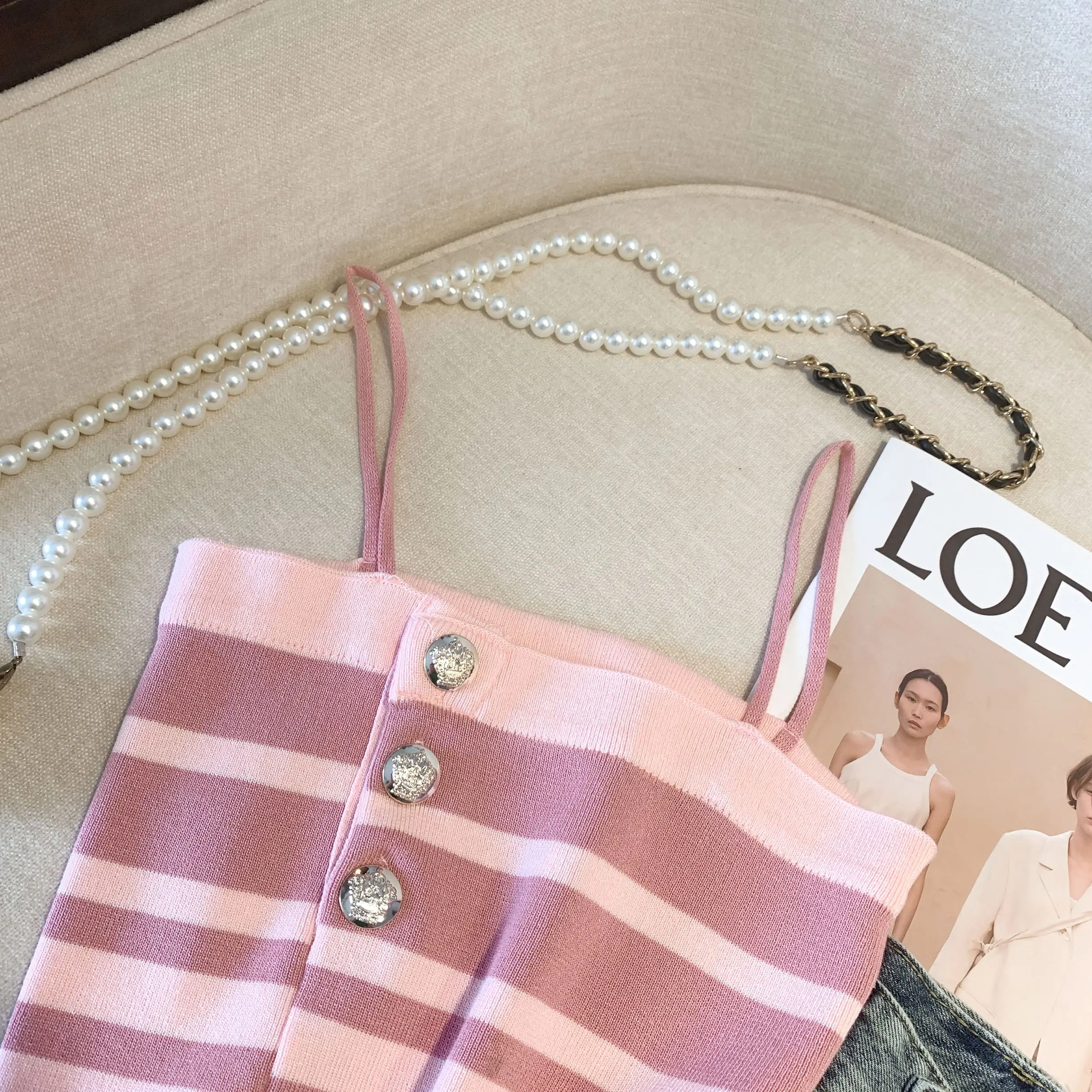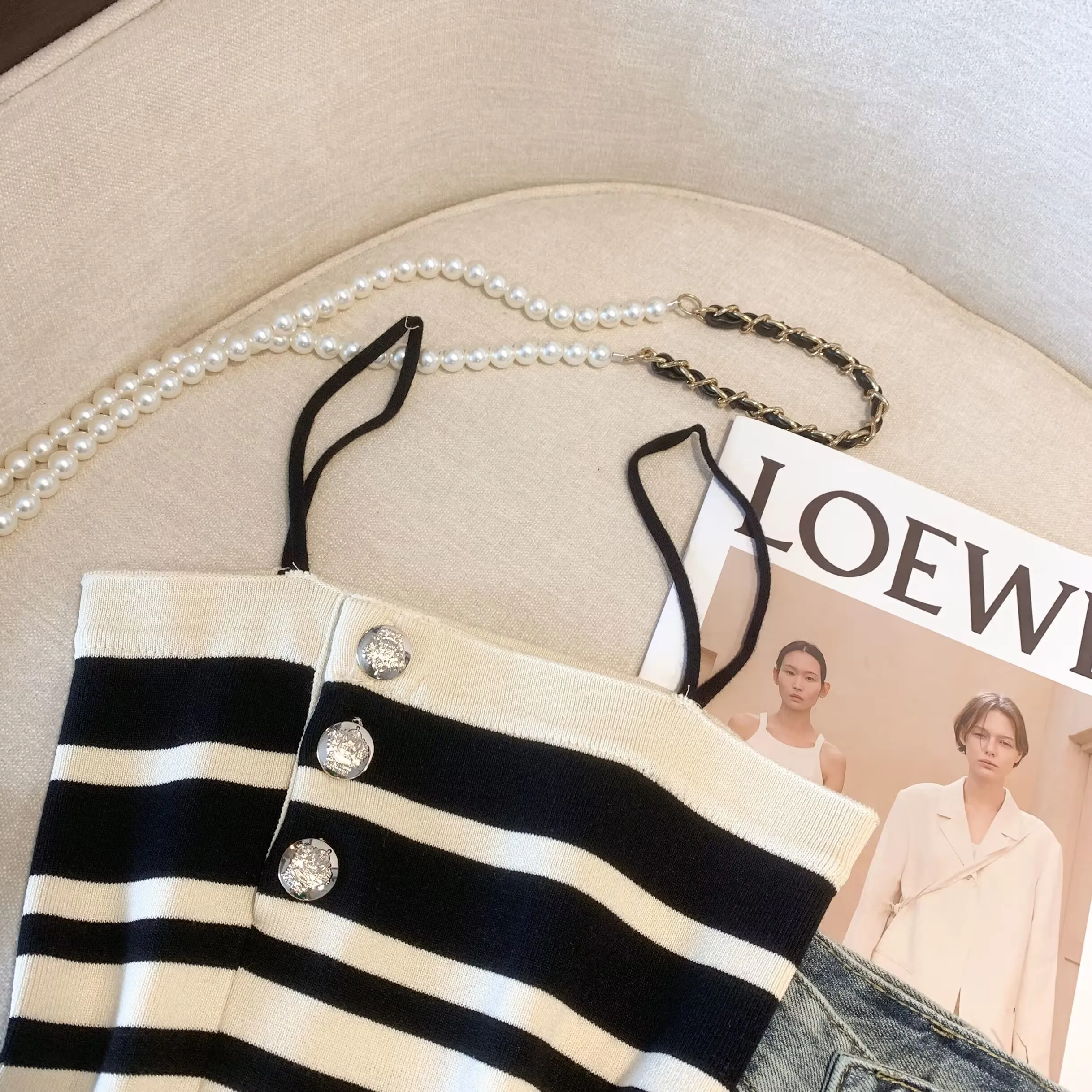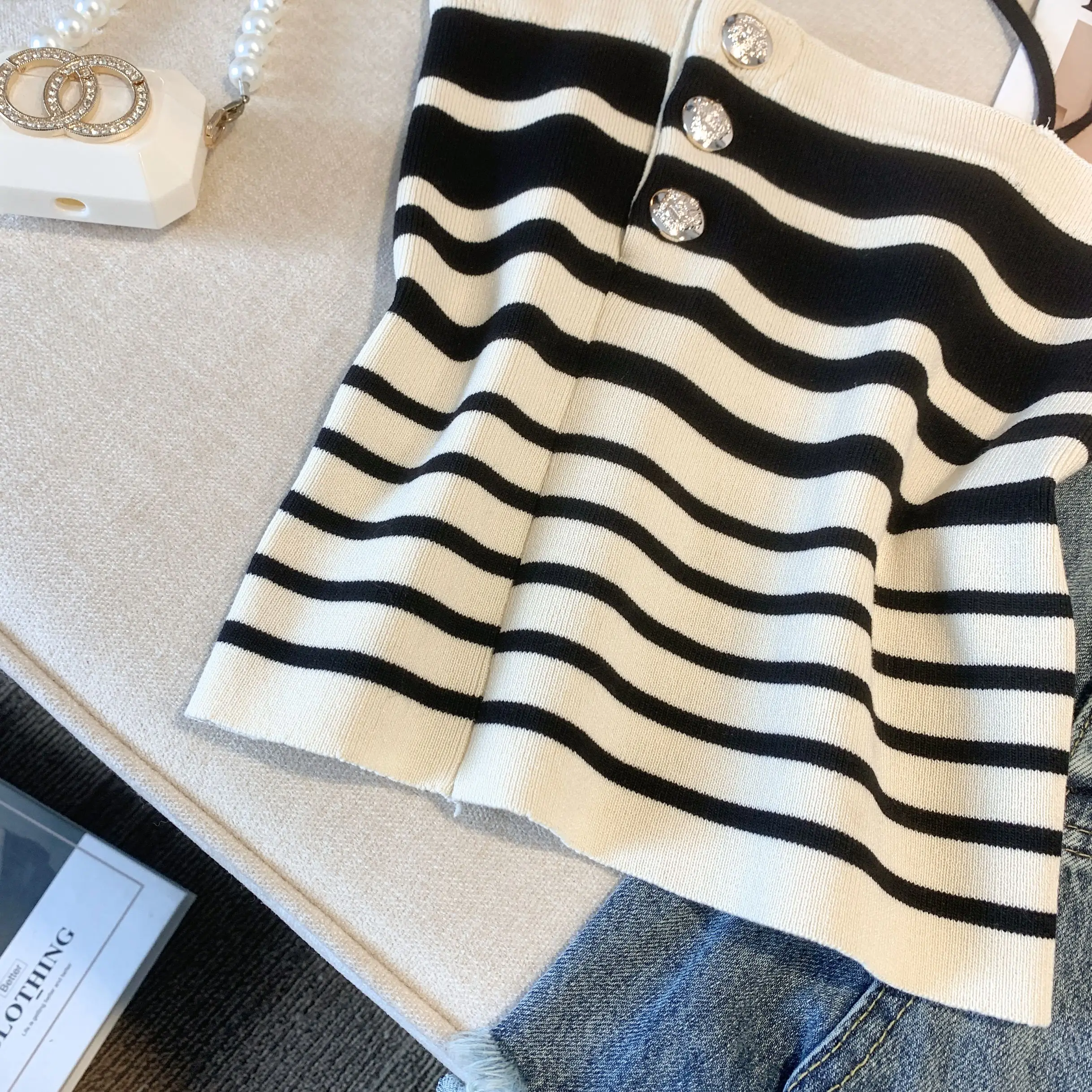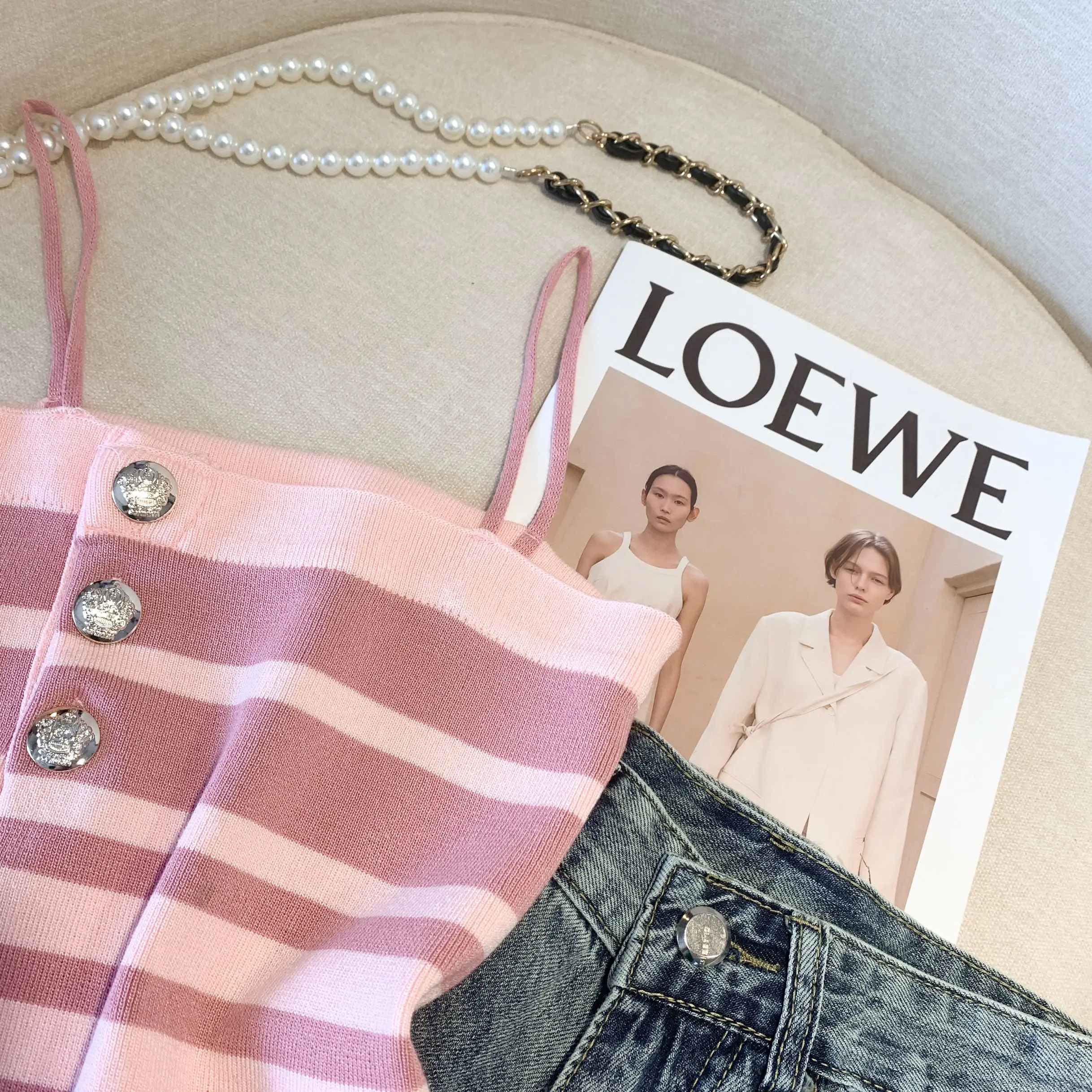 Retro Women Black White Striped Knit Crochet Top Summer Sexy Pink Patchwork Backless Single Breasted Short Spaghetti Strap Tops