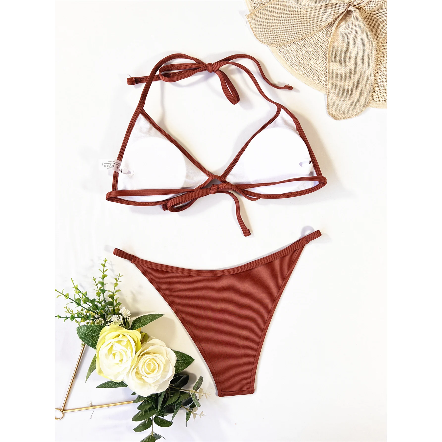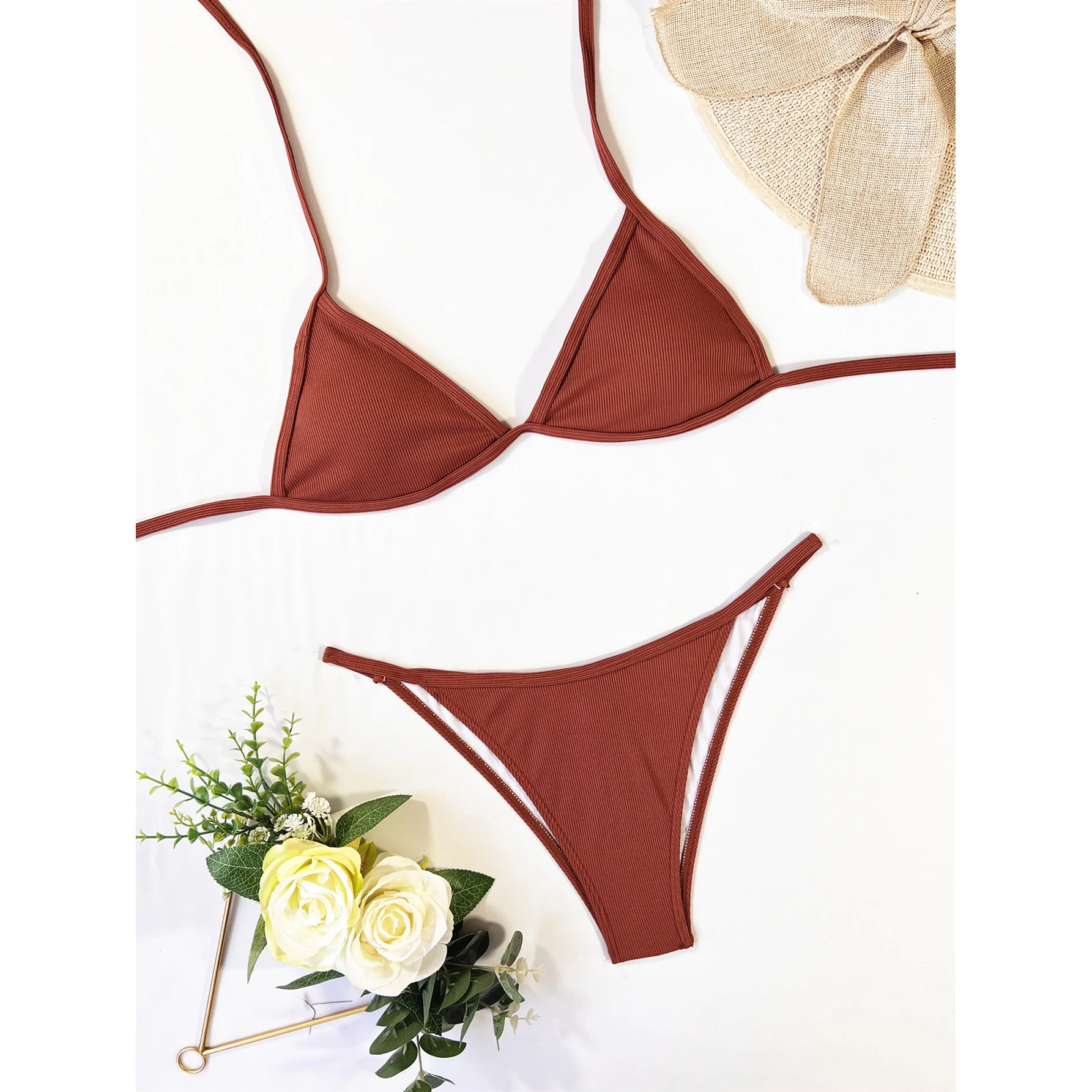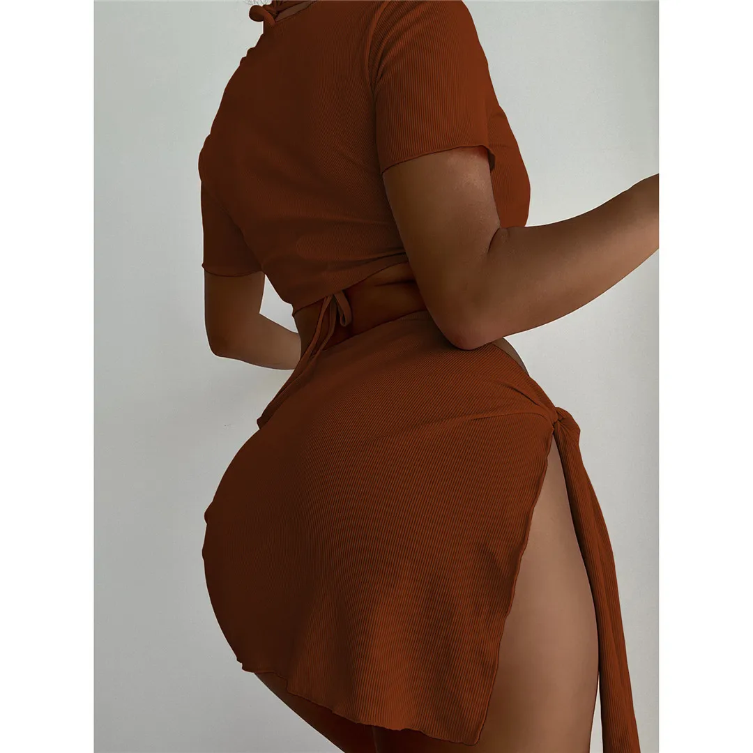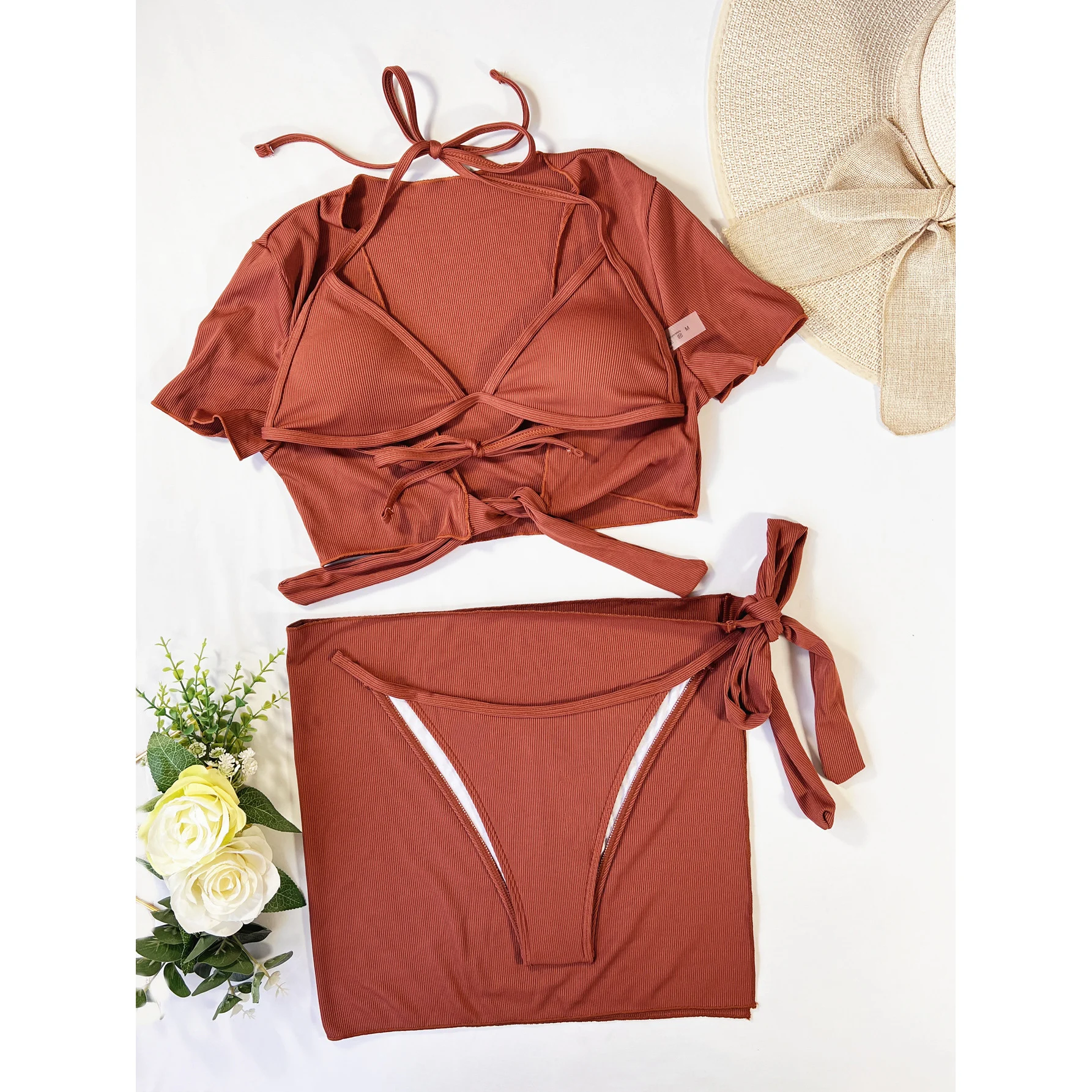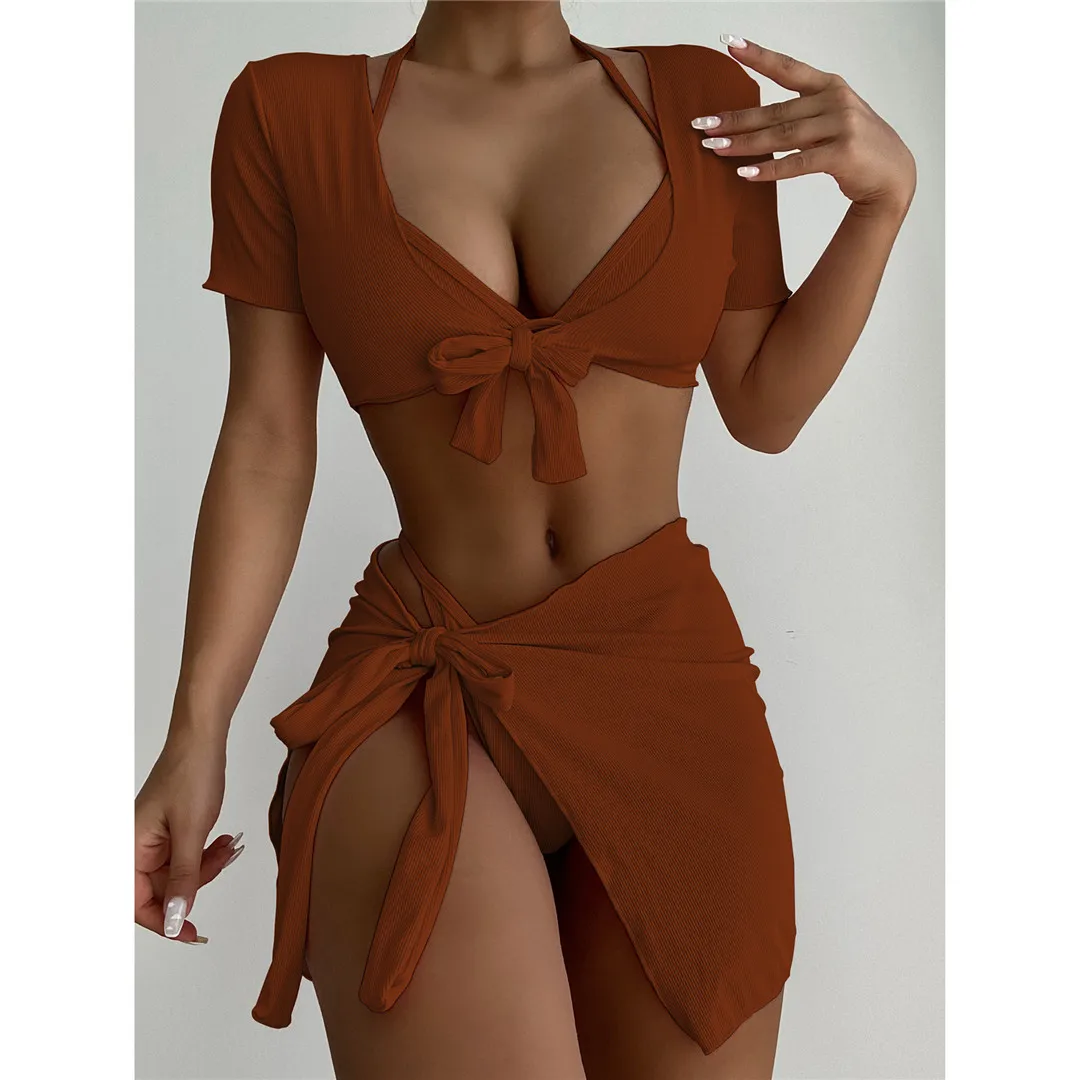 Ribbed Halter Bikini Female Swimsuit Women Swimwear Four-pieces Bikini set With Top Sarong Bather Bathing Suit Swim V3152