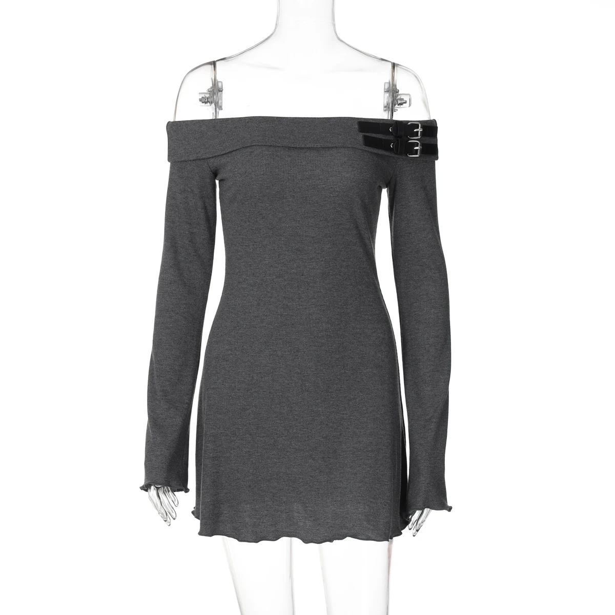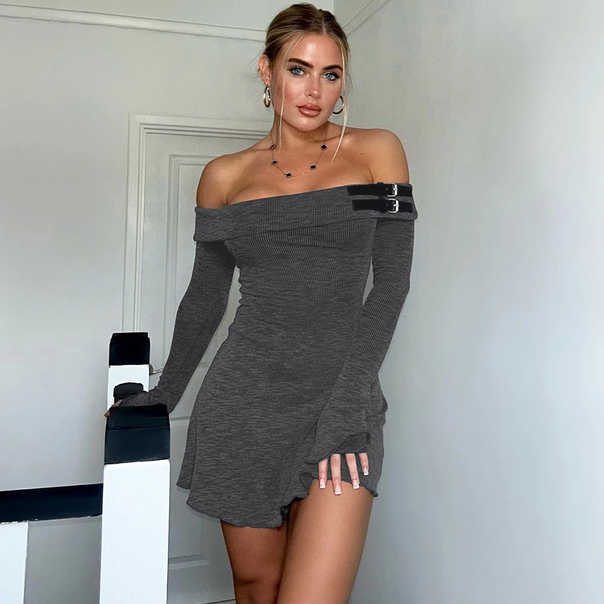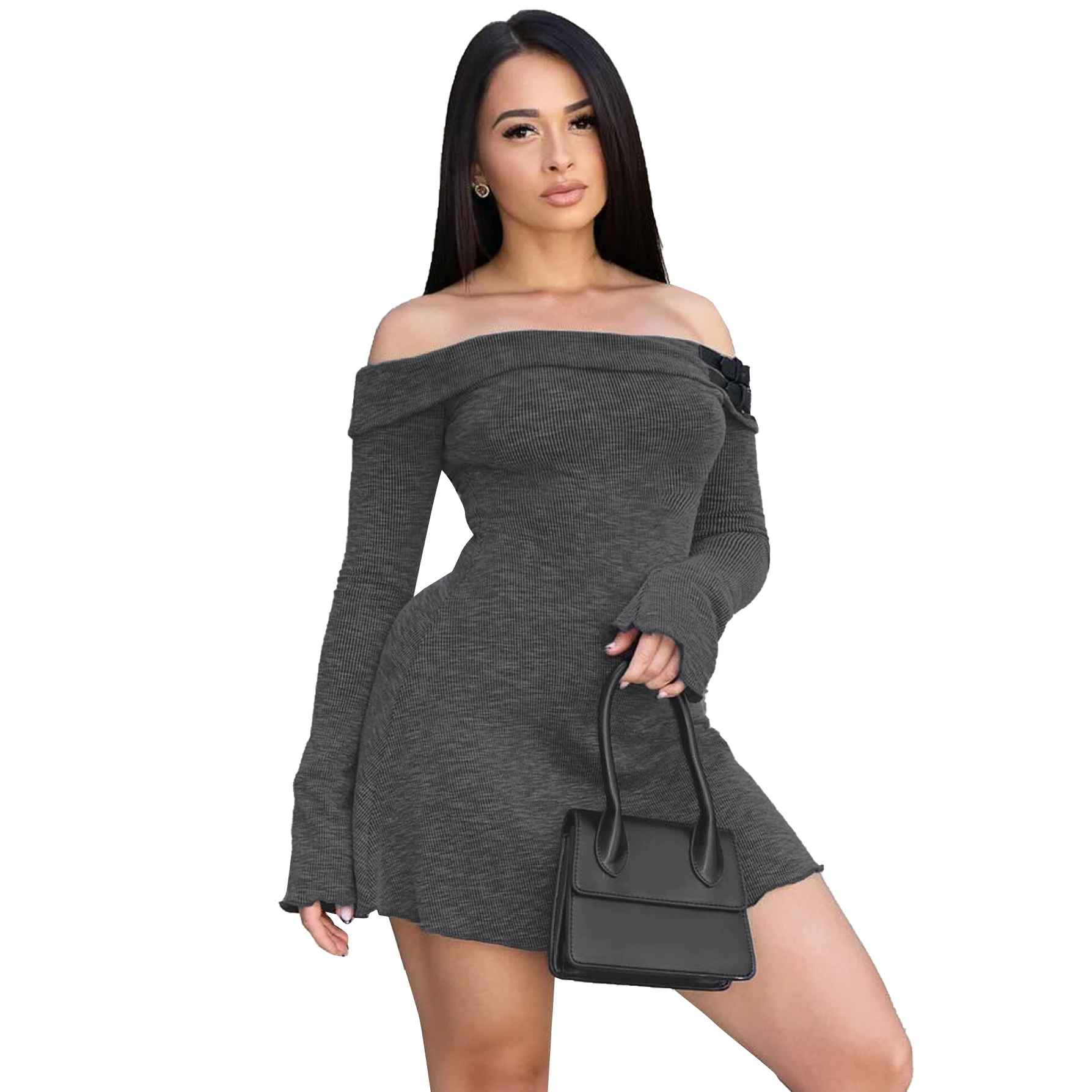 Ribbed Solid Slash Neck Long Sleeve Buttons Sexy Bodycon Mini Prom Dress Fall Women Y2K Clothes Evening Party Festival