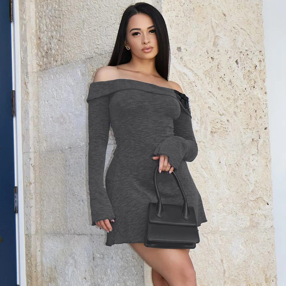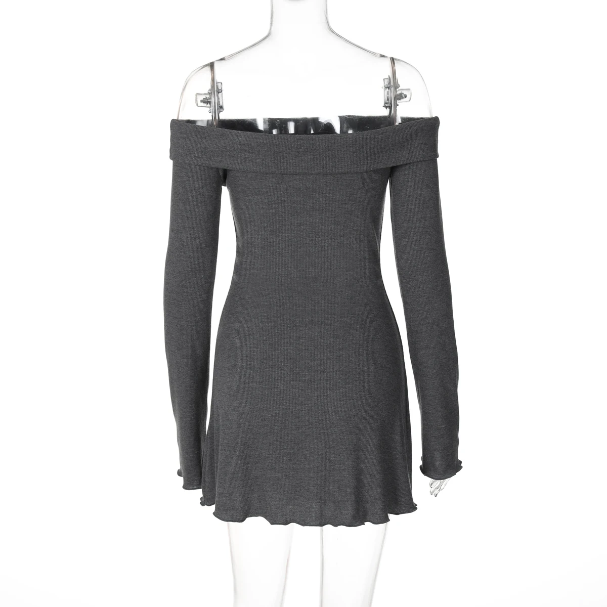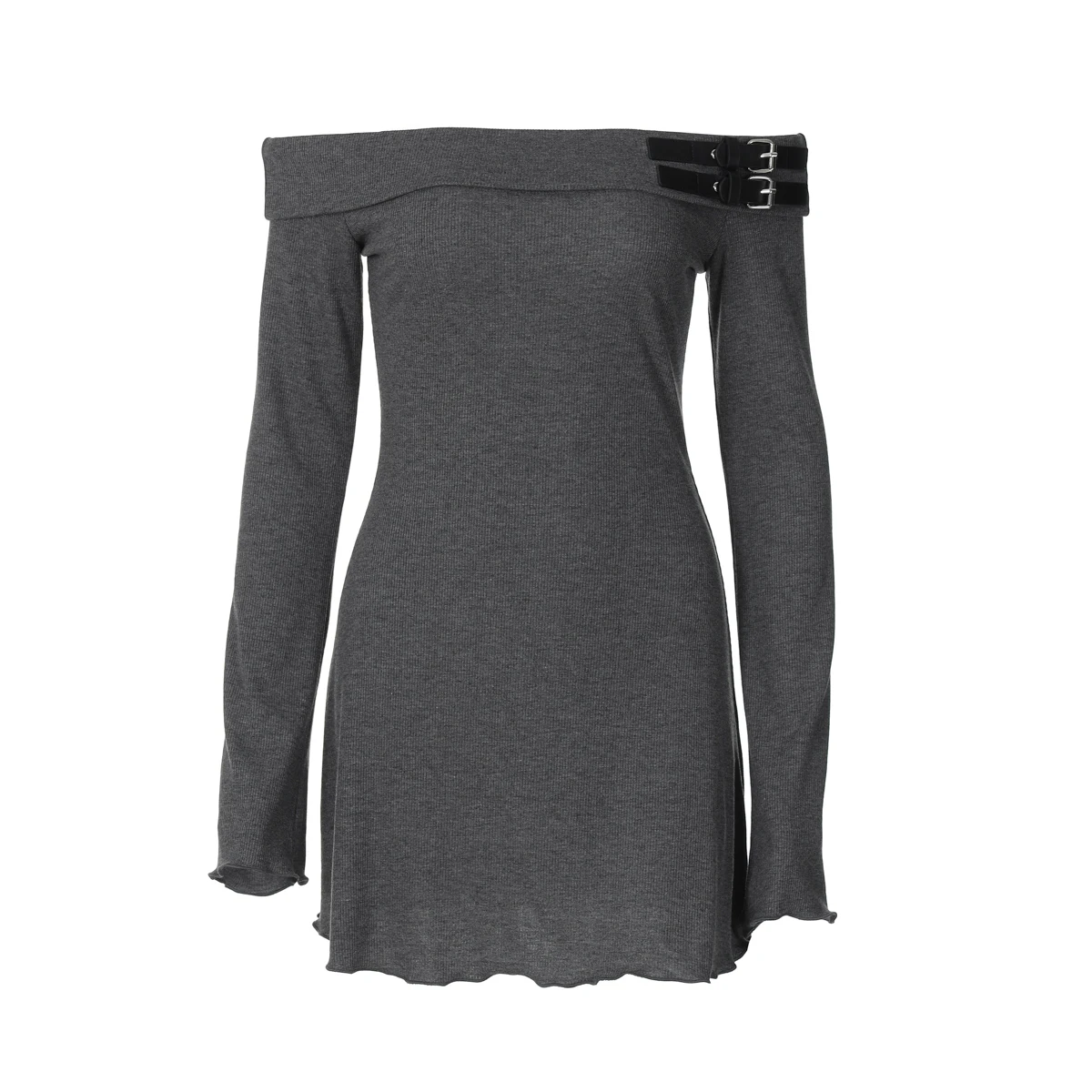 Ribbed Solid Slash Neck Long Sleeve Buttons Sexy Bodycon Mini Prom Dress Fall Women Y2K Clothes Evening Party Festival