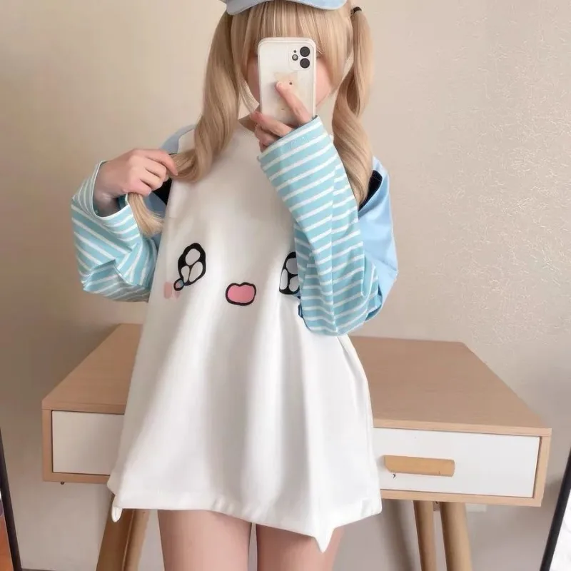 Ropa Mujer T Shirts for Women Fake Two Tees Y2k Tops Japanese Camisetas O-neck Long Sleeve Contrast Color Striped Tshirts