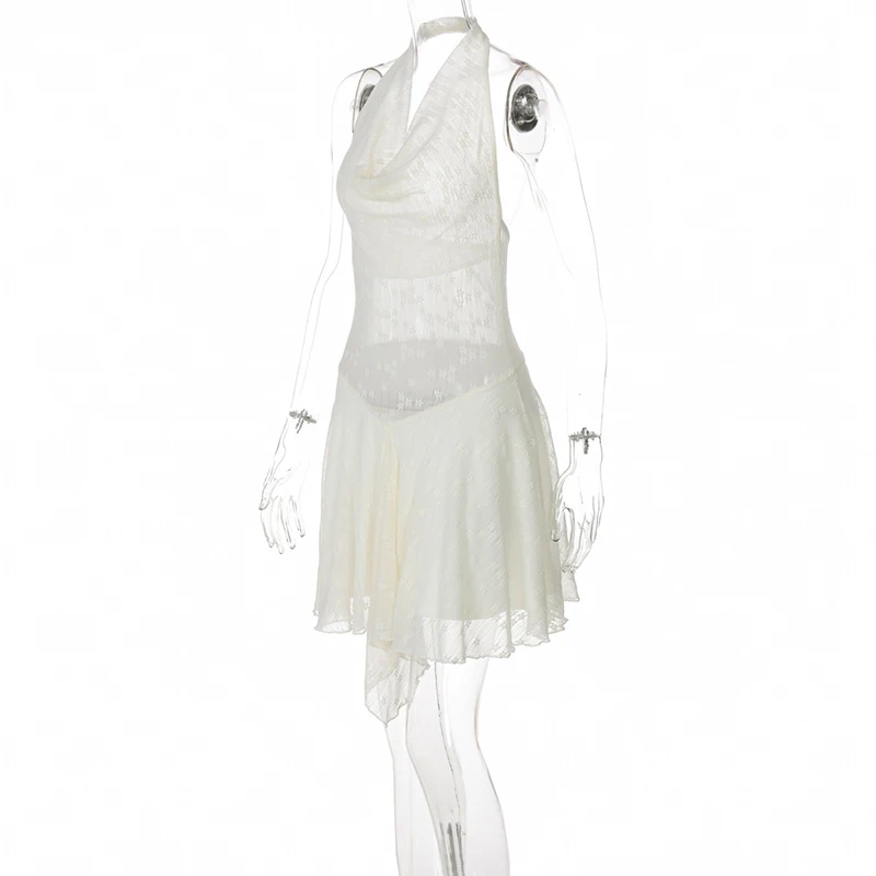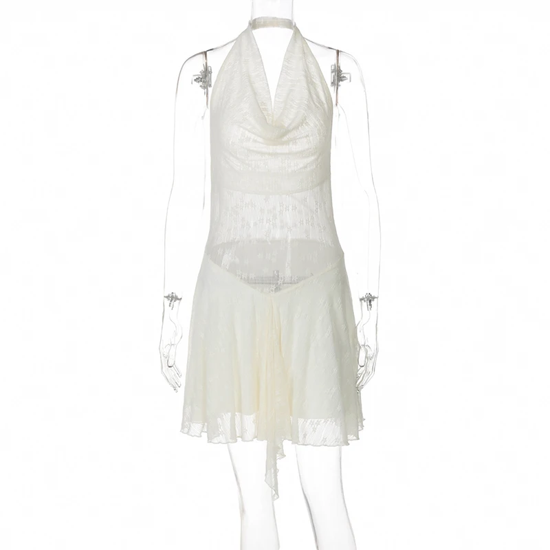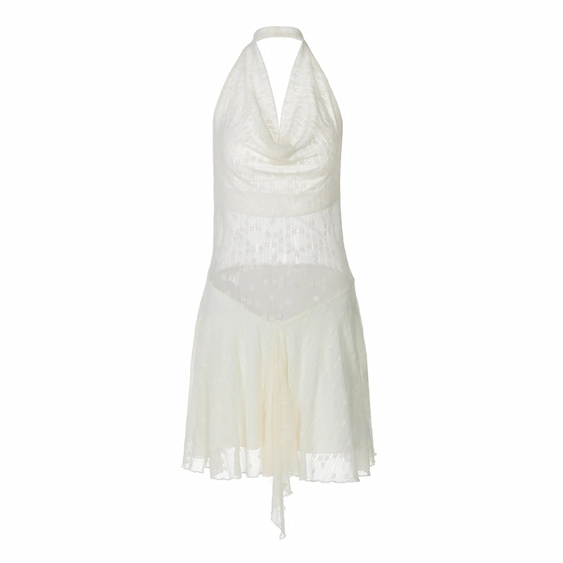 See Through Lace Halter Sexy Mini Dress Women Robe Halter Deep V Neck Backless Draped Ruffled Club Party Beach Dress
