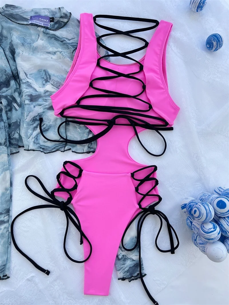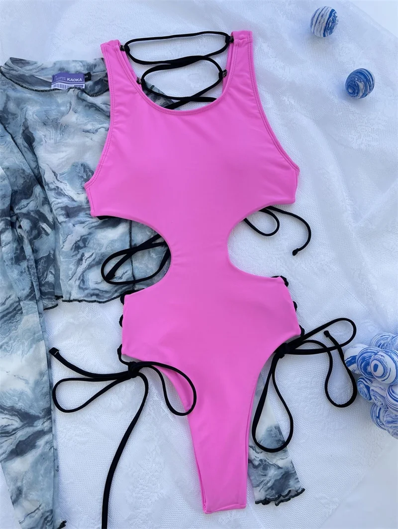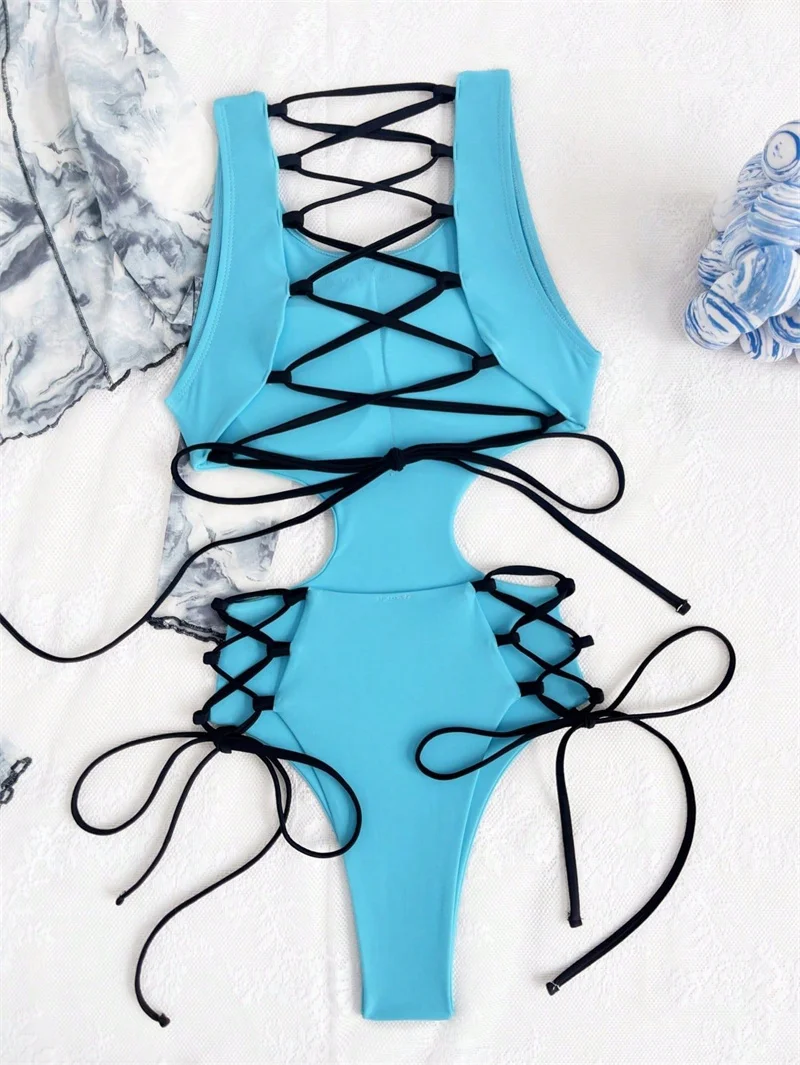 Sexy Cut Out Lace Up Strappy One Piece Swimsuit 2024 Swimwear for Women Drawstring Bathing Suit High Waist Monokini