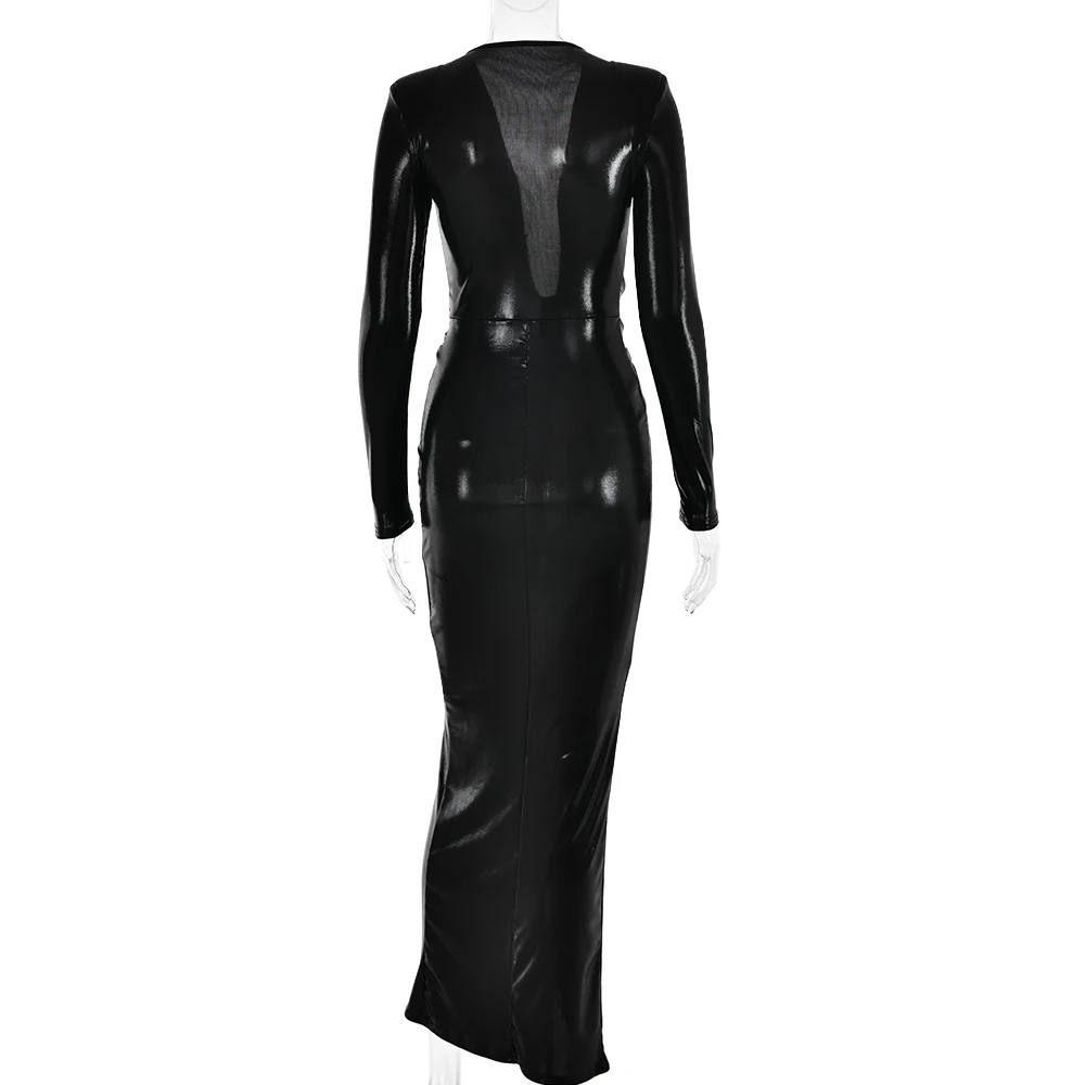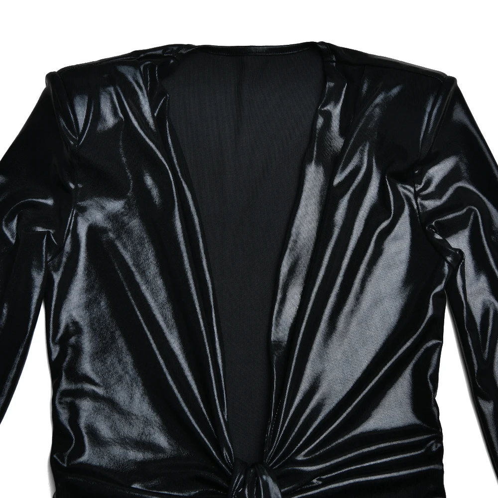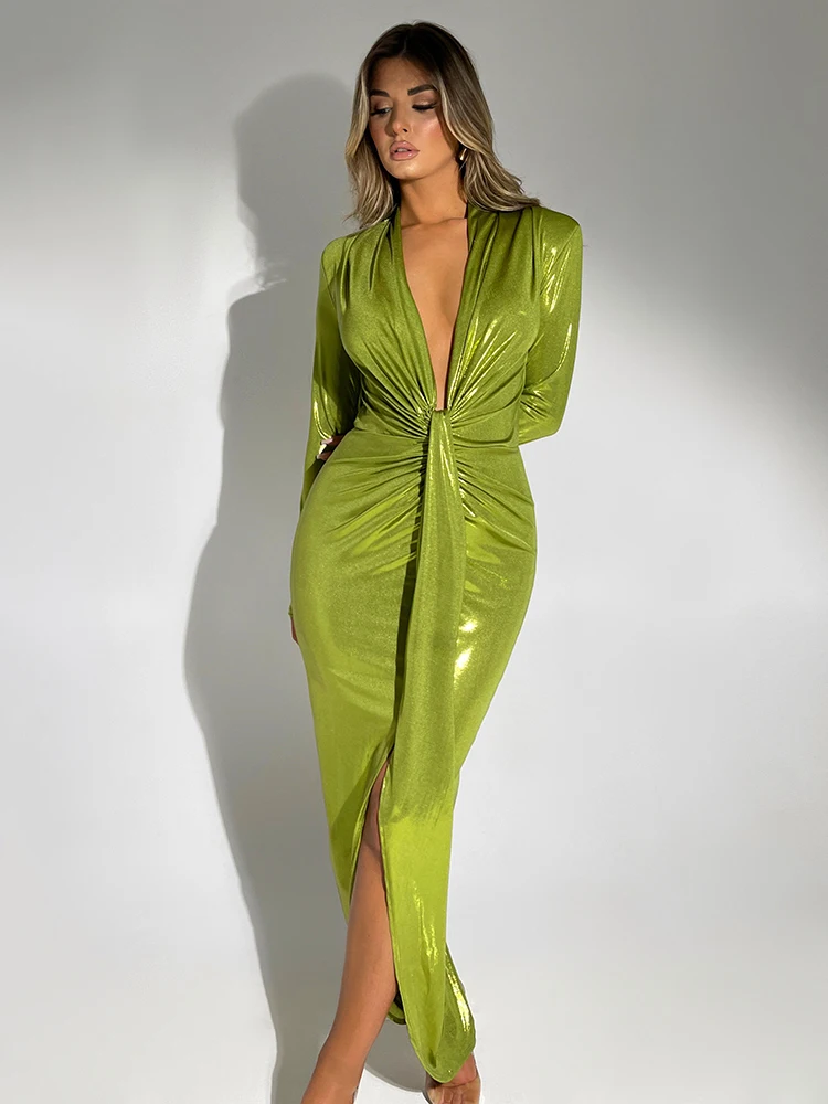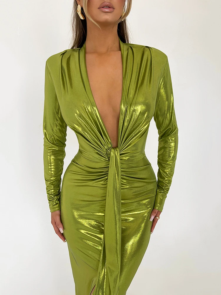 Sexy Deep V Long Sleeve Lace Up Pleated Dress For Women Bodycon Split Metal Color Winter Party Club Evening Vestidos