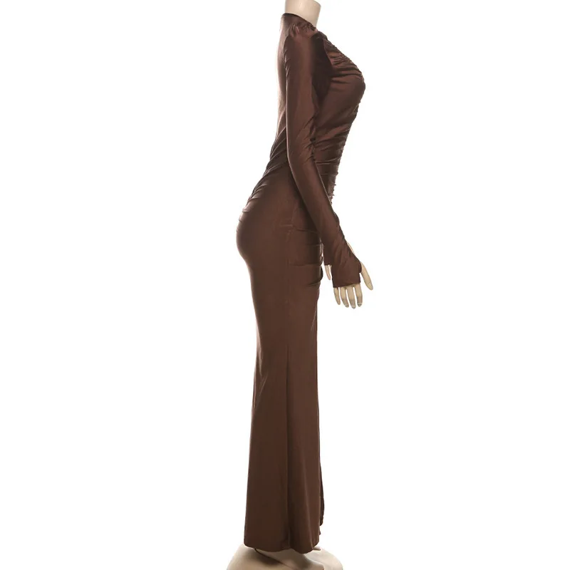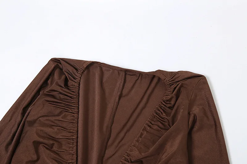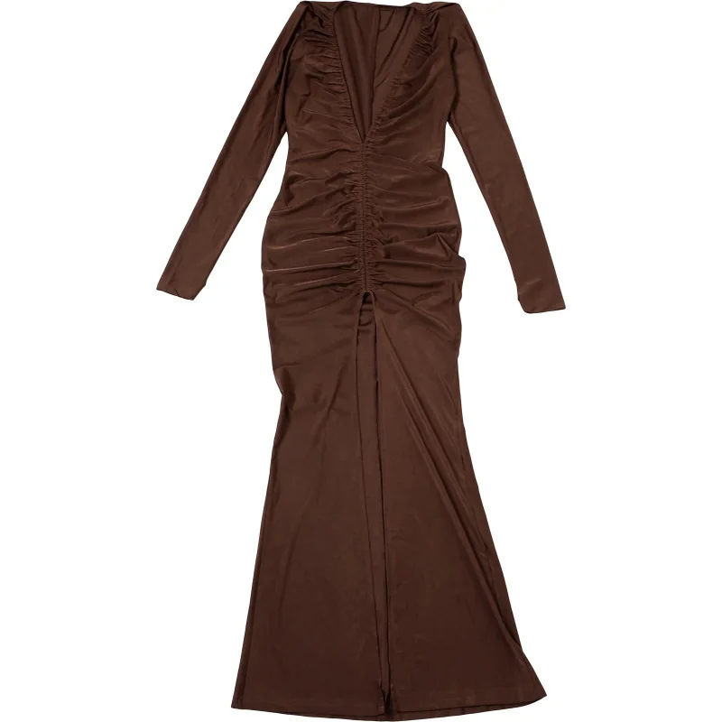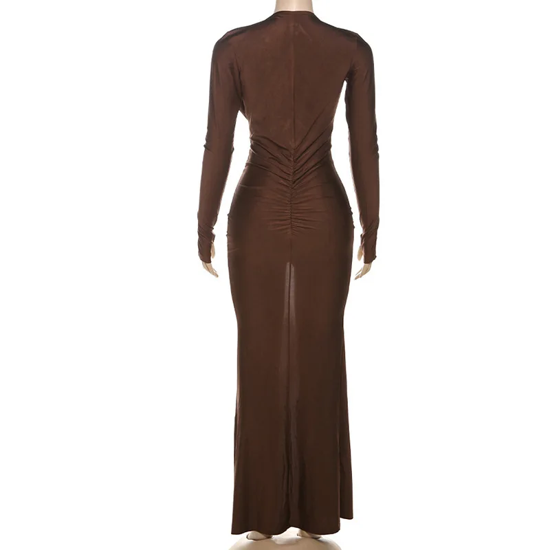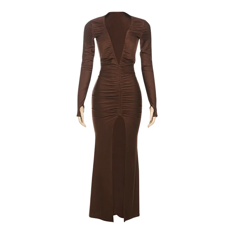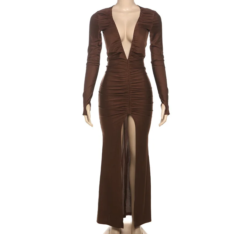 Sexy Deep V-long Sleeved Bodycon Party Club Evening Dress For Women Spring 2025 New High Slit Slim Fit Pleated Vestido