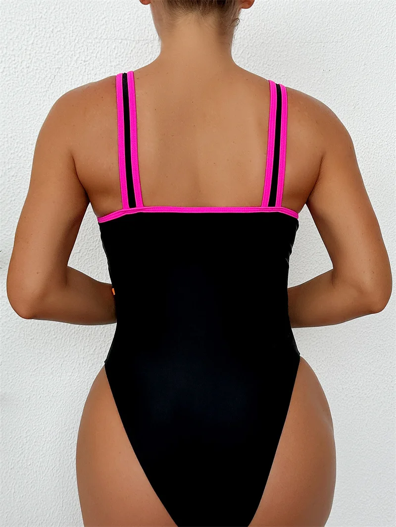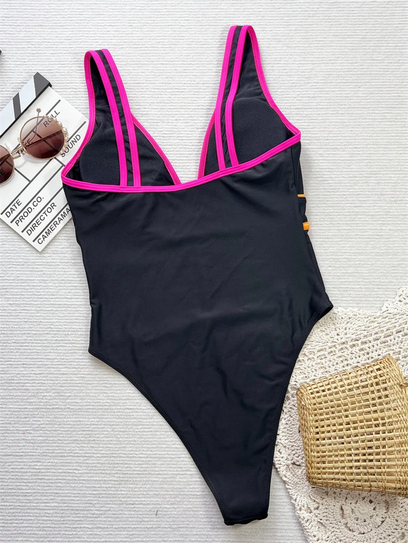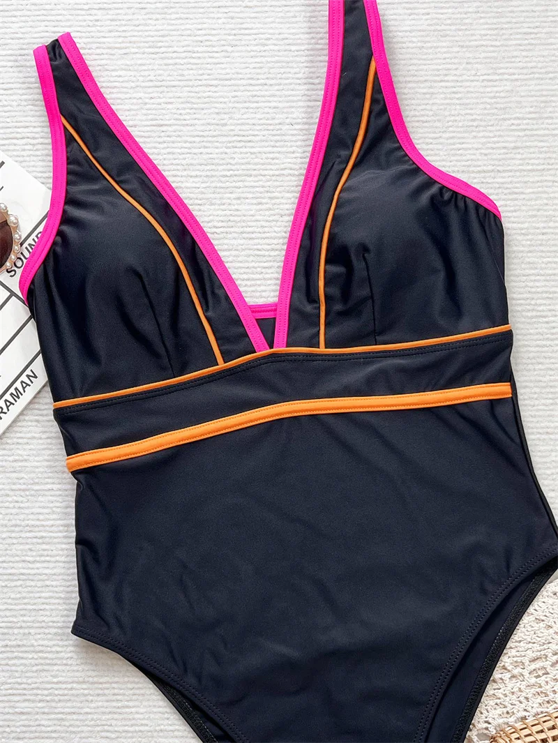 Sexy Deep V Neck Patchwork One Piece Swimsuit 2025 Swimwear for Women Splicing Bathing Suit High Waist Monokini