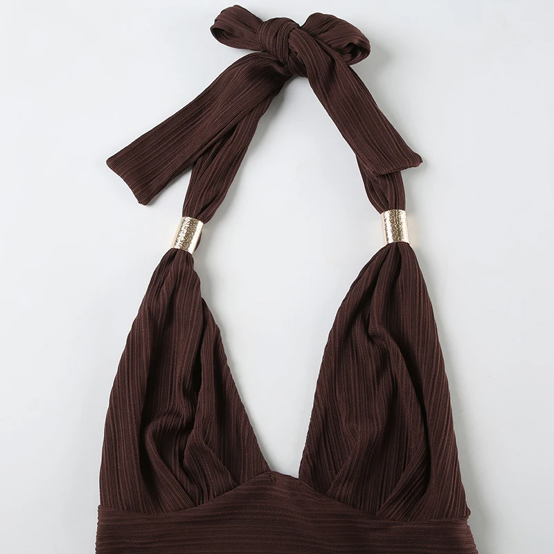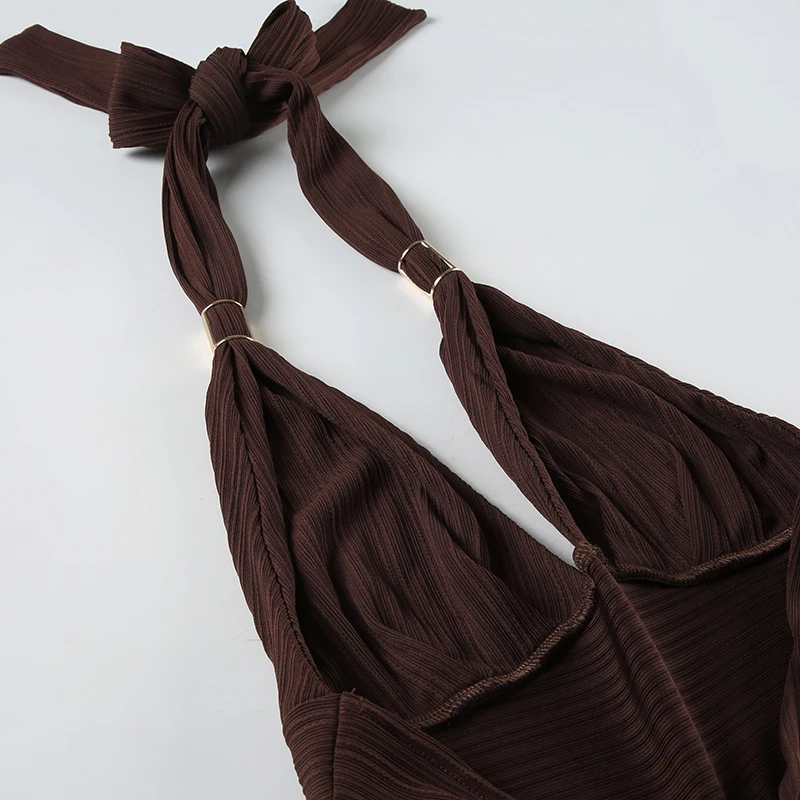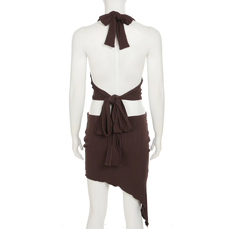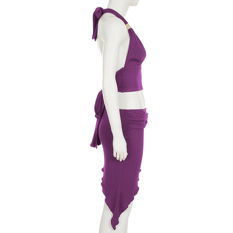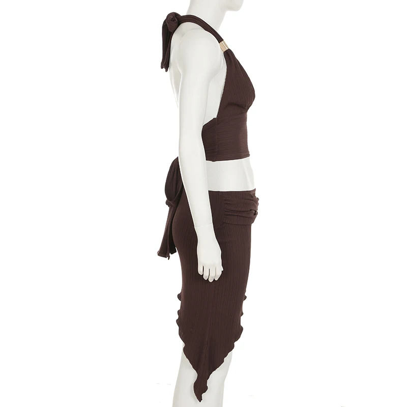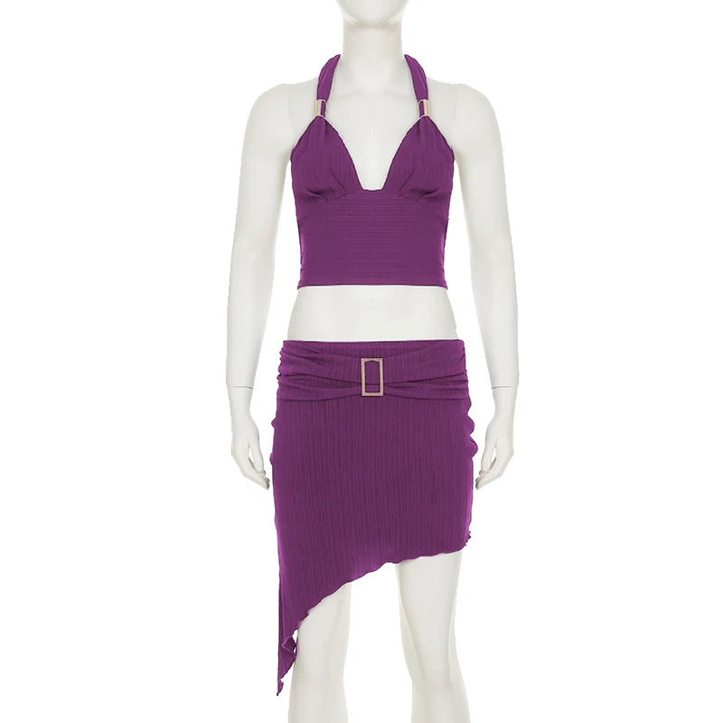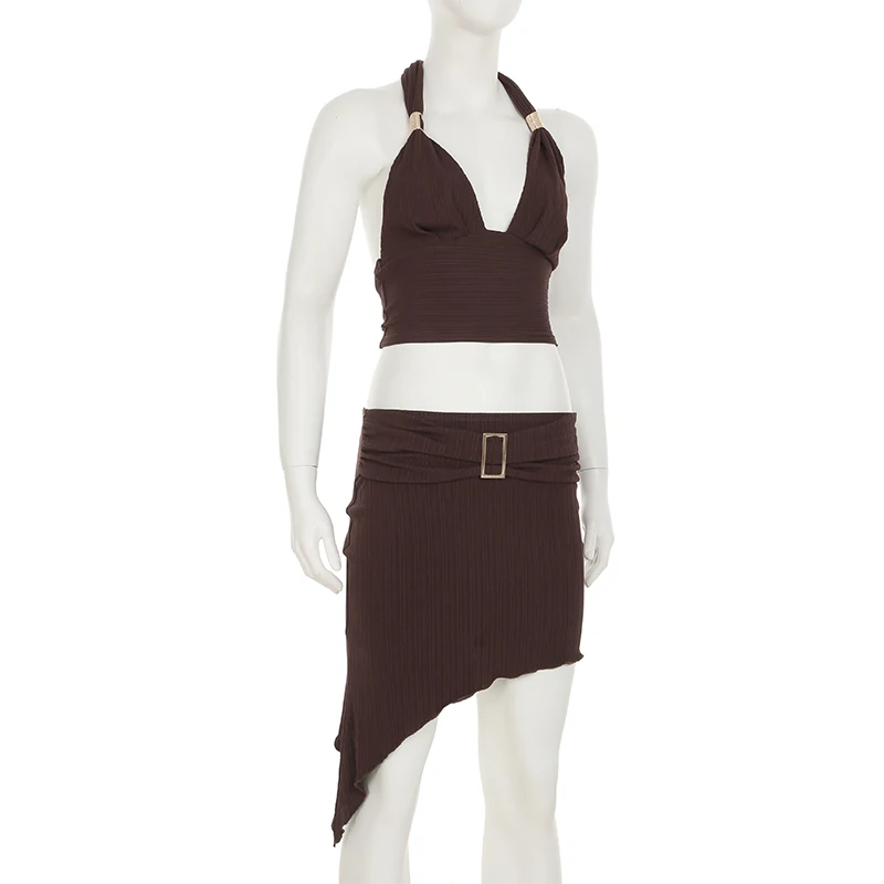 Sexy Holiday Style Two Pieces Set Women Summer Cropped Halter Top+Asymmetric Hem With Metal Ring Button Skirt Outfits
