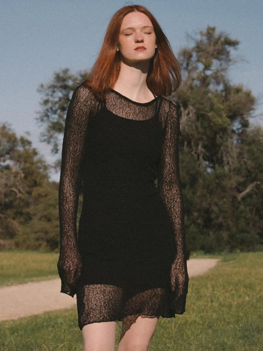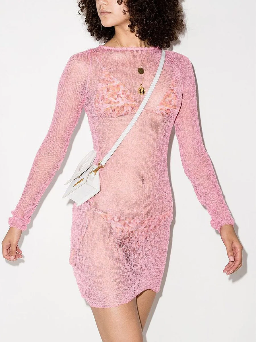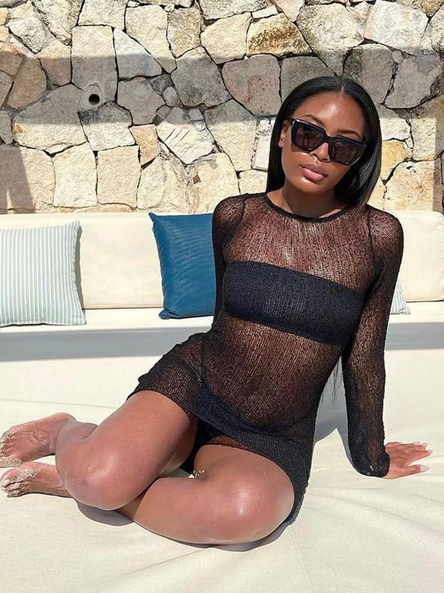 Sexy Hollow Out Perspective Tight Long Sleeve Dress Women Cover Up Sunscreen Beach Mini Dress Female Fashion Party Club