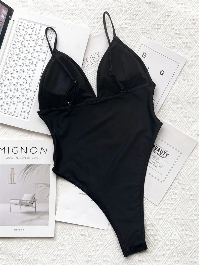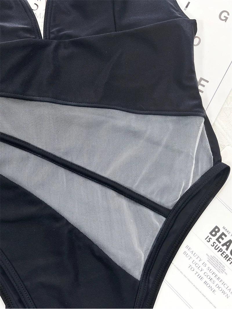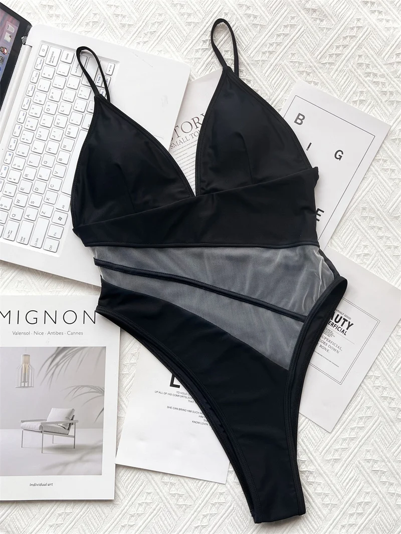 Sexy Mesh V Neck High Cut Women Swimwear One Piece Swimsuit High Waist Female Monokini Padded Bathing Suit