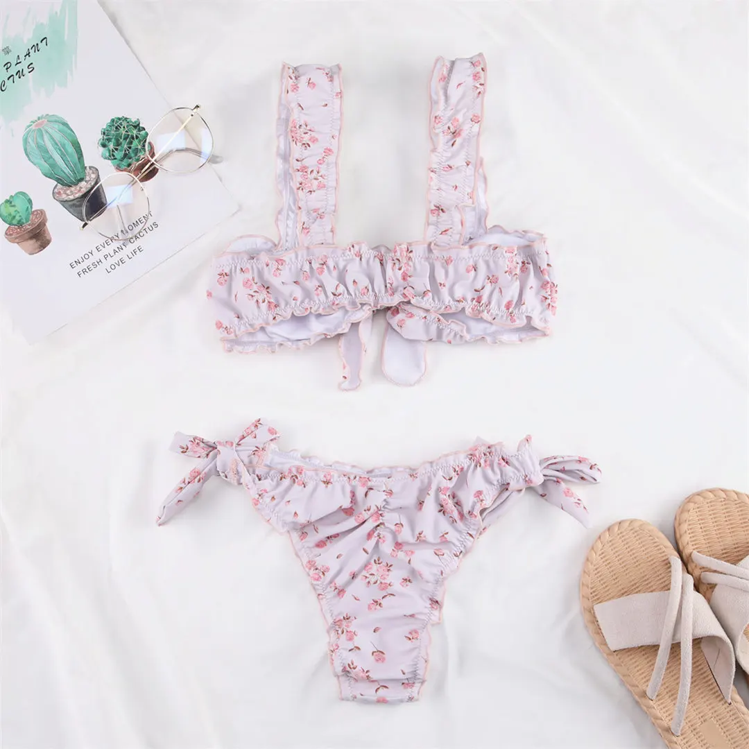 Sexy Pink Flower Knotted Bikini Female Swimsuit Women Swimwear Two-pieces Bikini set Bather Bathing Suit Swim Lady V2684P