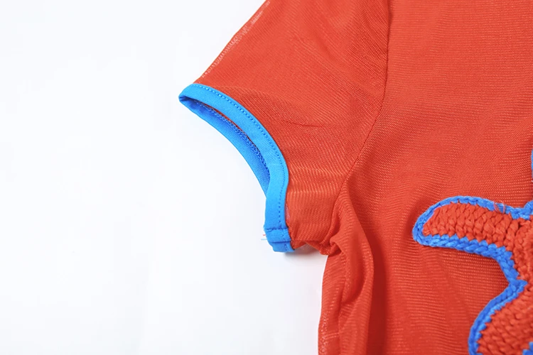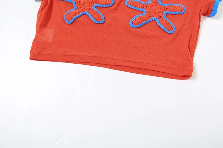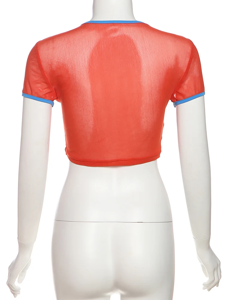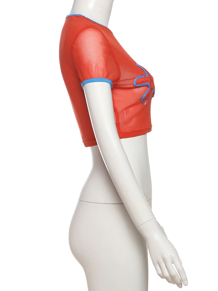 Sexy See Through Crop Tops Appliques Women Summer Beach Trend Skinny Stretch Contrast O-Neck Sexy Wild Shorts Sleeve Tees