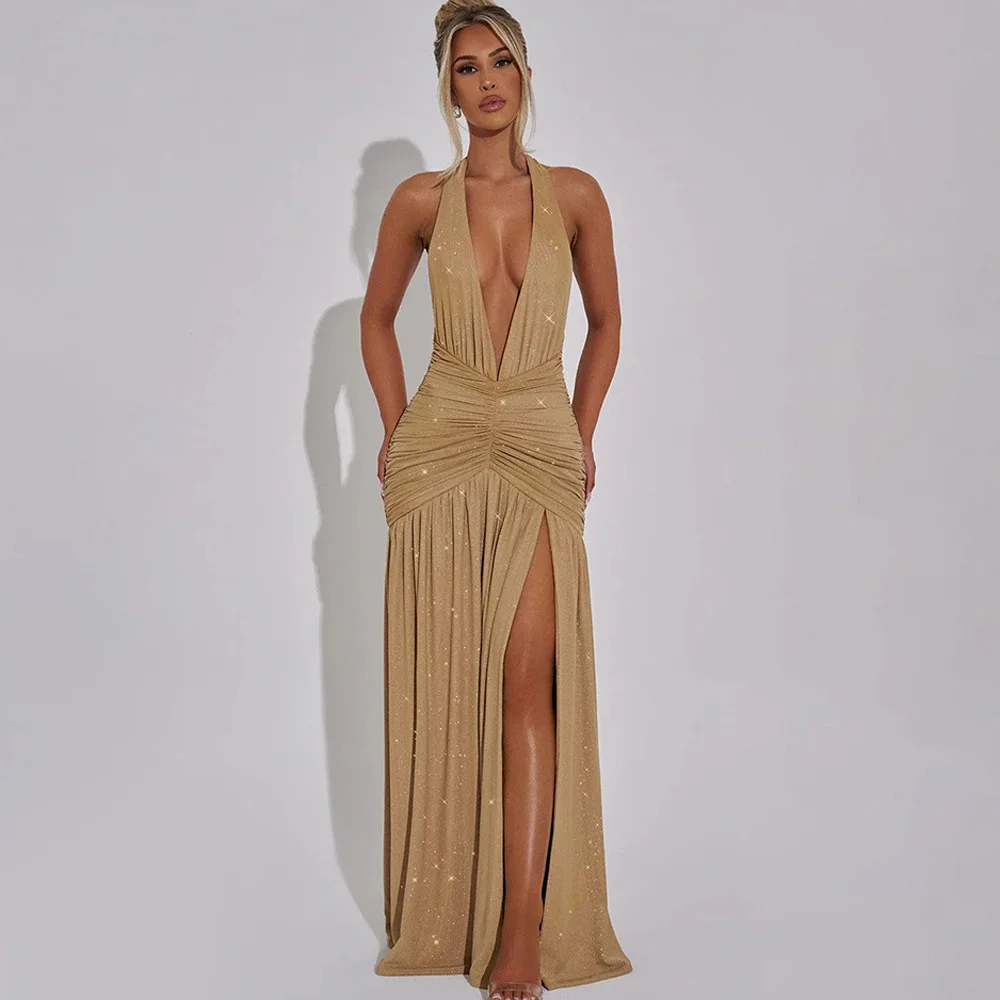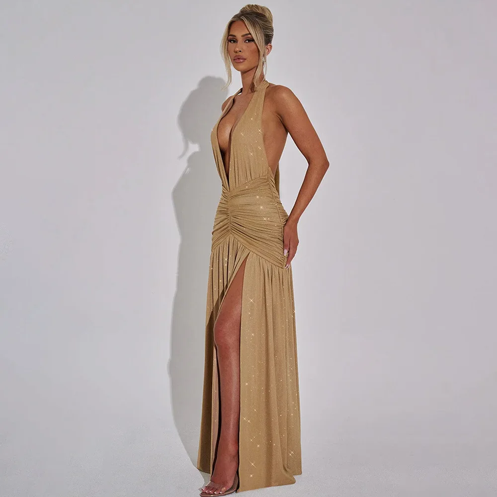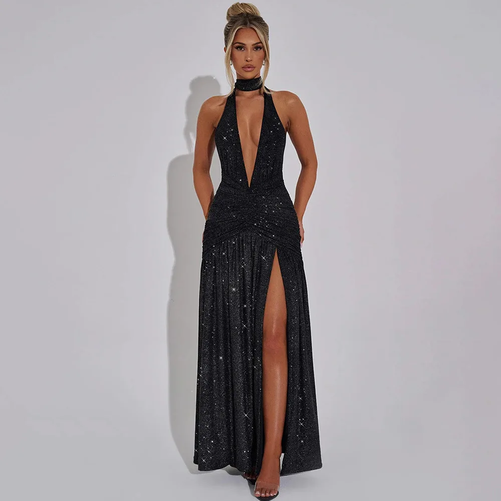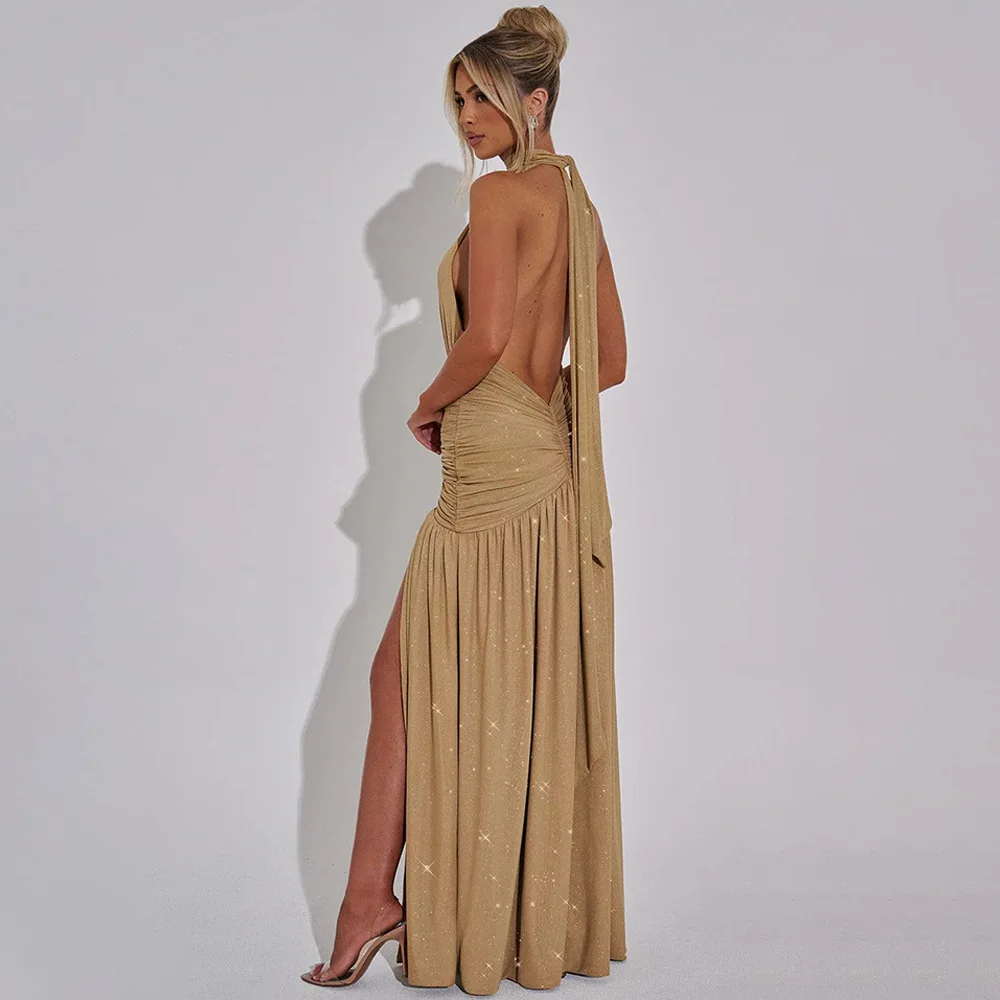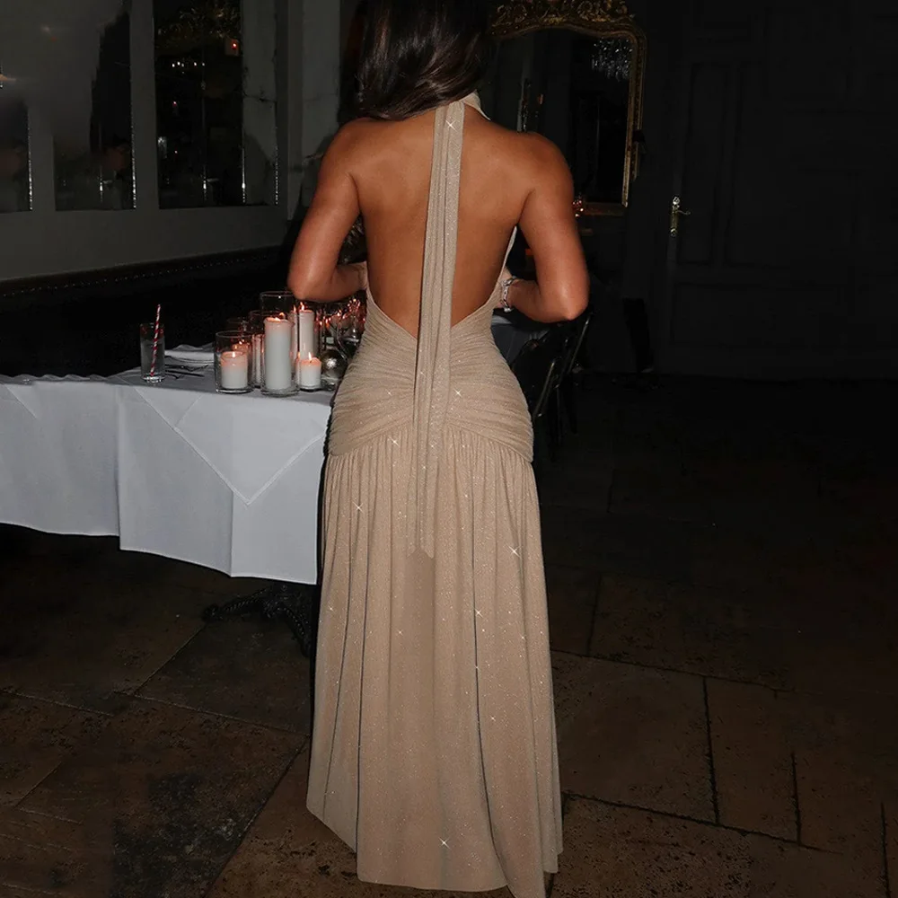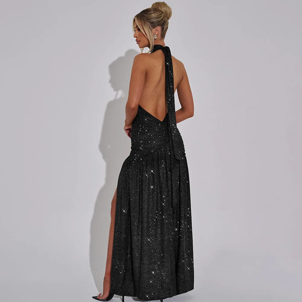 Sexy Sleeveless Backless Shiny Silver Silk Strap Dress For Women Spring 2025 Vestidos Slit Slim Party Evening Dress