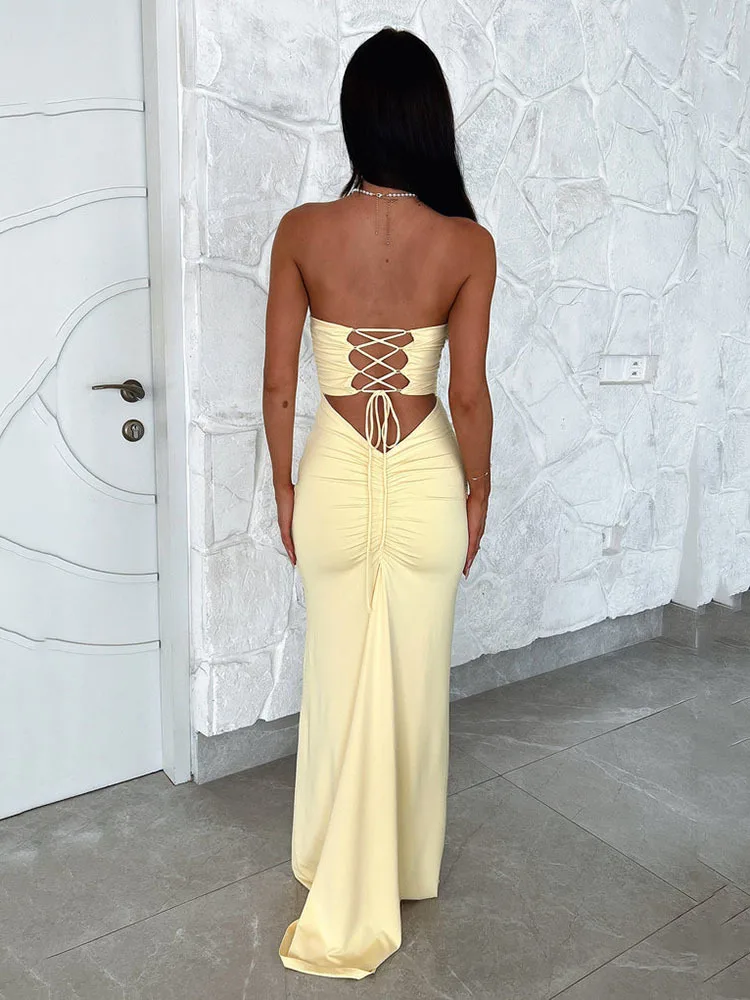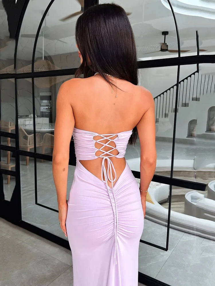 Sexy Sleeveless Bodycon Hollow Out Dress For Women Lace Up Pleats Slim Maxi Female Vestidos Elegant Party Evening Dress